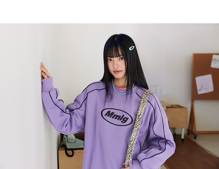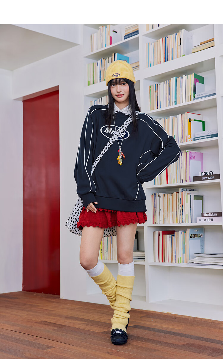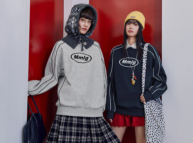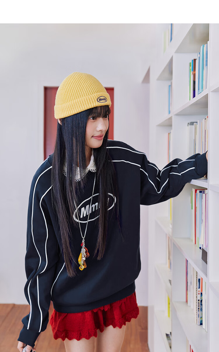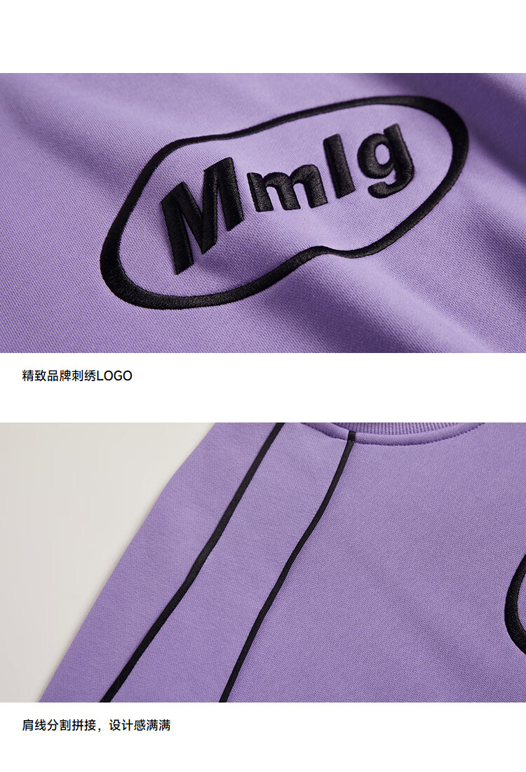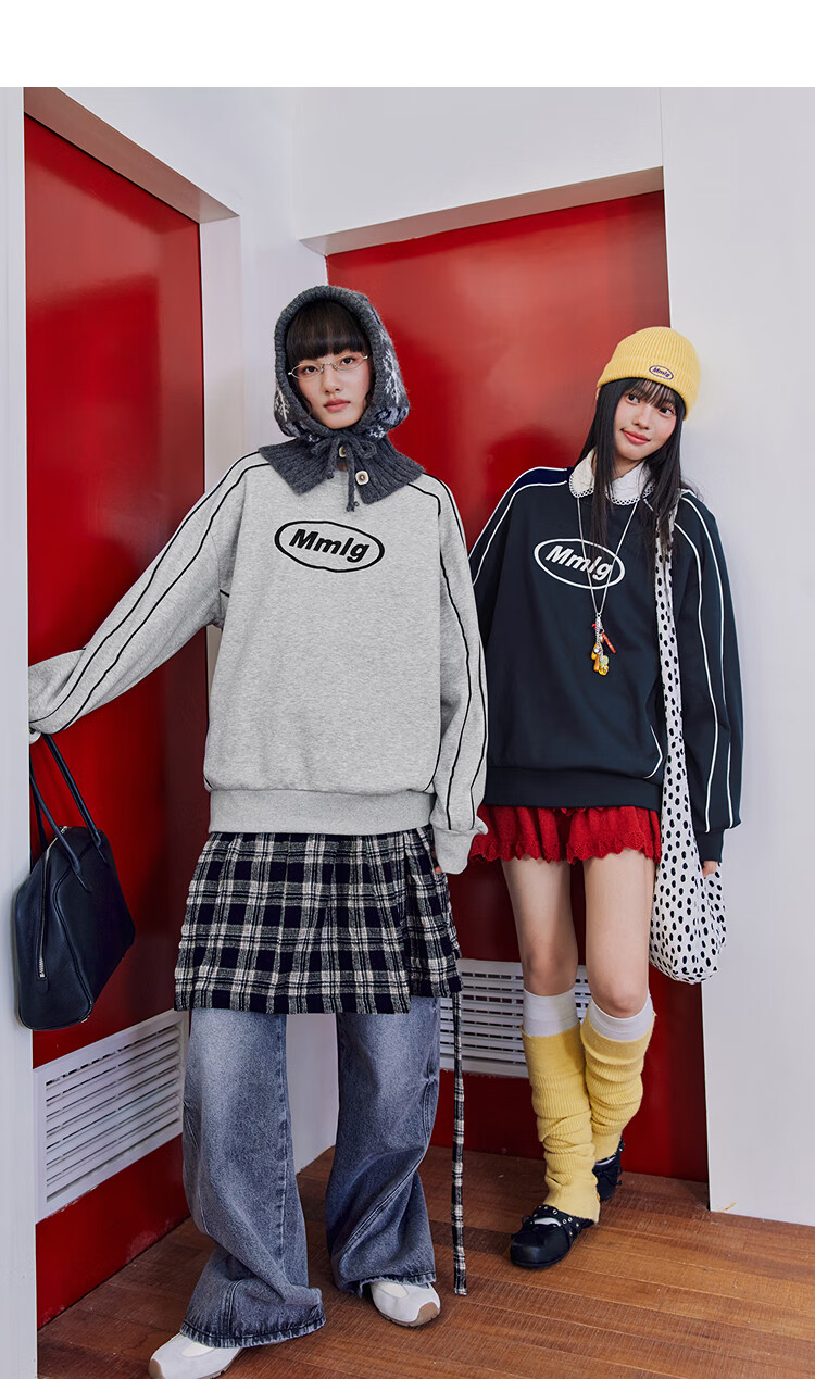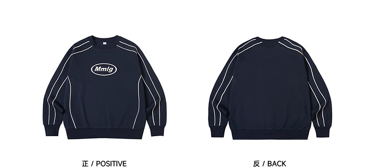 Mmlg velvet round neck sweatshirt for women and men 2025 new autumn and winter fashion line stitching embroidered logo couple tops dark blue S
