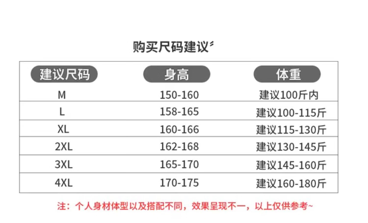 China (cm) 160-165/84-86 165-170 / 88-90 167-172 / 92-96 168-173 / 98-102 170-176 / 106-110