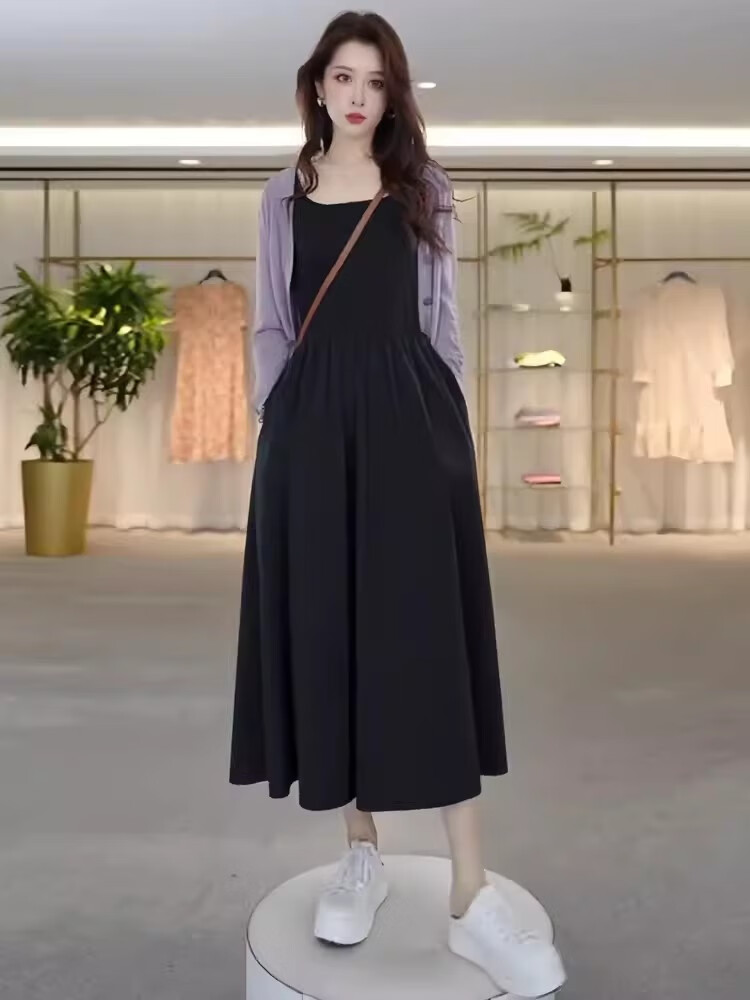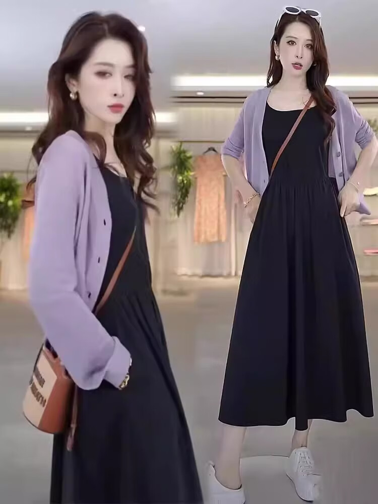 Xin Yimei Dress Women's Suit 2025 Spring and Autumn New Fashion Small Fragrance Style Knitted Overlay Suspender A-Line Skirt Two-piece Set Purple Overlay + Black Skirt L (110-120Jin Jin equals 0.5 kg)