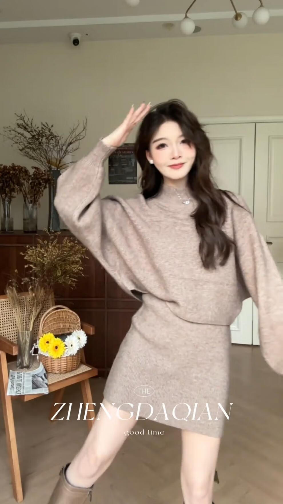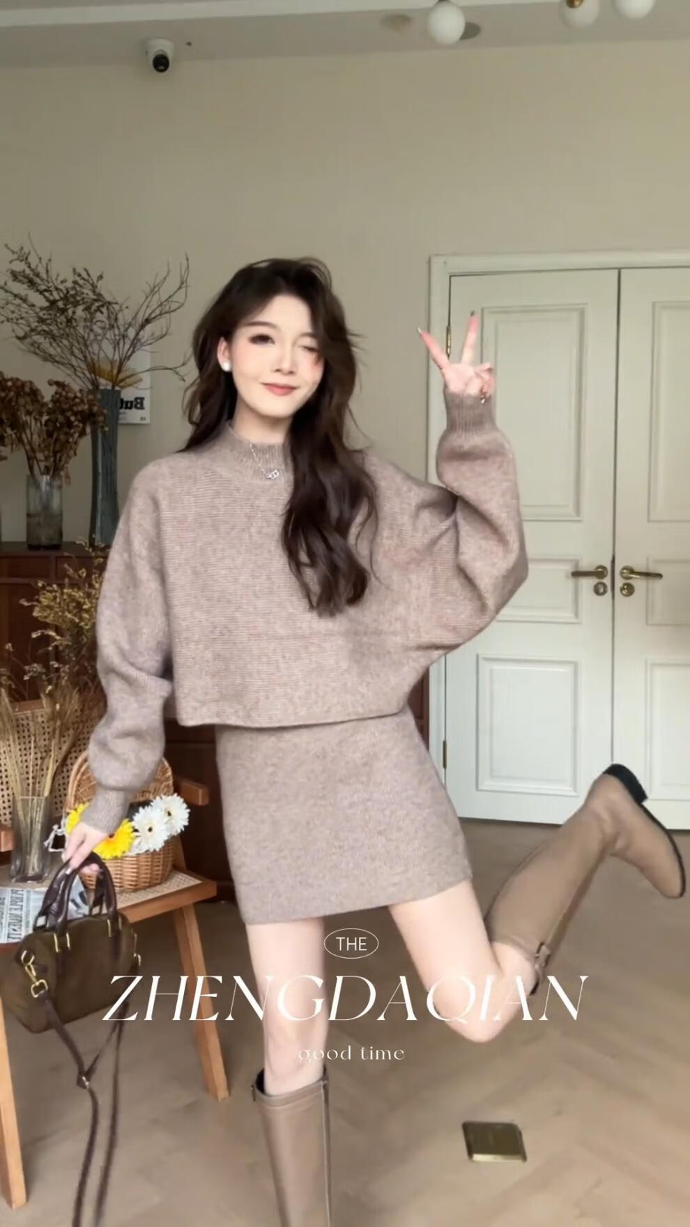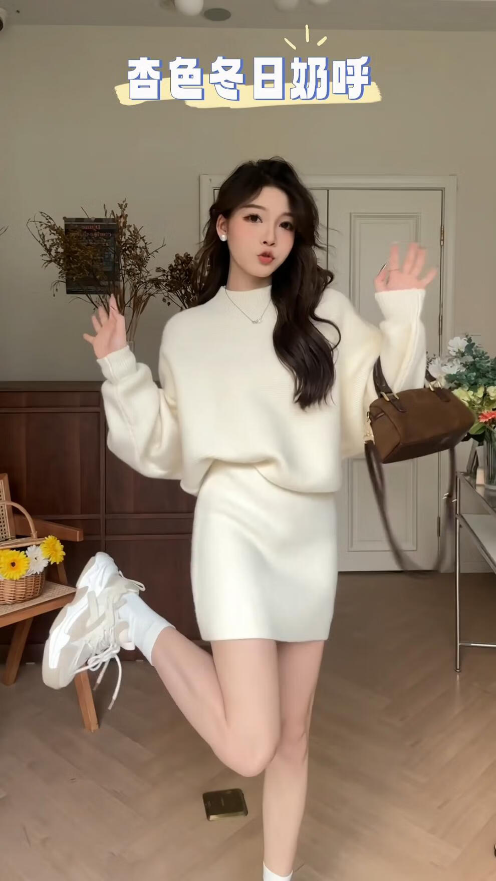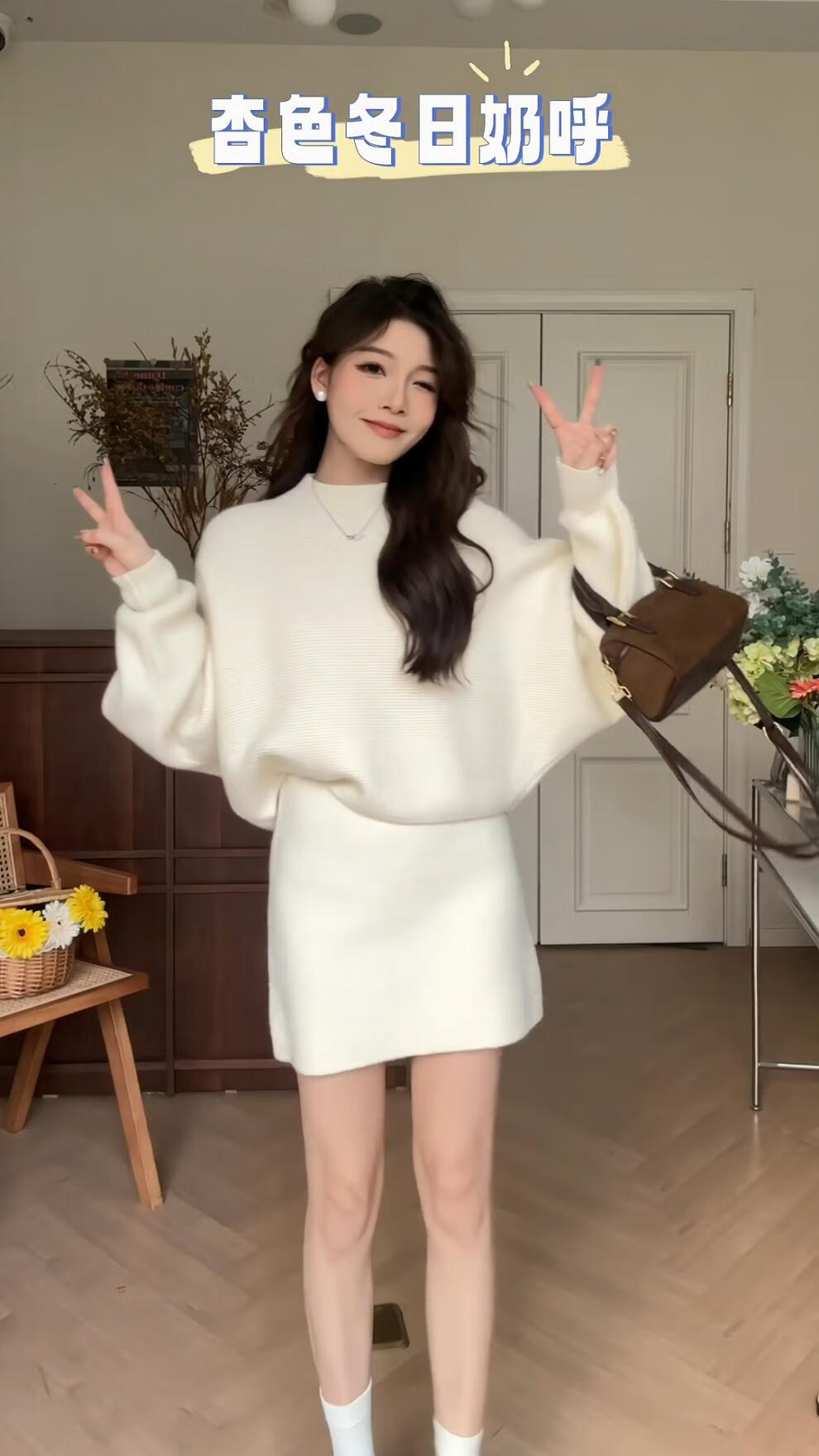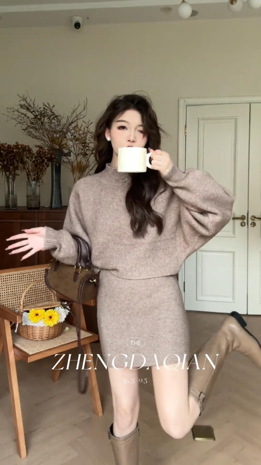 Majiaomei Knitted Dress Women's Suit 2025 Spring and Autumn New Korean Style Versatile Lazy Style Half Turtleneck Sweater Skirt Apricot Suit One Size 80-120Jin Jin is equal to 0.5 kg