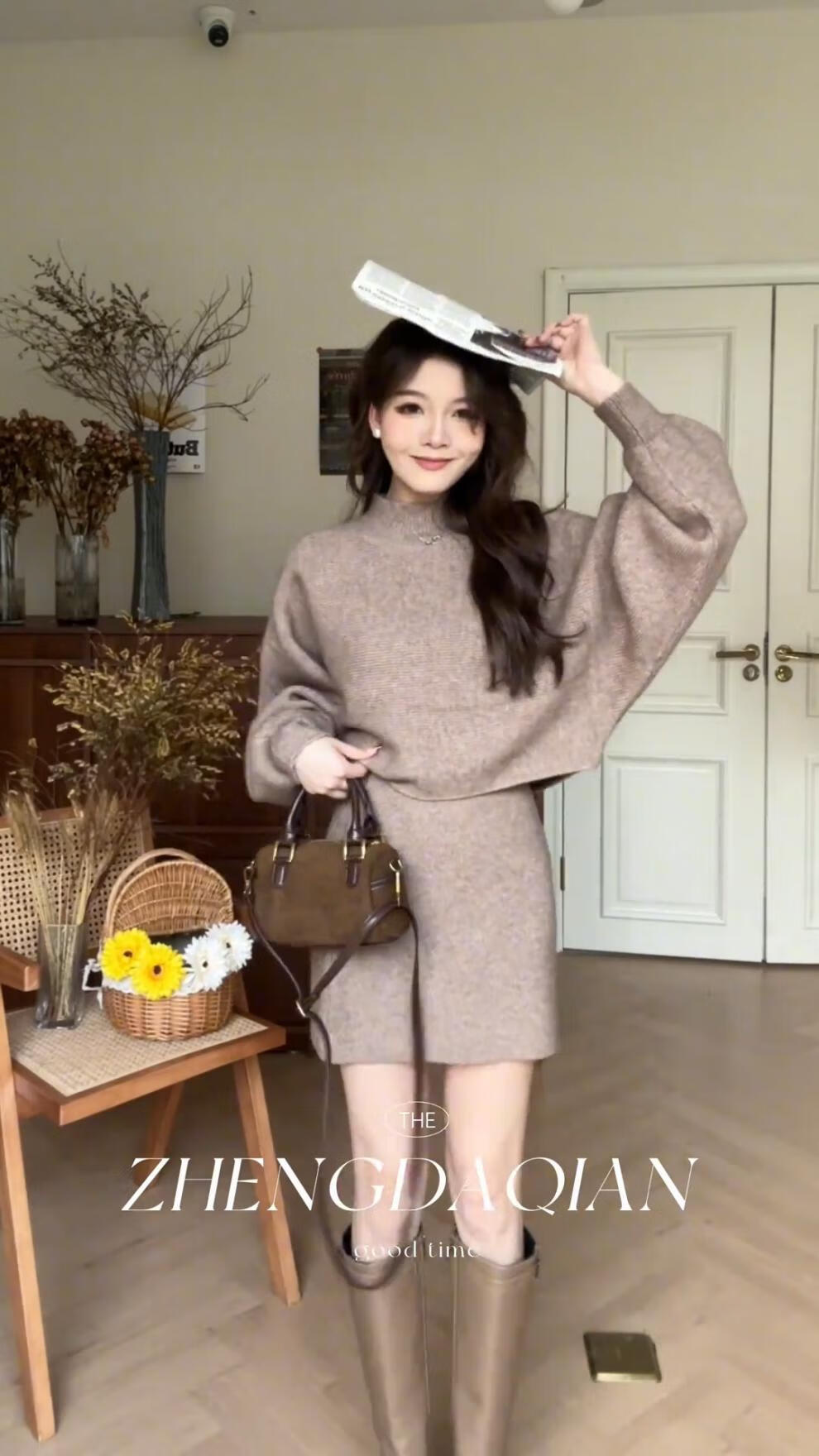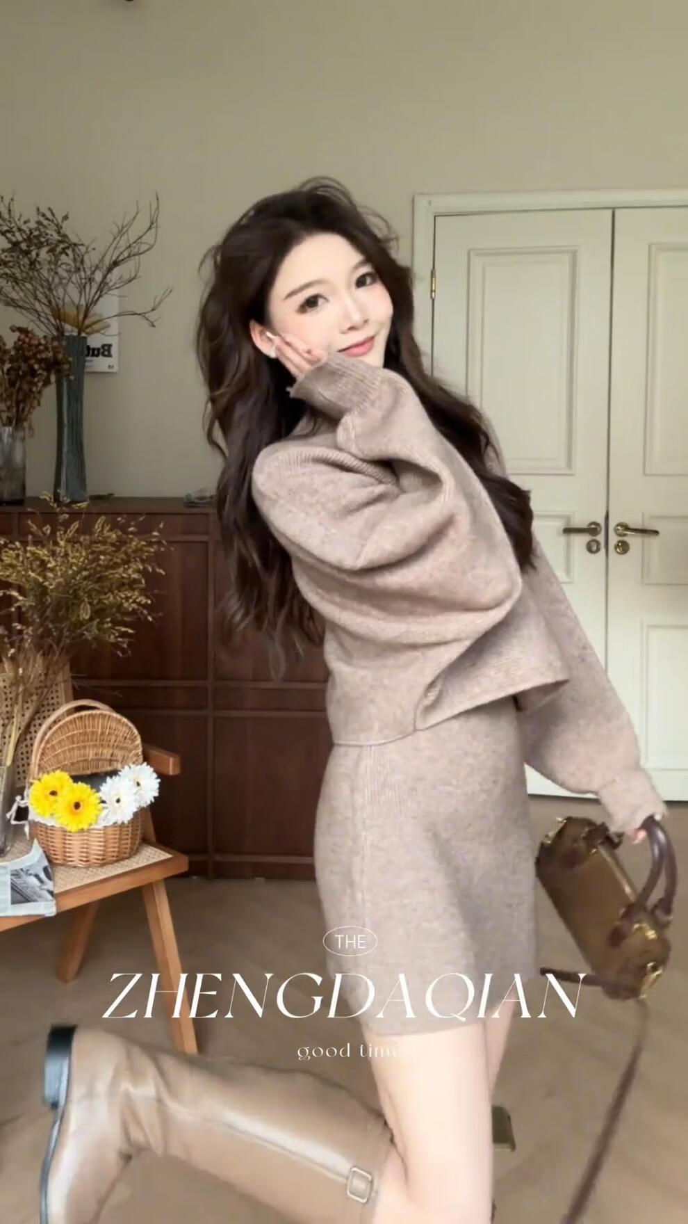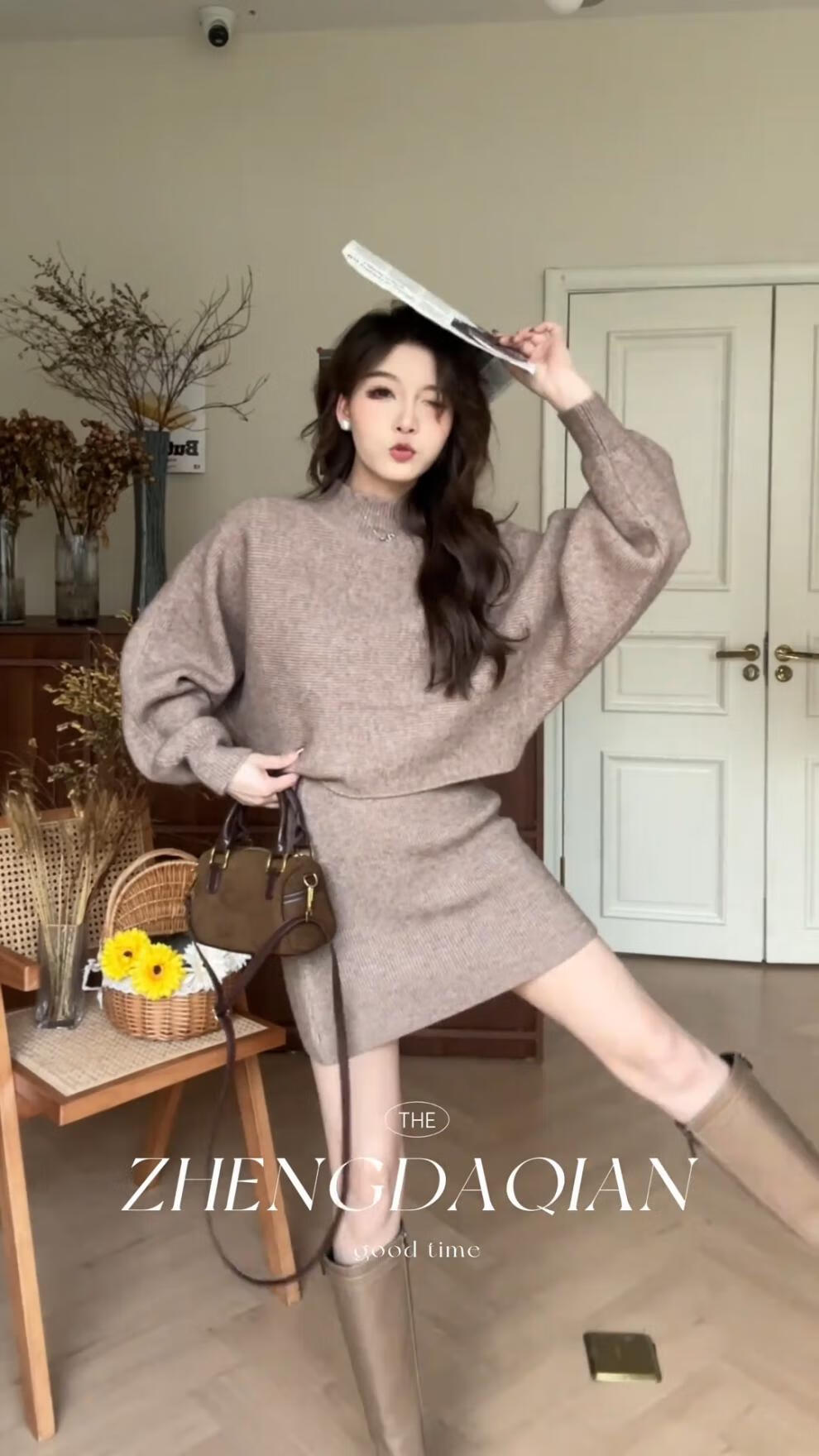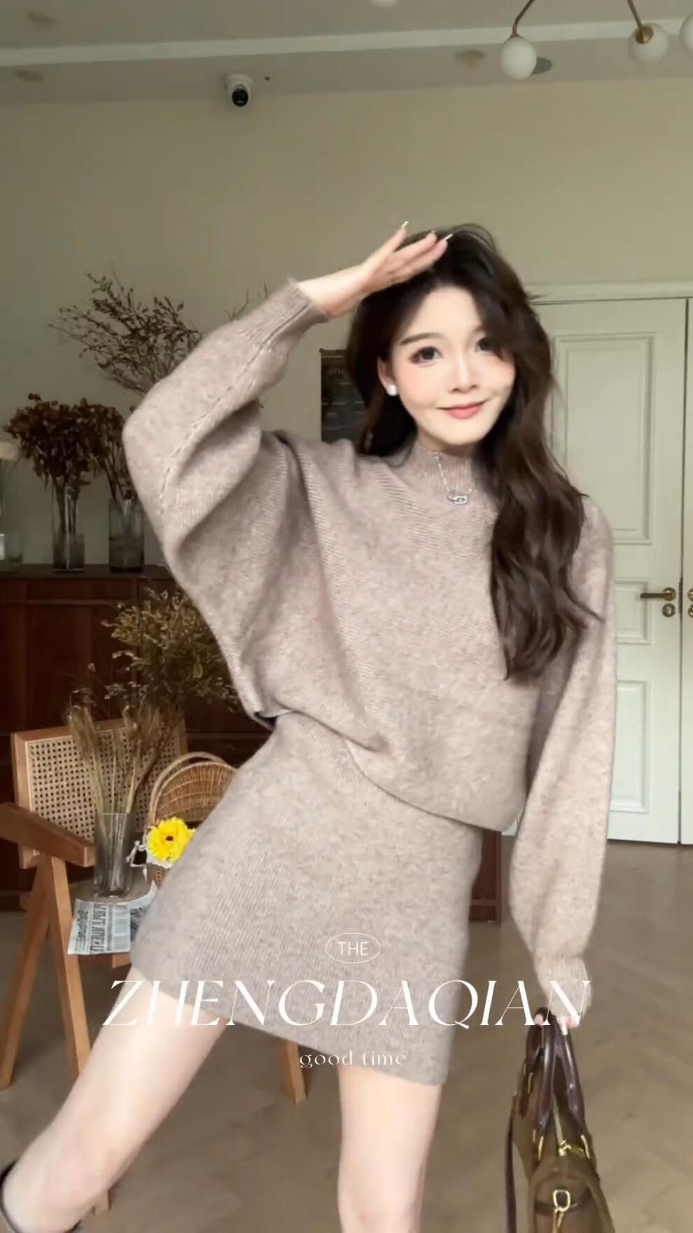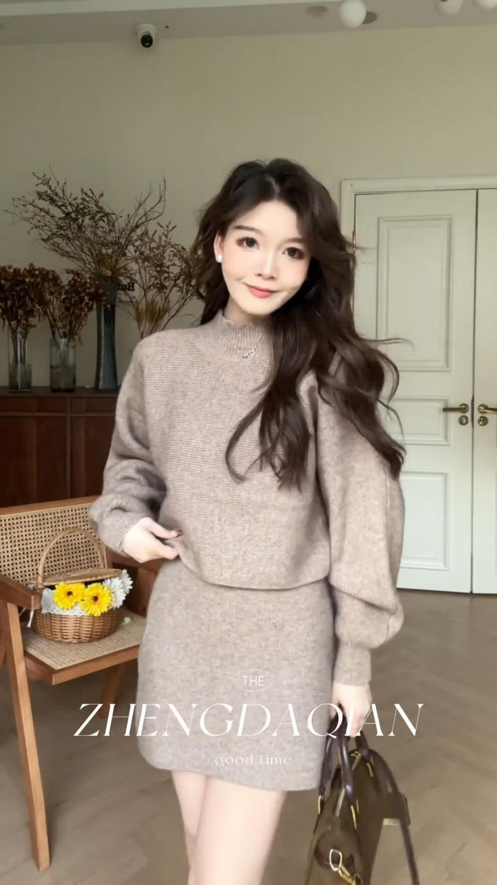 Majiaomei Knitted Dress Women's Suit 2025 Spring and Autumn New Korean Style Versatile Lazy Style Half Turtleneck Sweater Skirt Apricot Suit One Size 80-120Jin Jin is equal to 0.5 kg