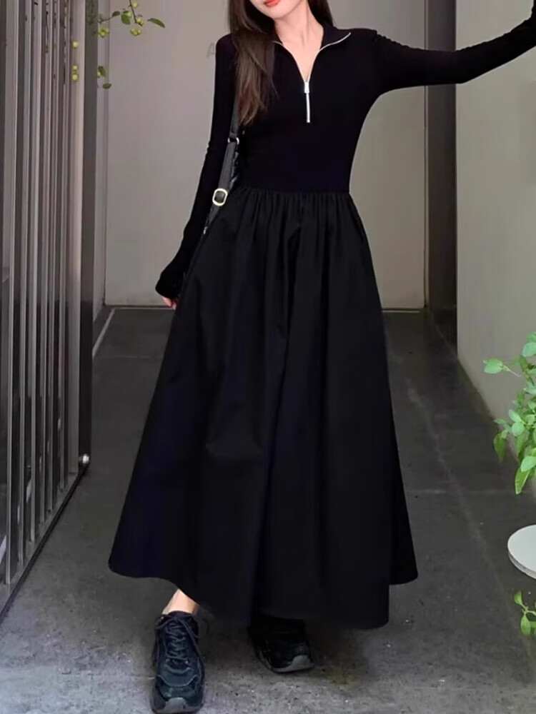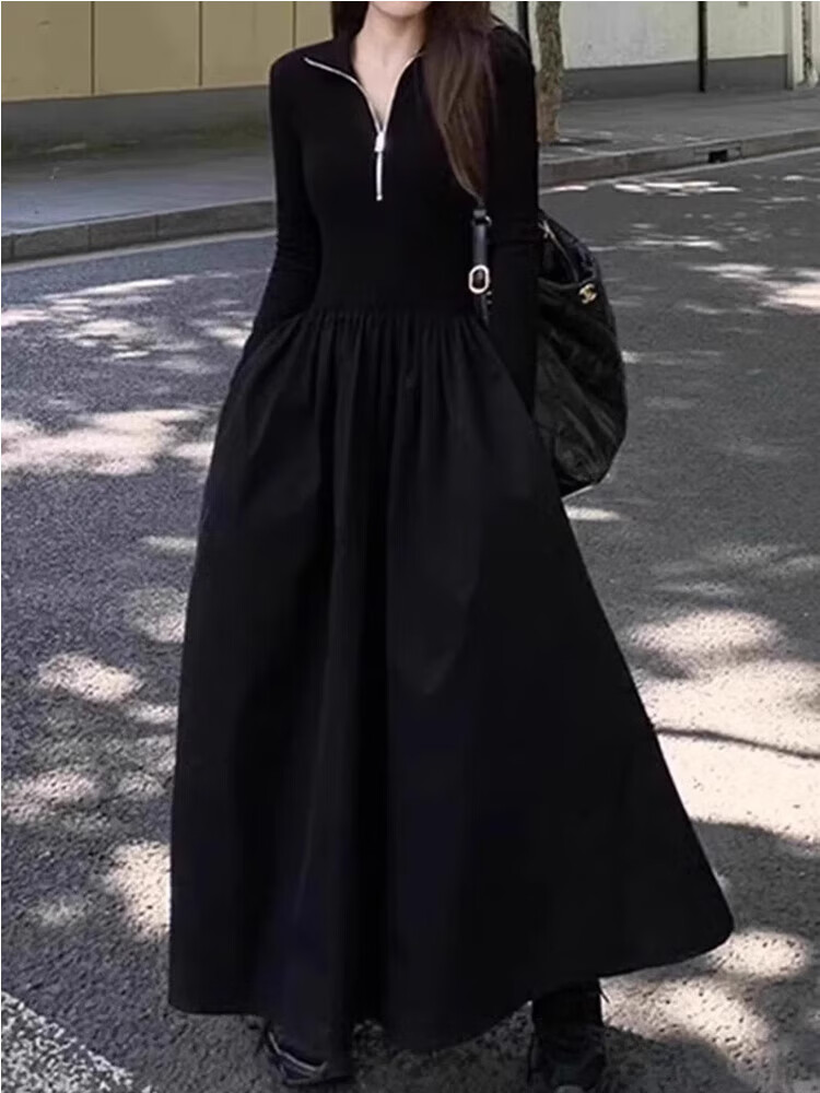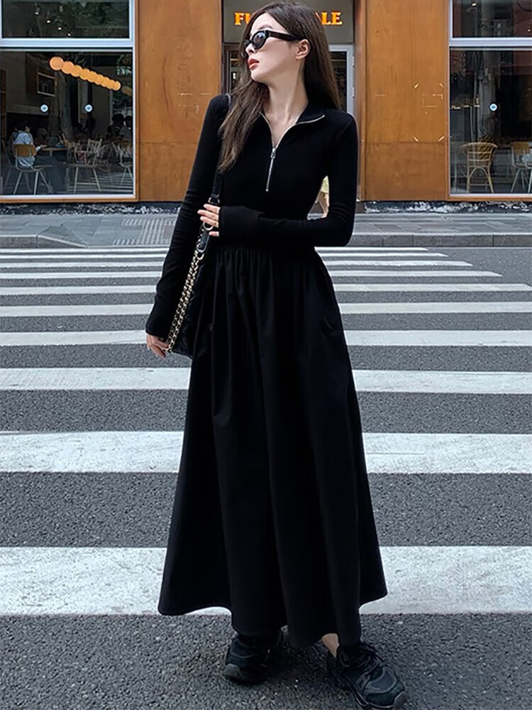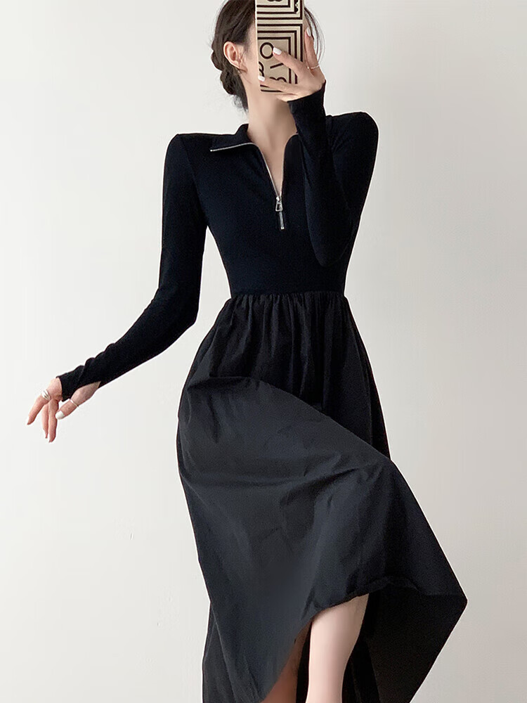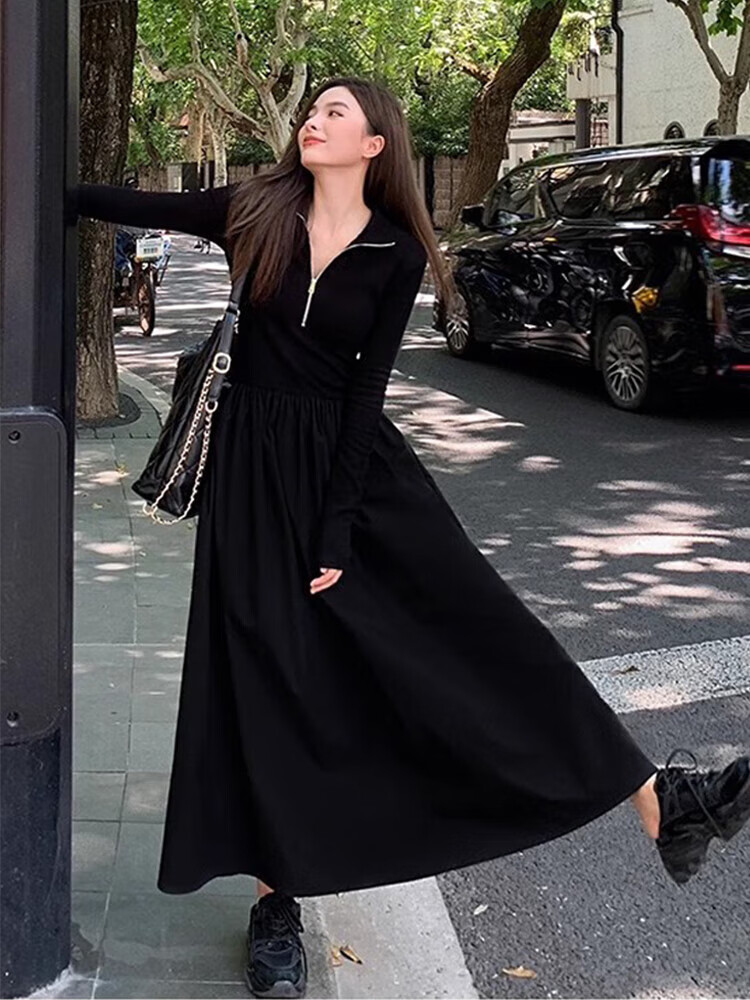 Miao Yijia Dress Women's Autumn Women's Skirt Knitted New High-end Long Skirt with Coat French Waist Slimming Black Zipper Long Sleeve A-Line Hepburn Style Dress XL Recommended 105-120 Jin Jin is equal to 0.5 kg