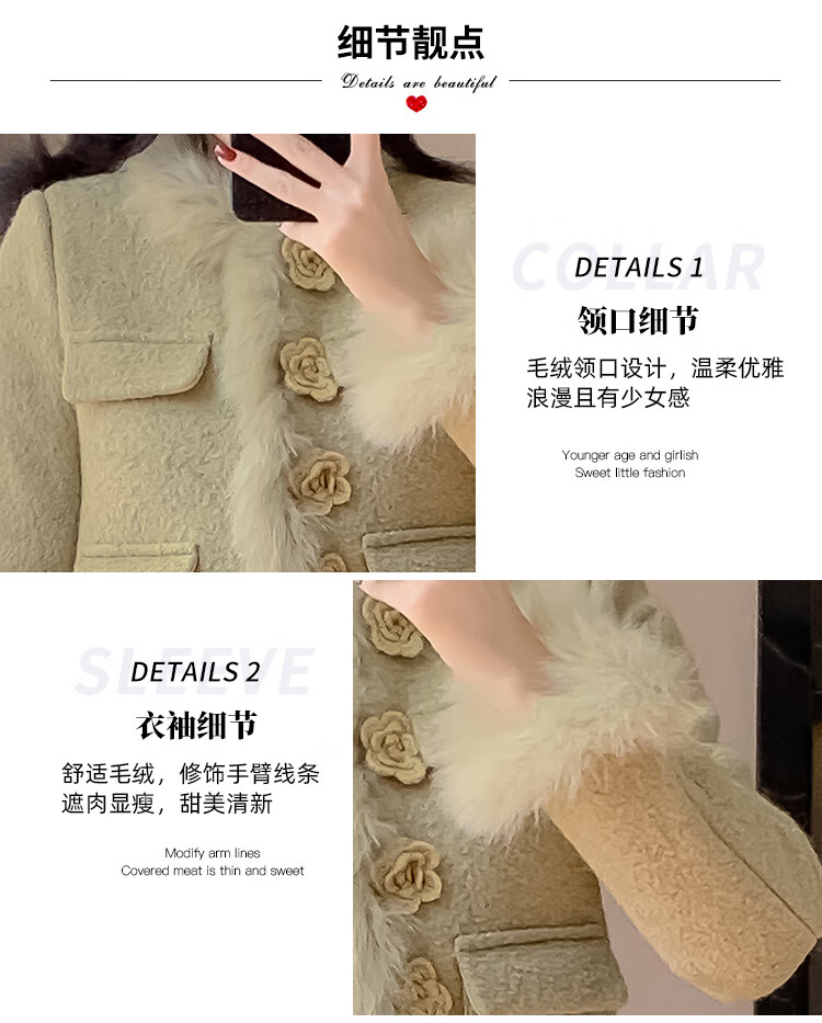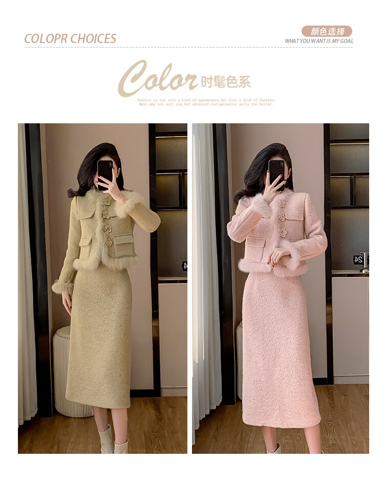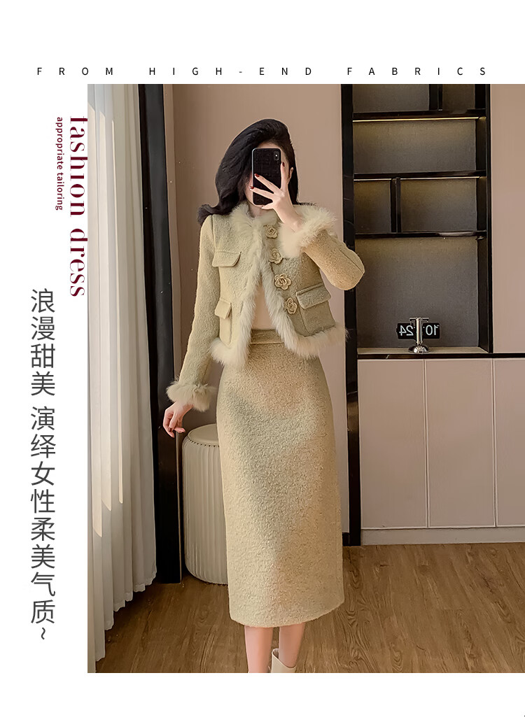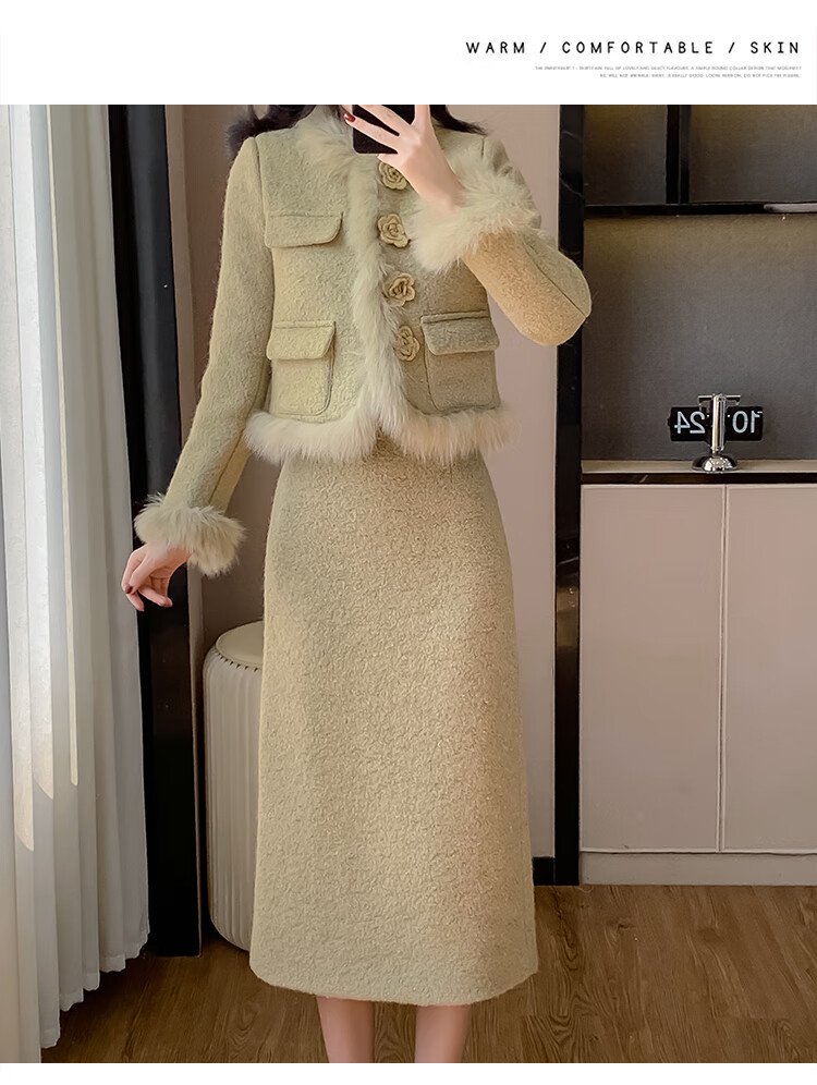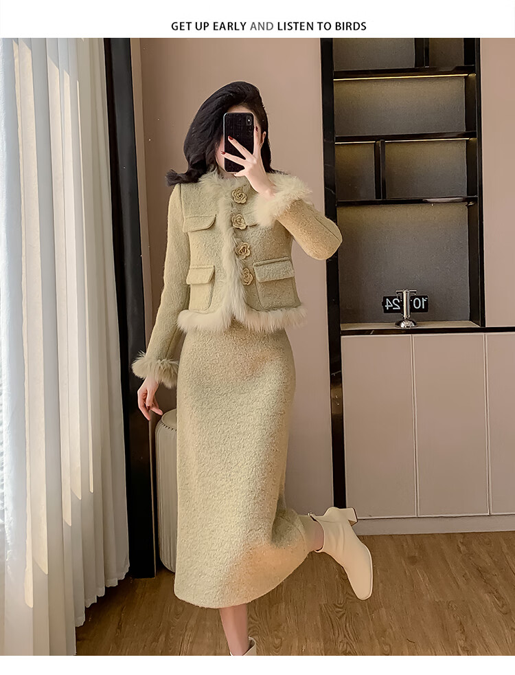 Majiaomei small fragrant dress women's suit 2025 autumn and winter new Korean style velvet thickened furry short coat skirt green bean green suit M