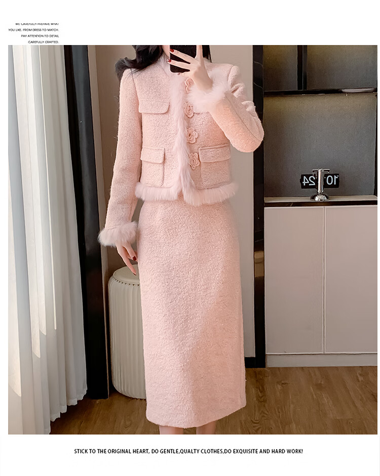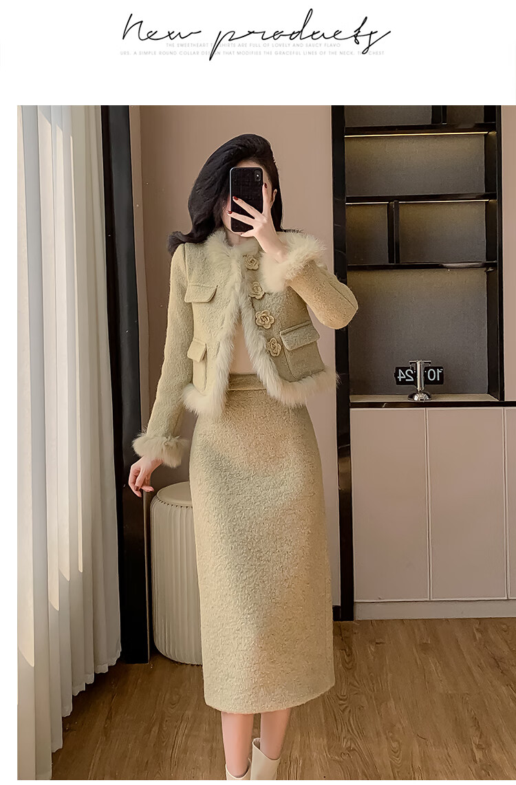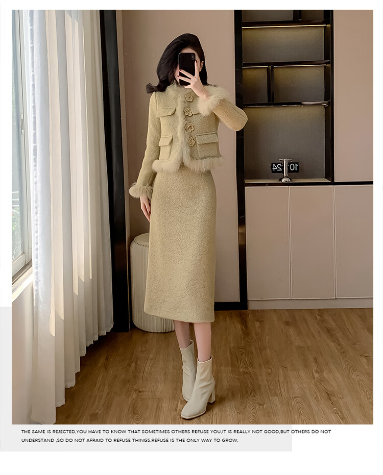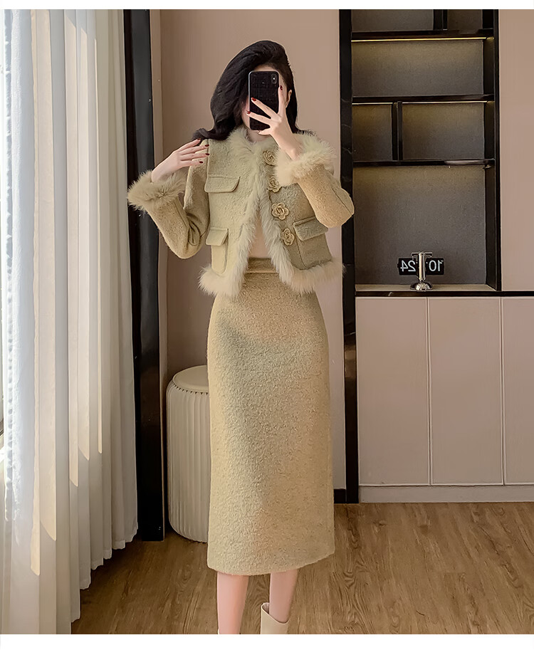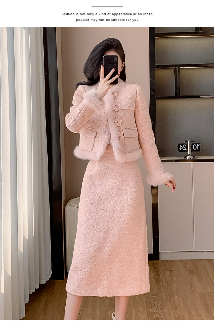 Majiaomei small fragrant dress women's suit 2025 autumn and winter new Korean style velvet thickened furry short coat skirt green bean green suit M