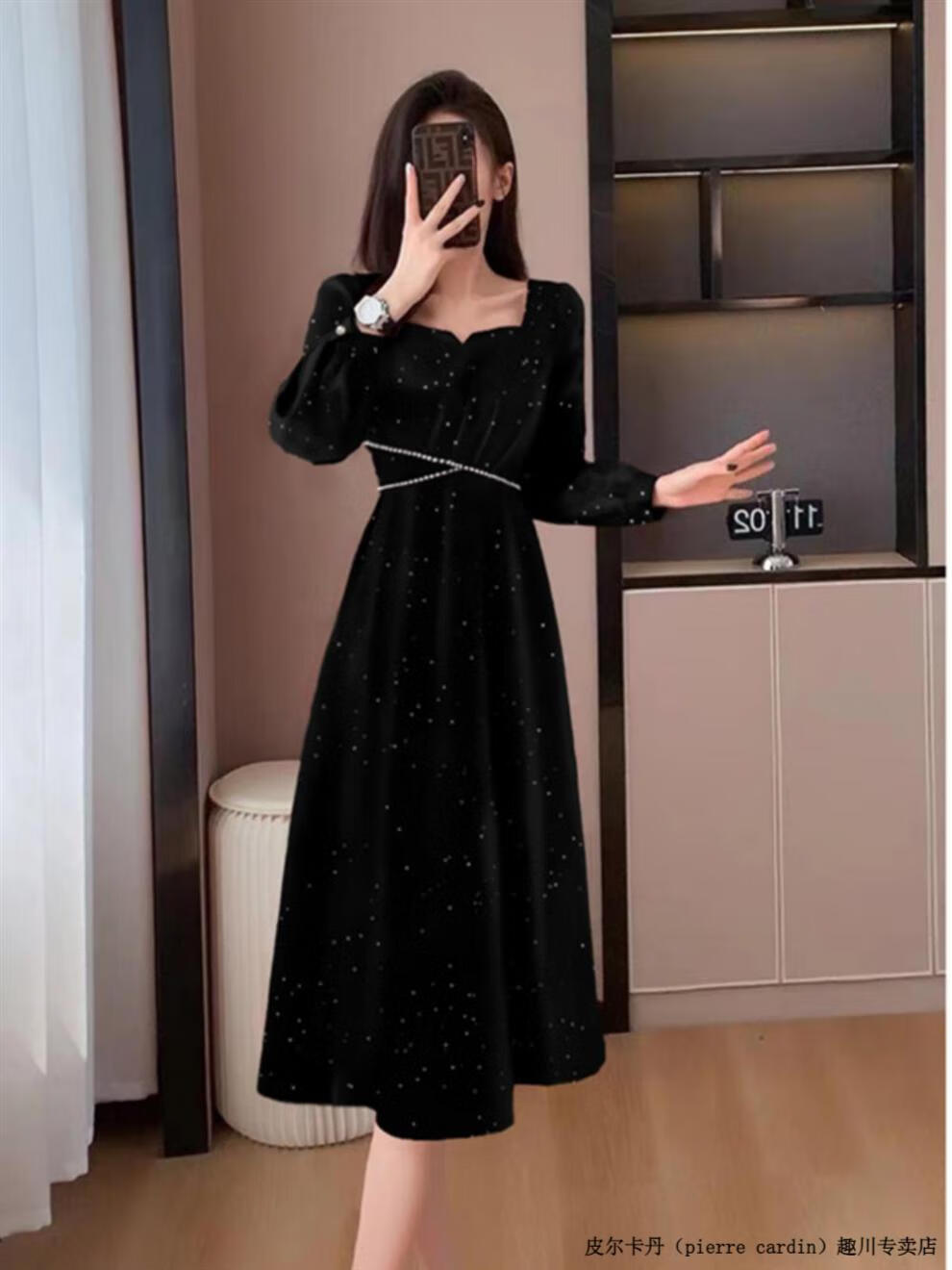 Pierre Cardin French retro gentle style dress spring and autumn new large size slimming temperament engagement dress long skirt shiny black L recommended 110-125 Jin Jin equals 0.5 kg