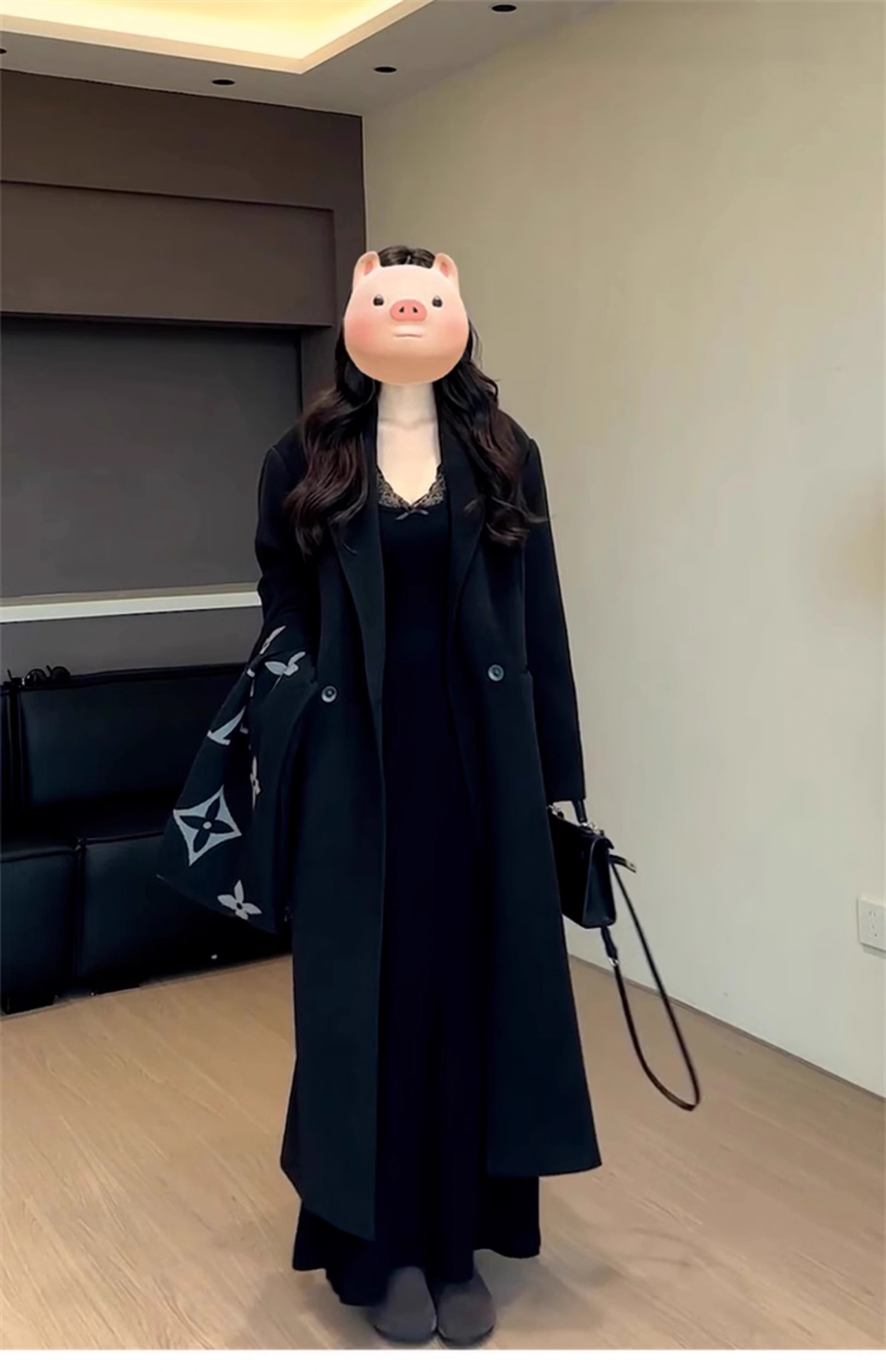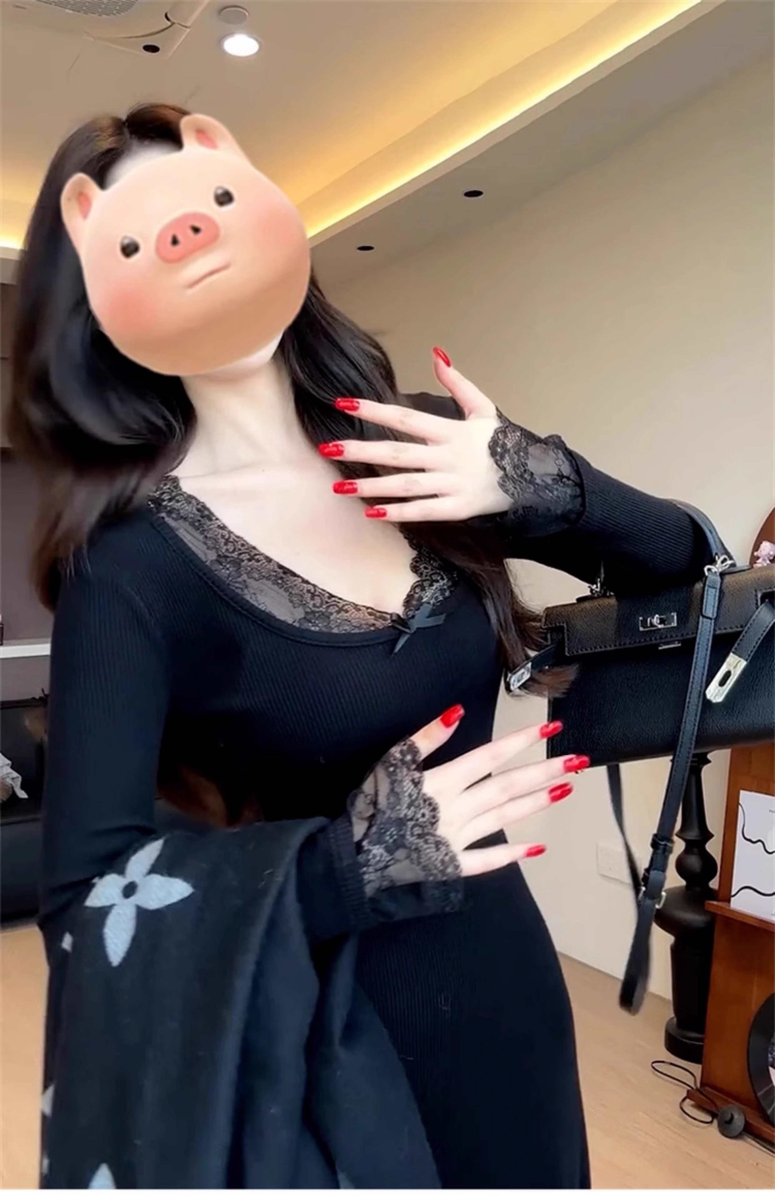 Hao'e early autumn black dress Hepburn style v-neck knitted skirt advanced 2025 with coat inner bottoming hip-covering long skirt V-neck knitted dress black L