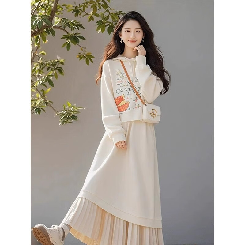 Majiaomei sweatshirt dress women's suit 2025 spring and autumn new college style Korean style versatile casual sweatshirt skirt off-white top + skirt M