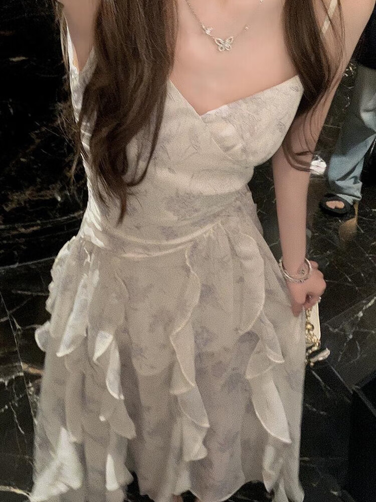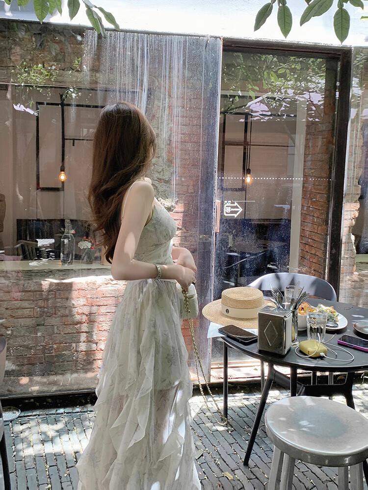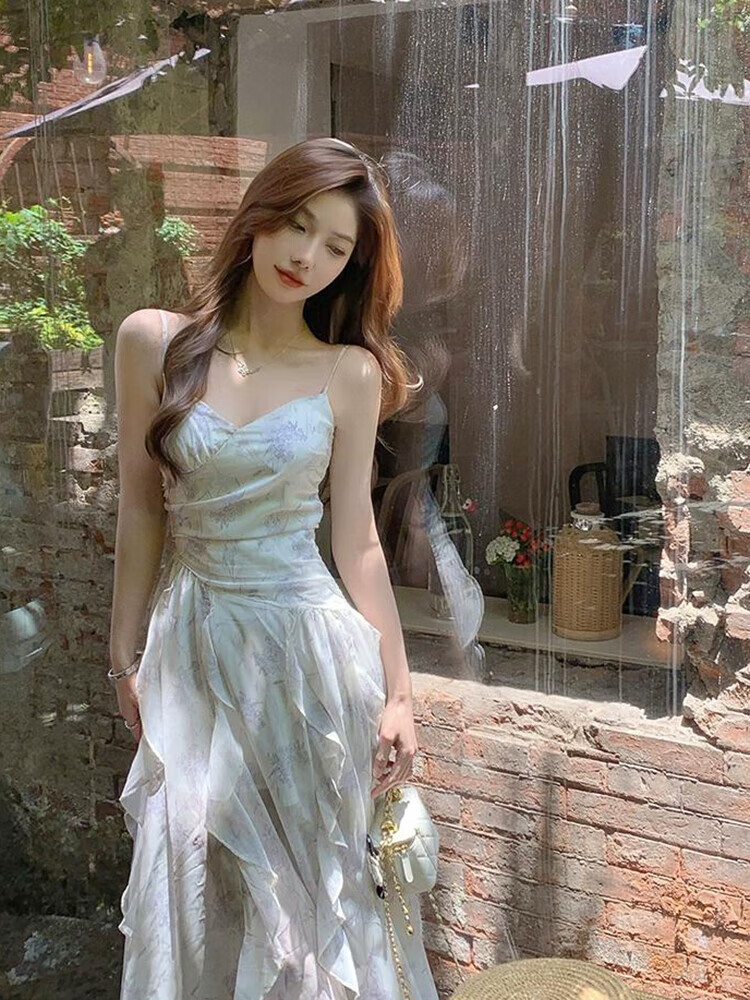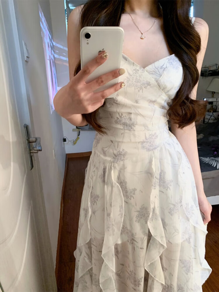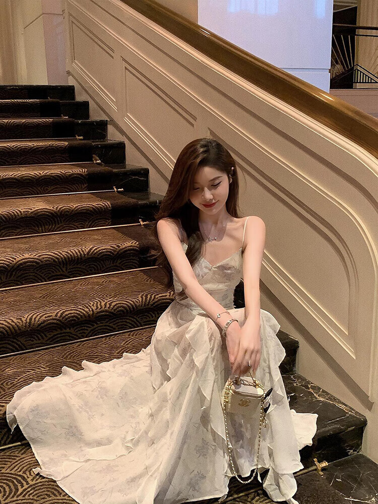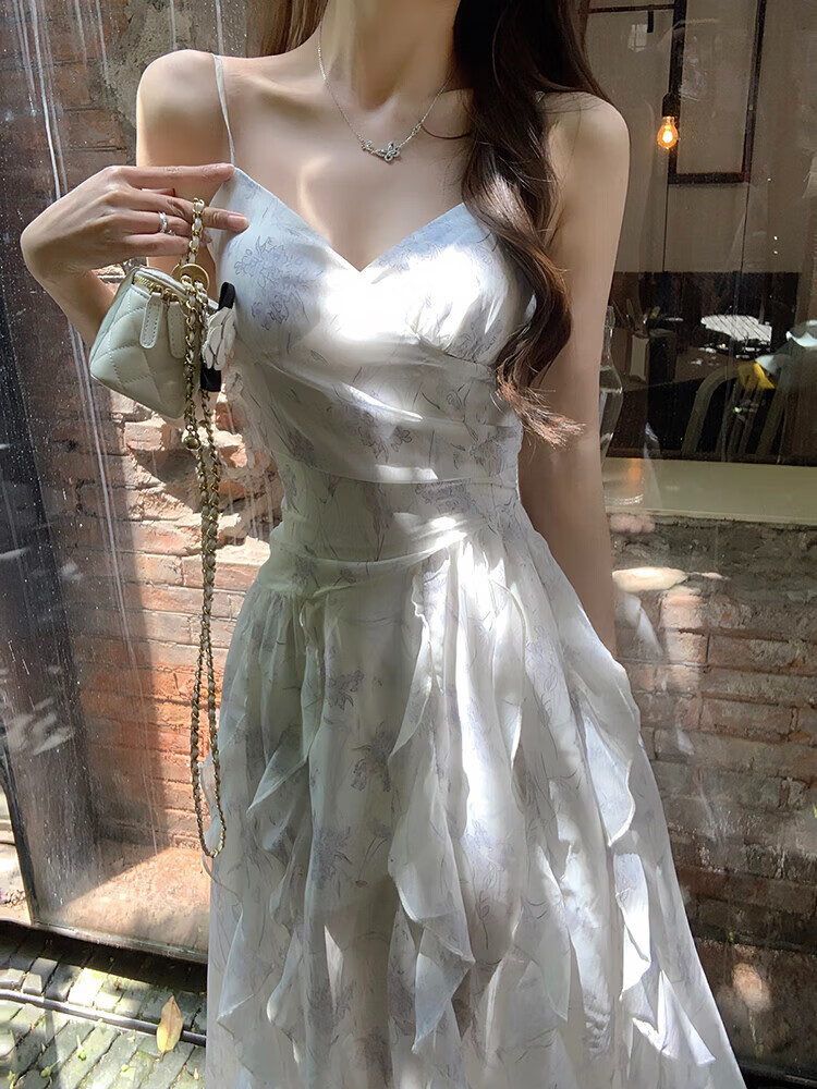 FOX.G skirt new suspender dress women summer 2025 new clothes women's small French pure desire long skirt ink floral ruffle dress L recommended 110-120Jin Jin equals 0.5 kg