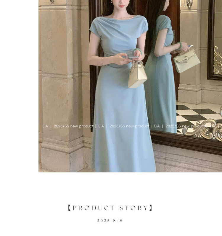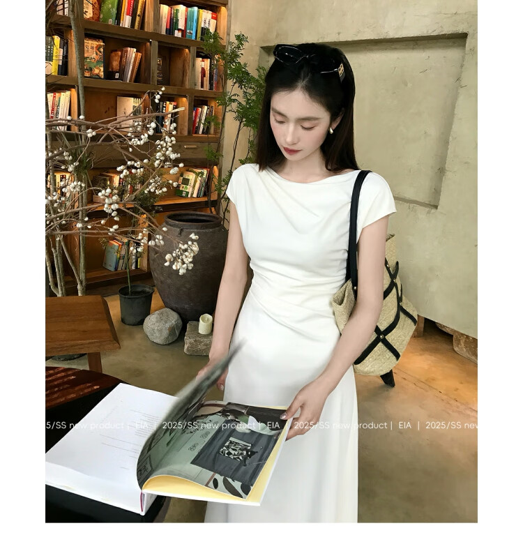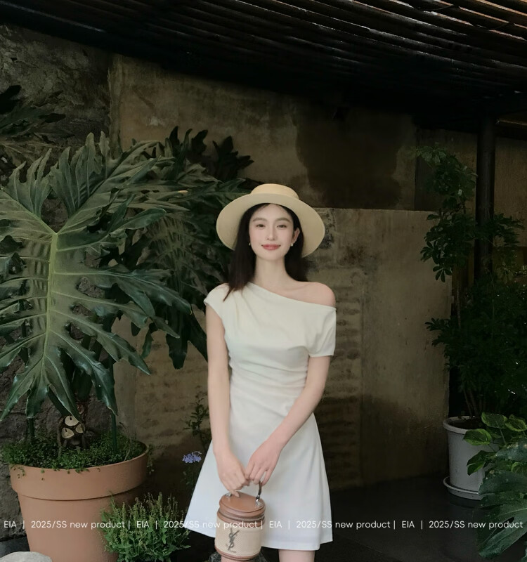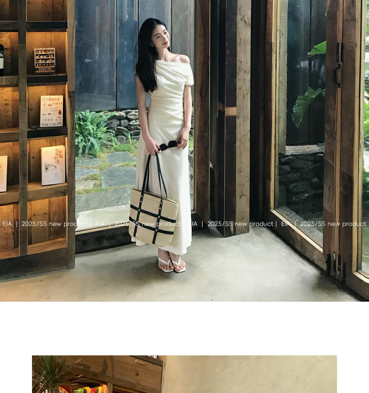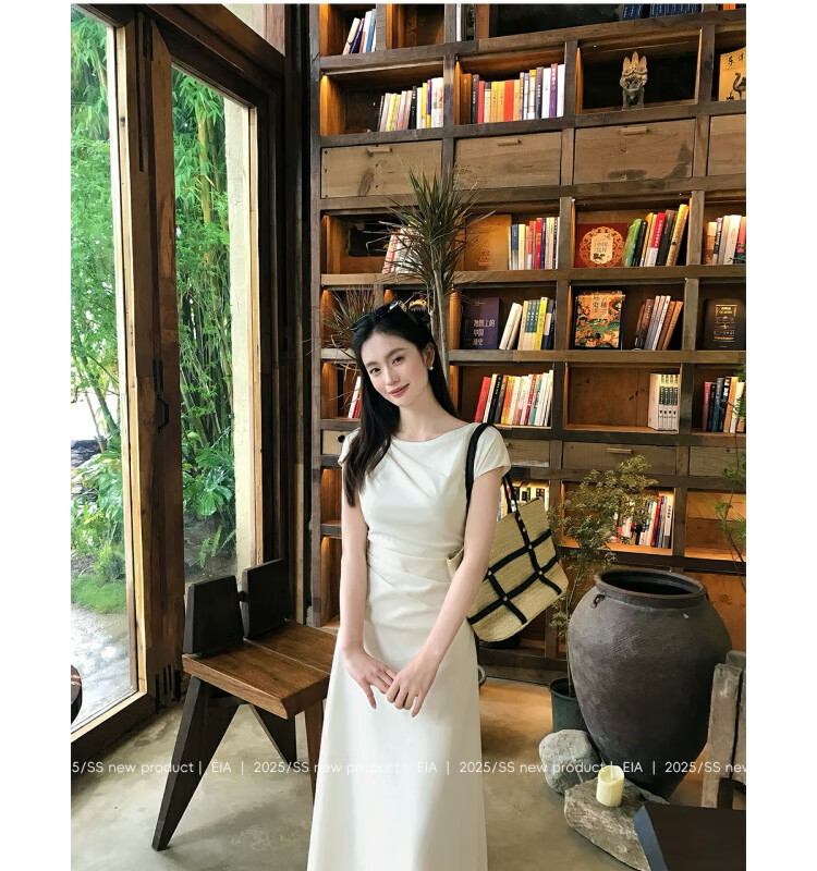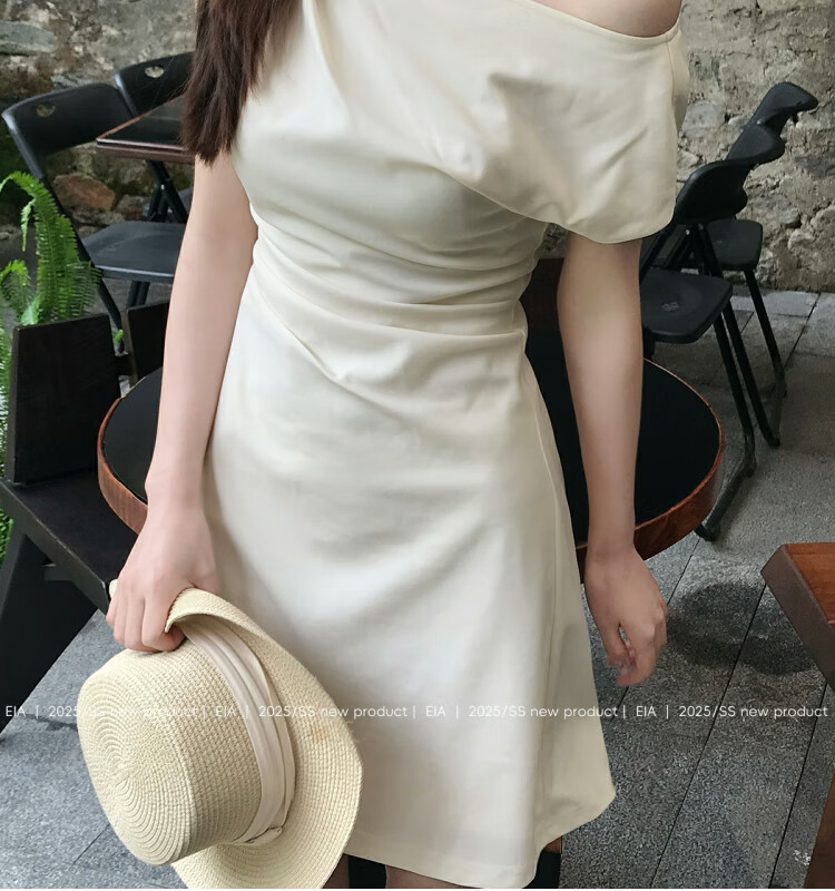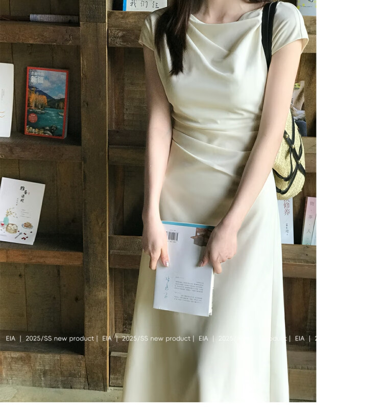 EIA Yiyao elegant art student temperament intellectual simple slanted shoulder dress women summer long and short skirt apricot long dress slightly shot L 110Jin Jin is equal to 0.5kg 120Jin Jin is equal to 0.5kg