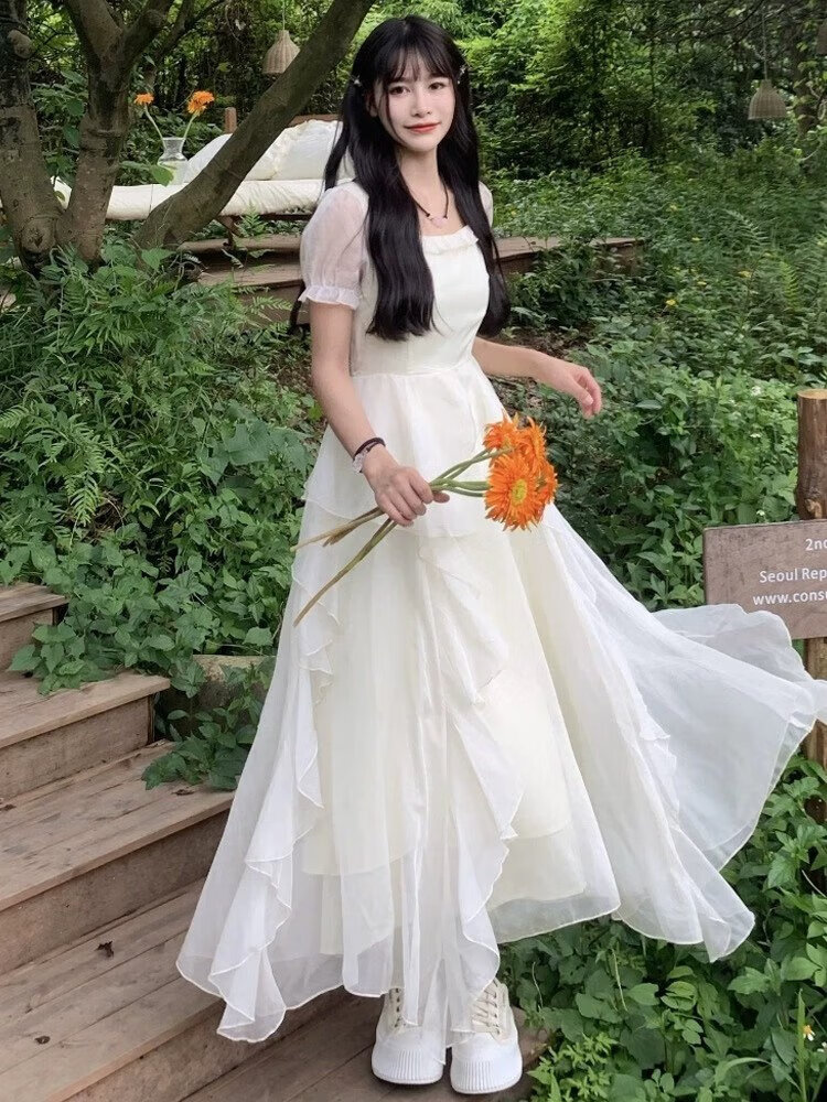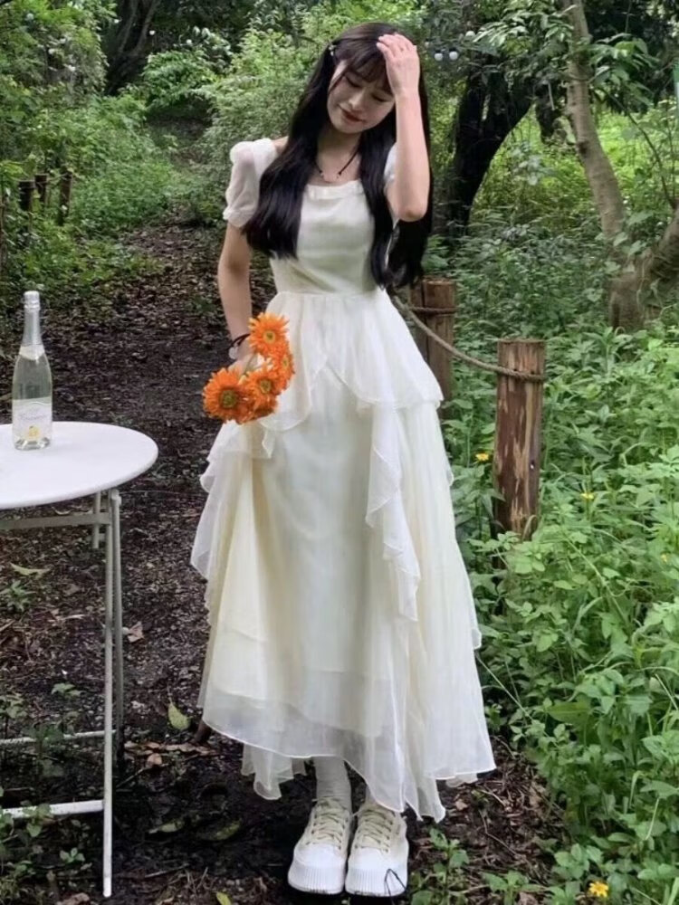 Let the fog white dress long skirt for women summer 2025 new small slimming seaside beach dress high-end light apricot first love dress XL recommended 120-135Jin Jin equals 0.5 kg