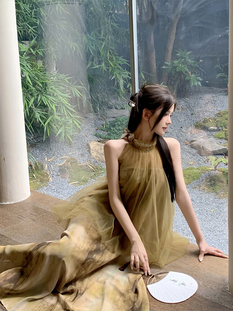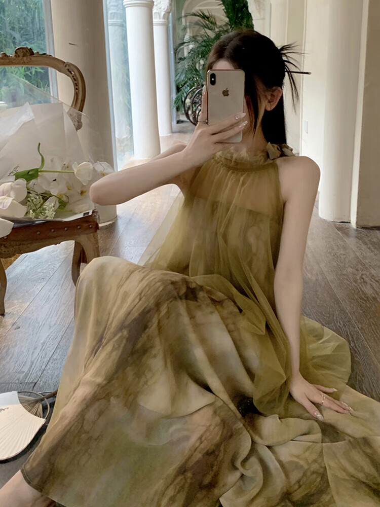 Think more about Yu Xin Chinese dress skirt women's summer 2025 new long skirt halterneck national style Xinjiang Yunnan grassland wear Firefly green smudged halterneck dress one size fits all recommended 80-130Jin Jin equals 0.5 kg