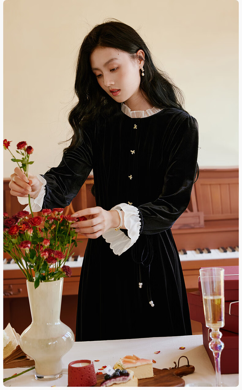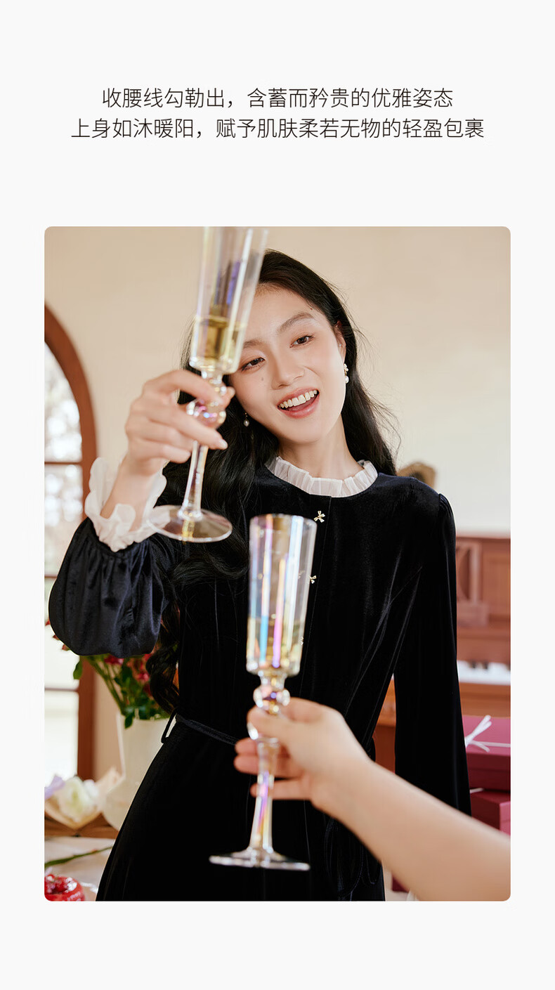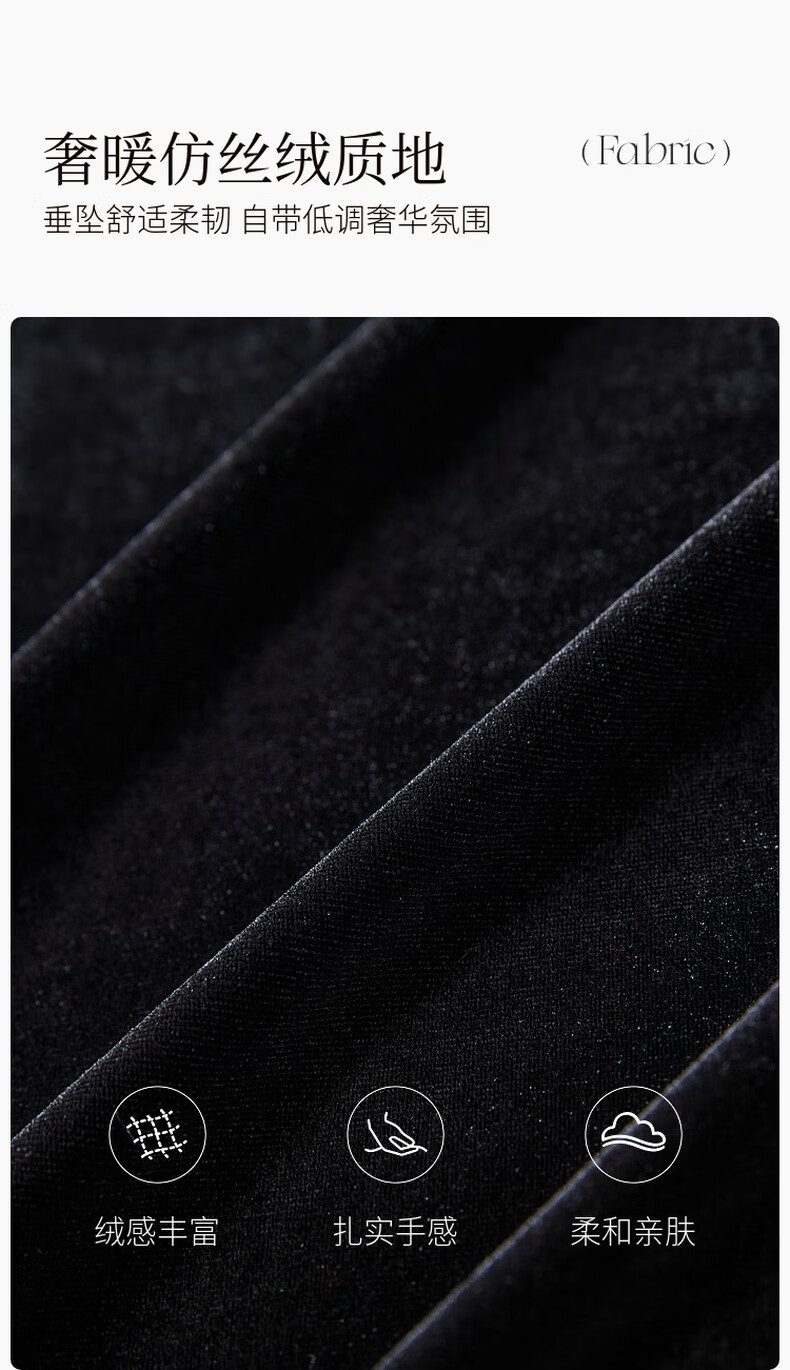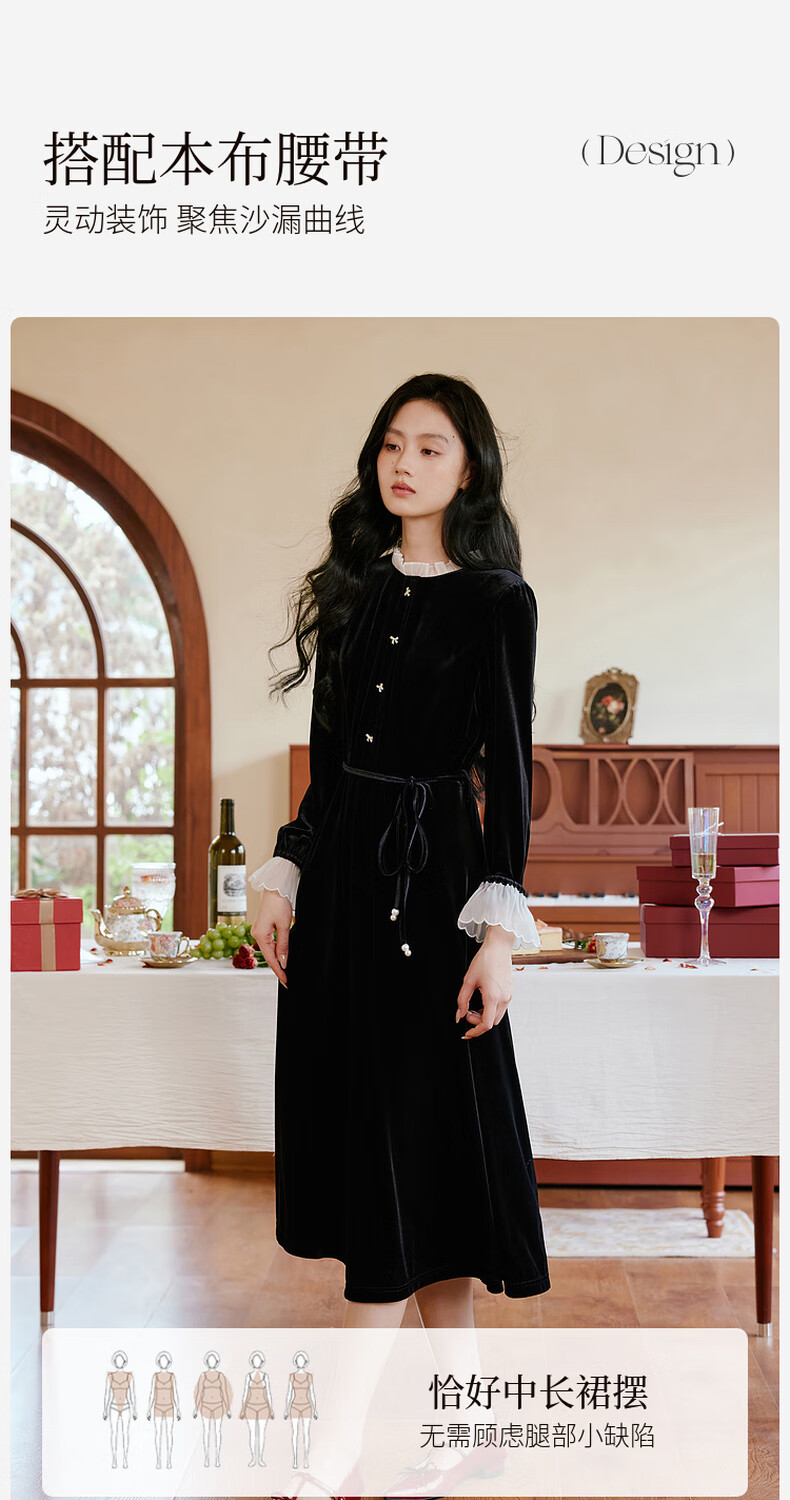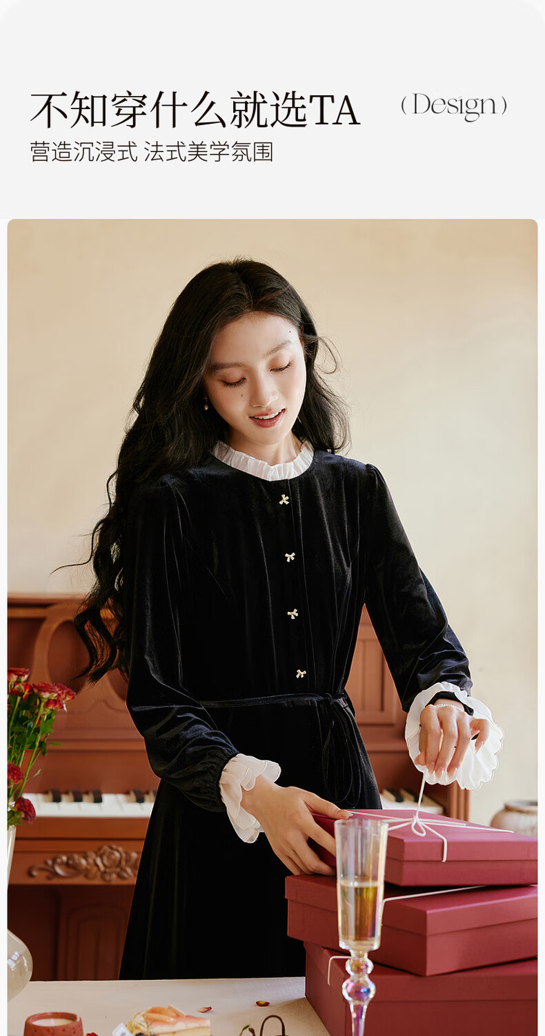 Xiangying Hepburn style black imitation velvet dress for women 2025 autumn new fungus edge stitching French waist skirt black L 165/88A/110-125Jin Jin equals 0.5 kg