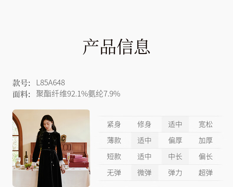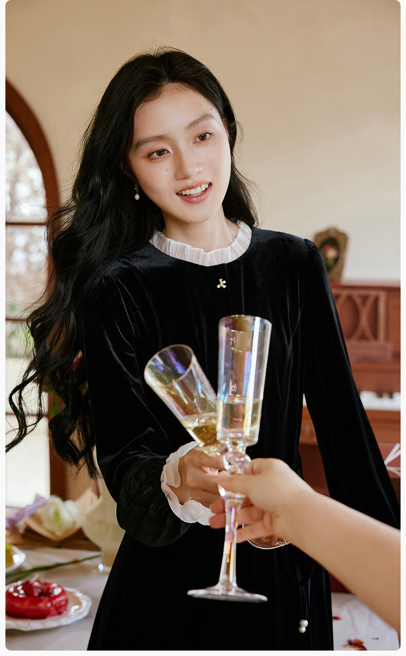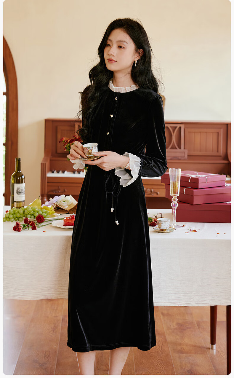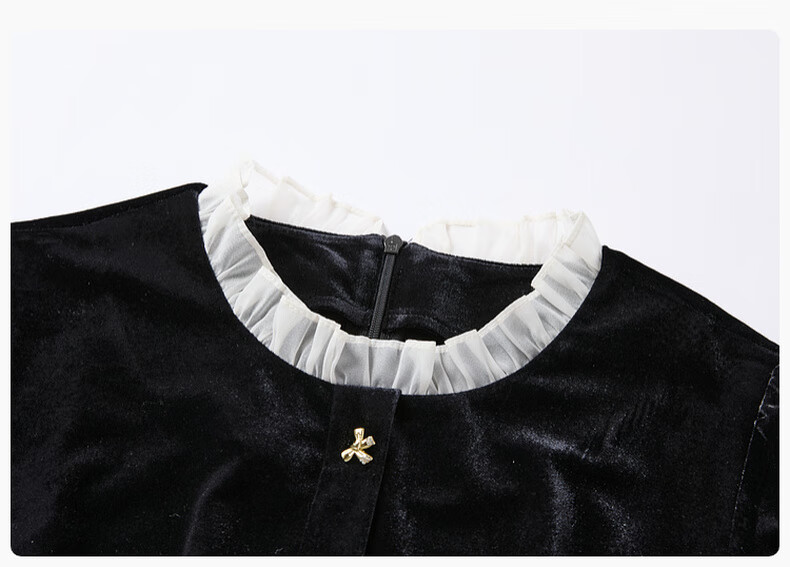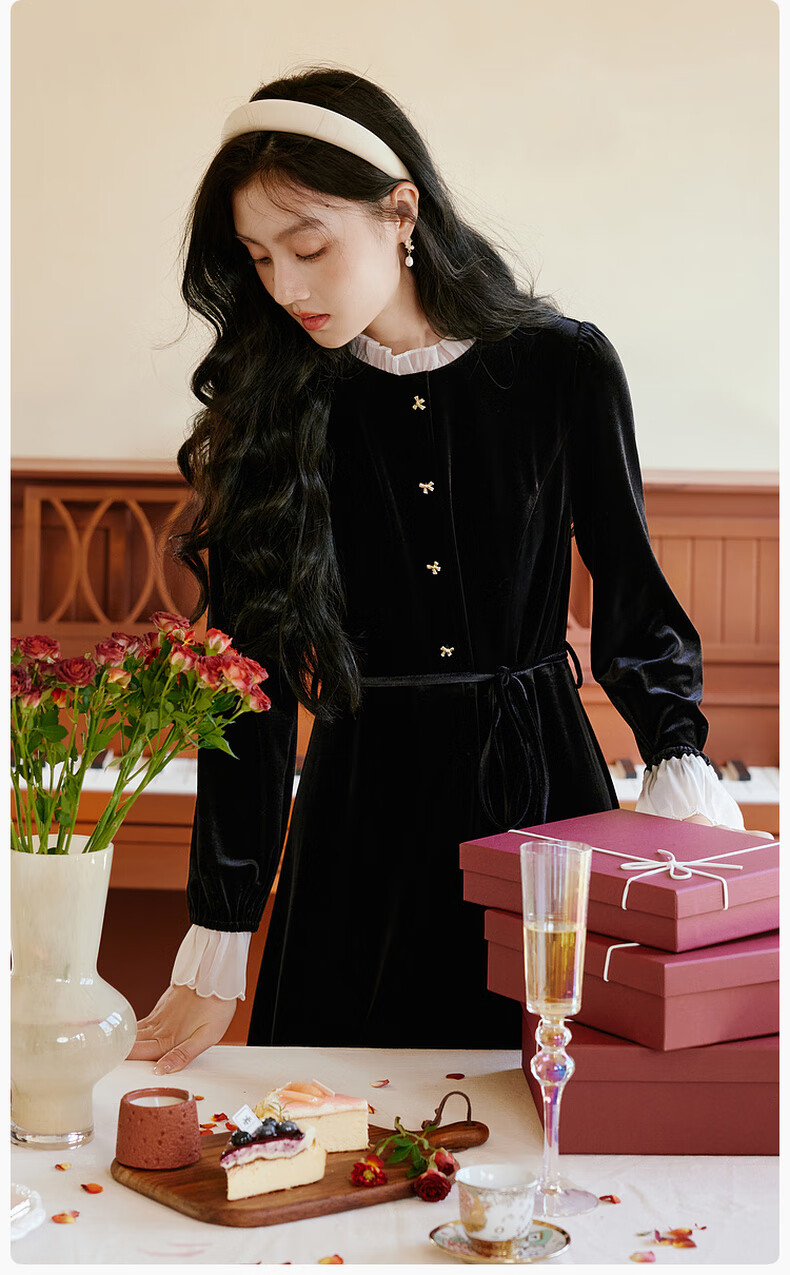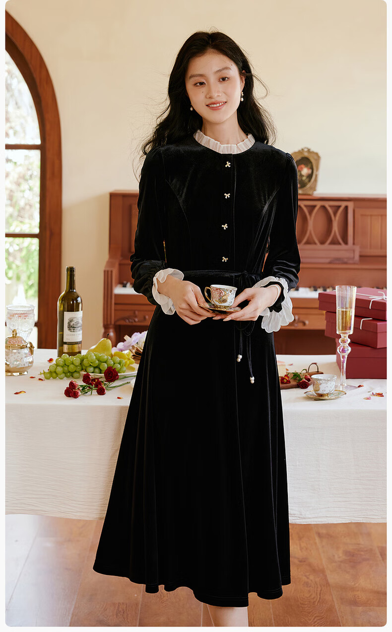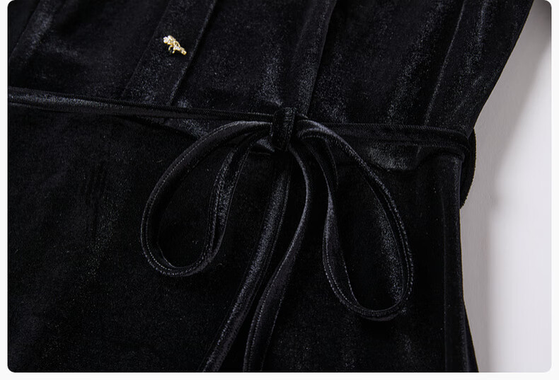 Xiangying Hepburn style black imitation velvet dress for women 2025 autumn new fungus edge stitching French waist skirt black L 165/88A/110-125Jin Jin equals 0.5 kg