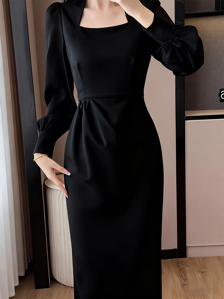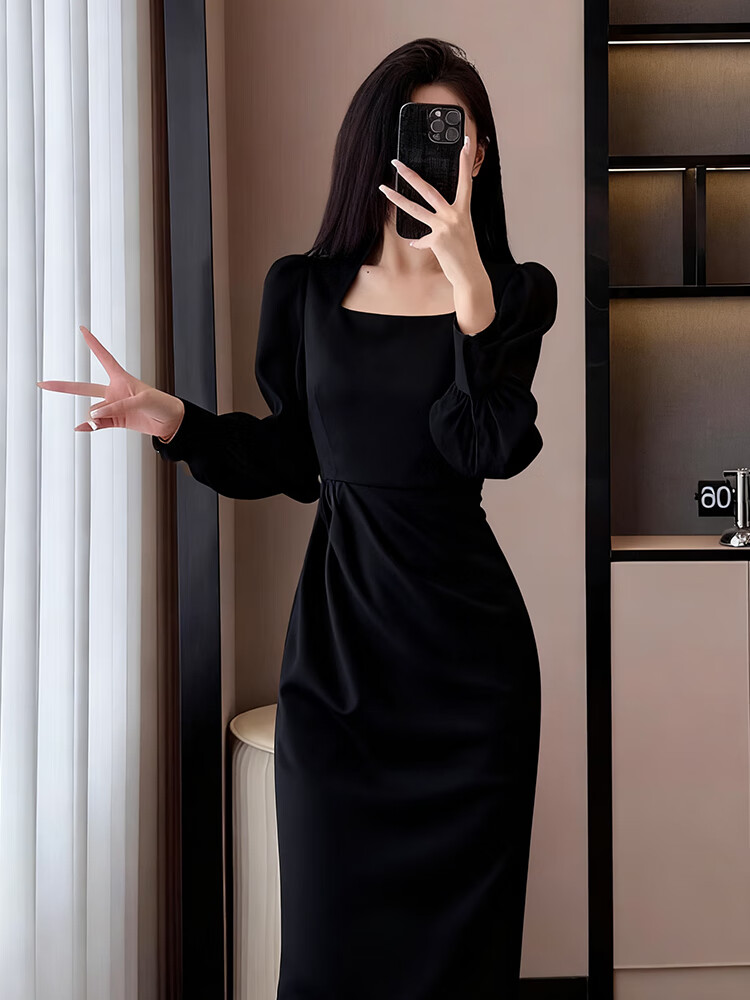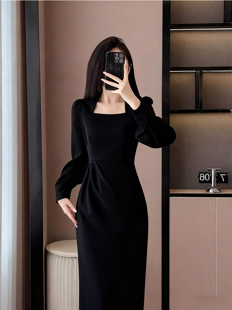 Bangboshi Black Dress Women's 2025 Autumn New Slim Fit Square Neck High-Quality French Casual Long Dress French Square Neck Black Dress Long Sleeve M Suitable (101-115)