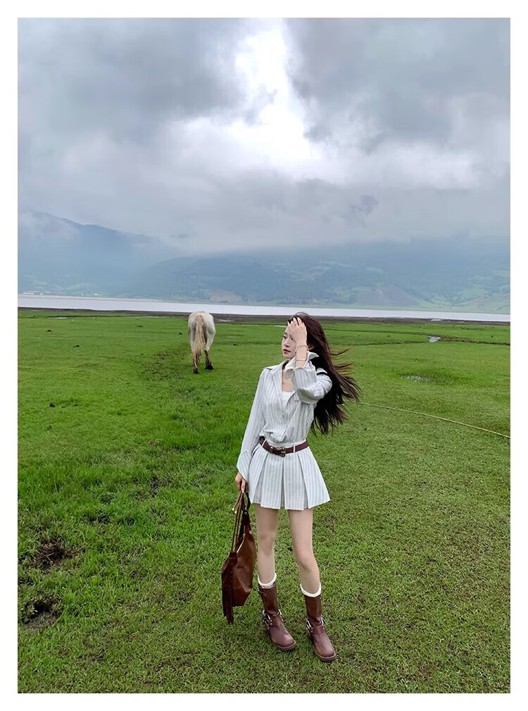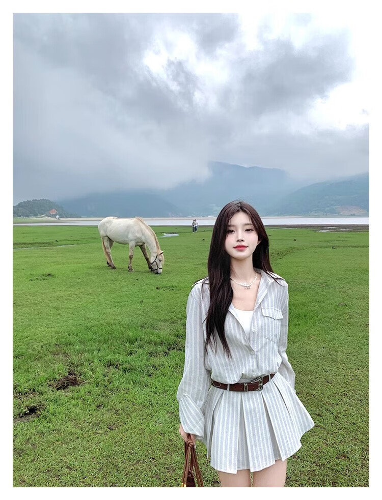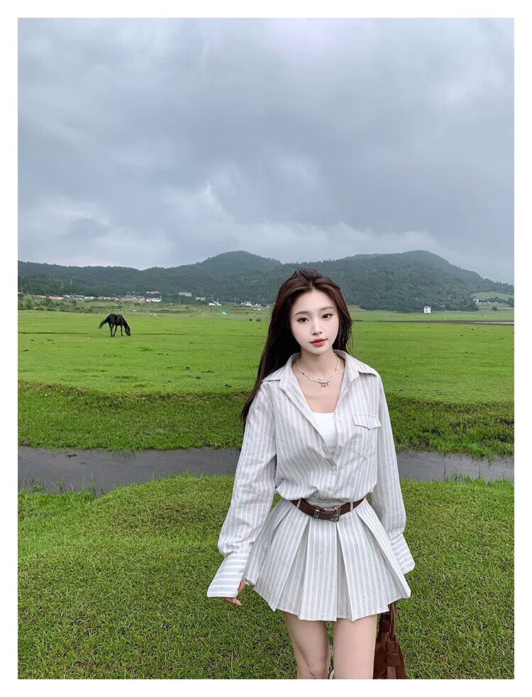 Lugeli Dress Women's Spring and Autumn New College Style Long Sleeve Dress Pure Desire French Style Waist Slim Pleated Skirt Striped Shirt Dress Belt M