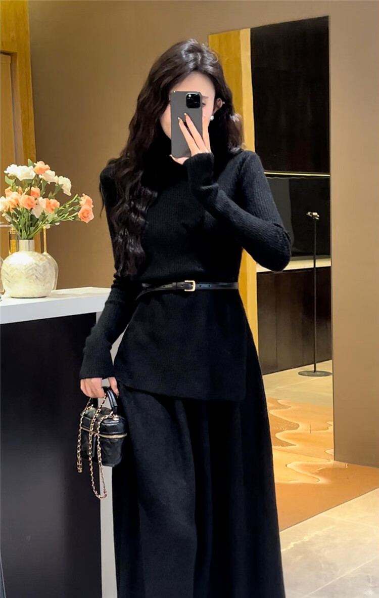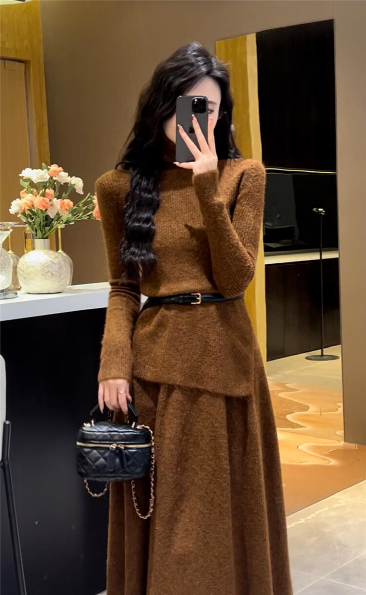 Aizhuer Xiaoxiang Hepburn style knitted dress winter 2025 new tea style fashionable women's suit autumn and winter dark gray suit + free belt one size fits all (recommended 80-140 Jin Jin equals 0.5 kg)