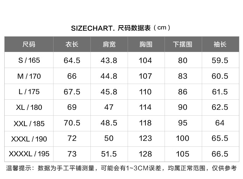 China (cm) 165 / 88-90 170 / 96-98 175 / 108-110 180 / 118-122 185 / 126-130