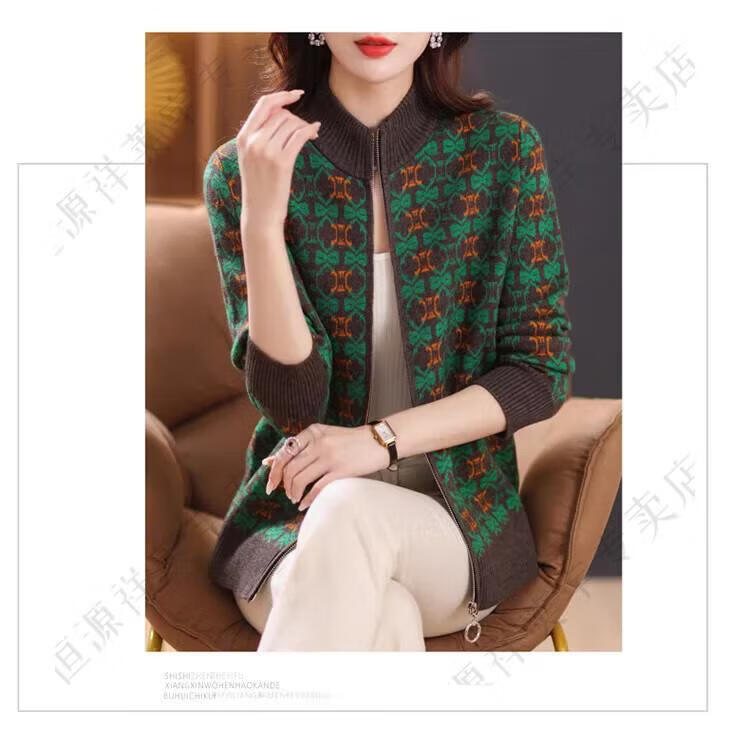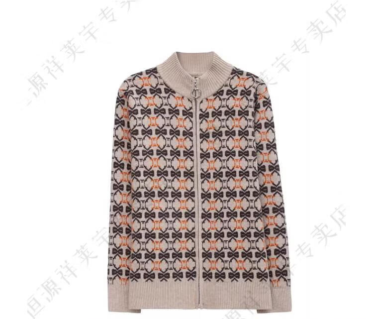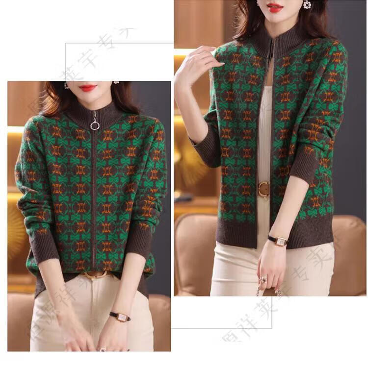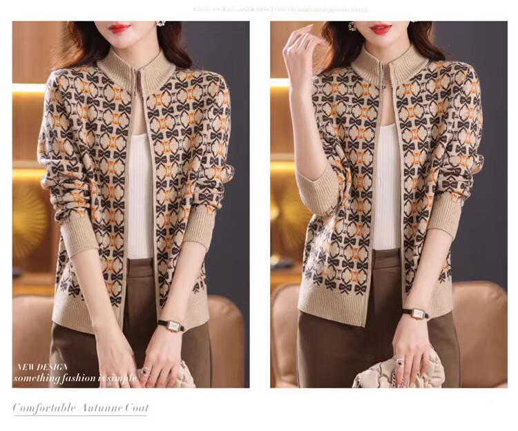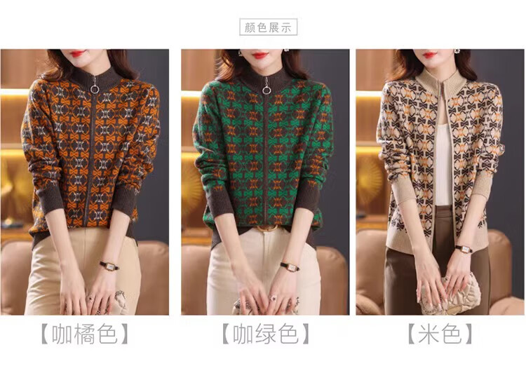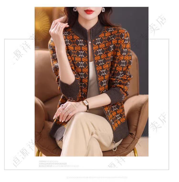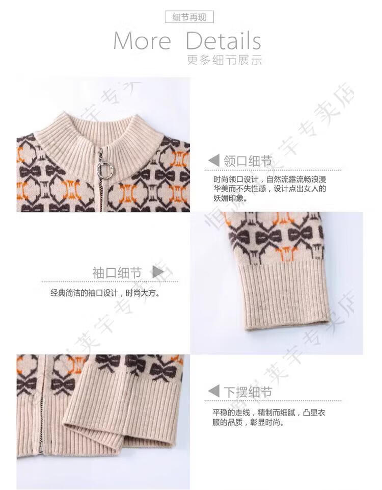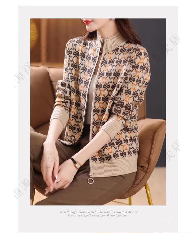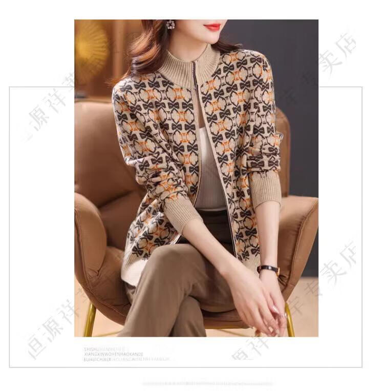Hengyuanxiang (HYX) Autumn New 100% Wool Sweater Women's Stand Collar Knitted Cardigan Jacquard Zipper Sweater Jacket Beige 2XL Recommended 125-130Jin Jin equals 0.5 kg