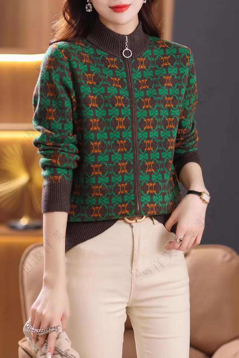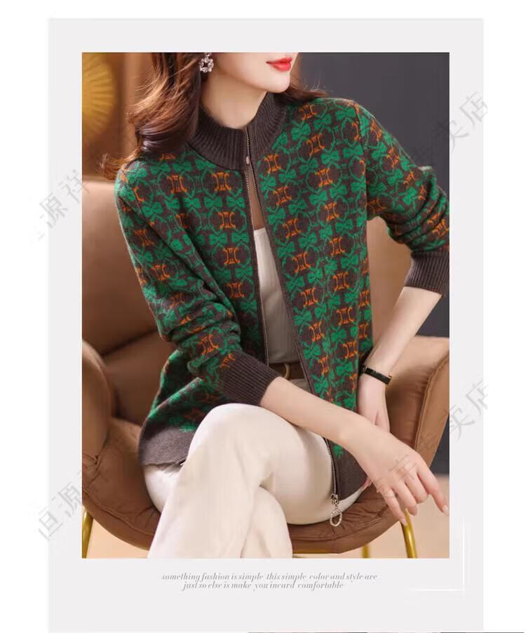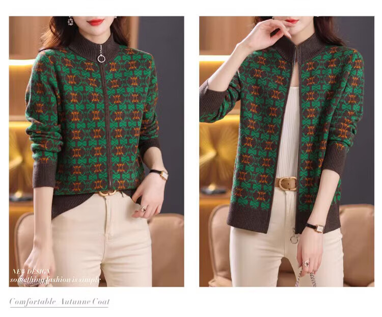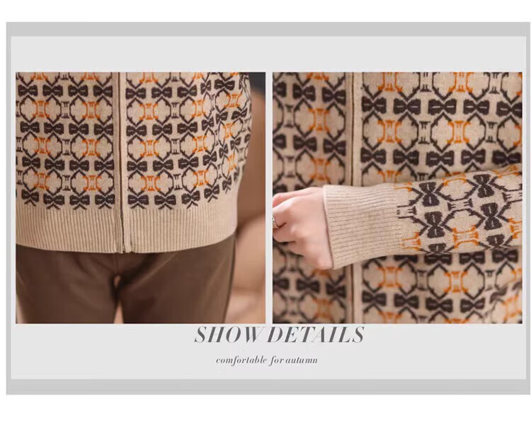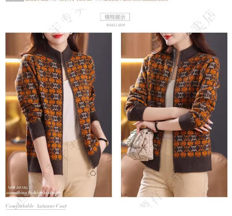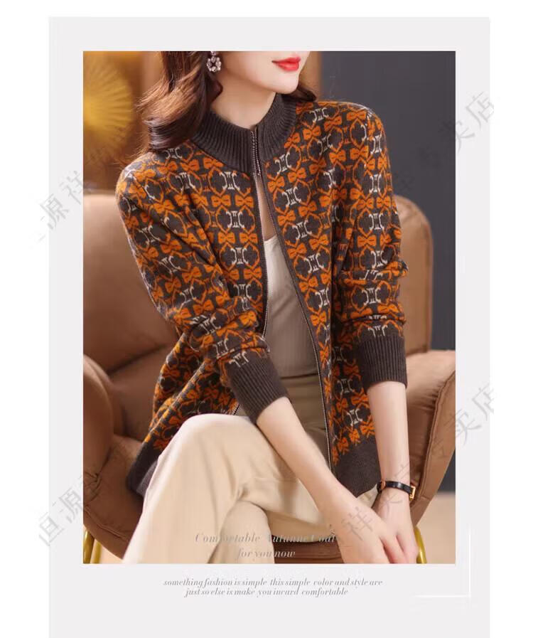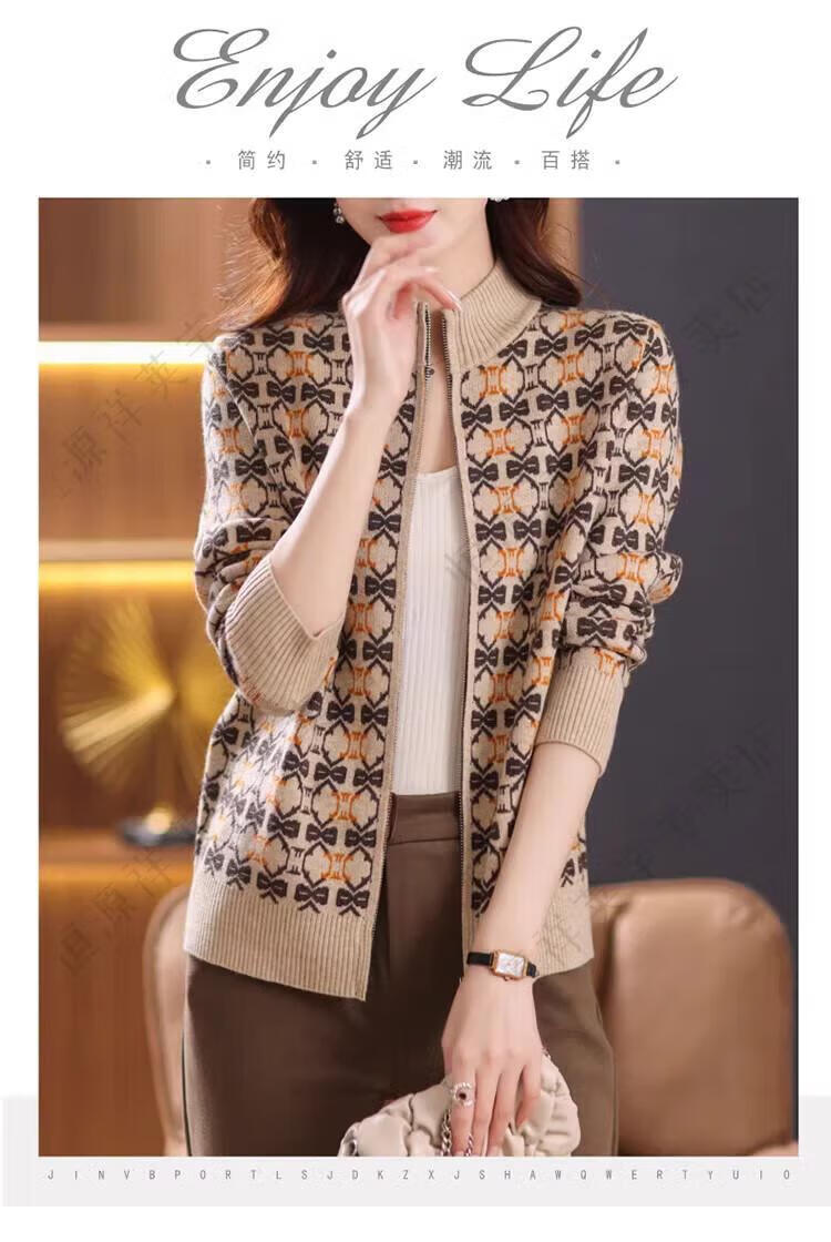 Hengyuanxiang (HYX) Autumn New 100% Wool Sweater Women's Stand Collar Knitted Cardigan Jacquard Zipper Sweater Jacket Beige 2XL Recommended 125-130Jin Jin equals 0.5 kg