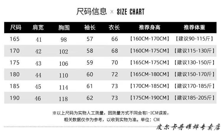 China (cm) 165 / 88-90 170 / 96-98 175 / 108-110 180 / 118-122 185 / 126-130
