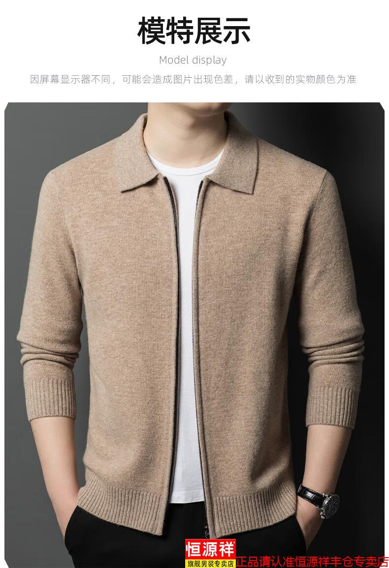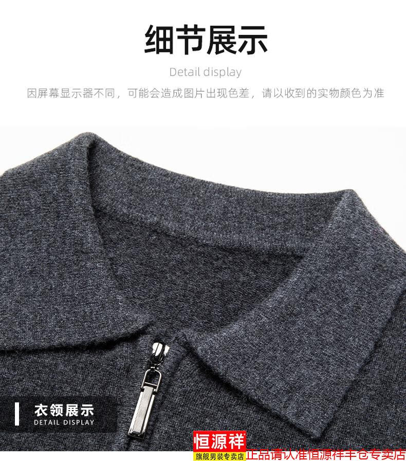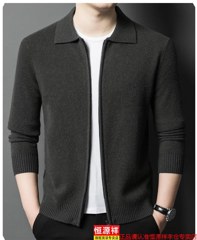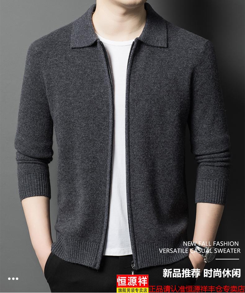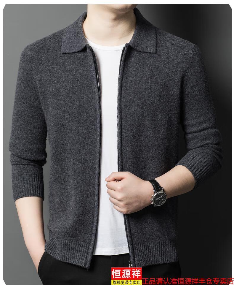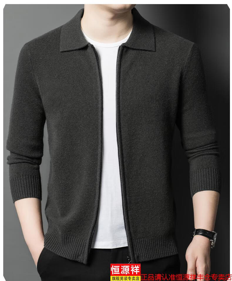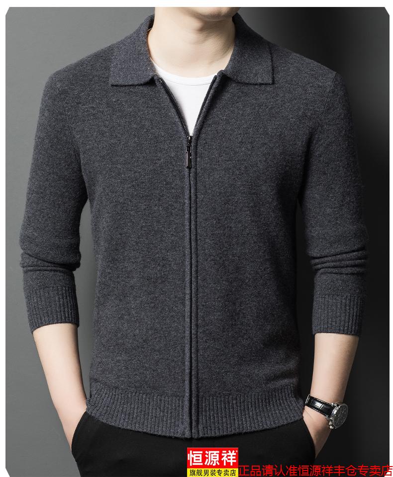 Hengyuanxiang light luxury high-end cashmere cardigan for men, full zipper sweater, autumn and winter thickened lapel sweater jacket, versatile new style, medium gray M 165