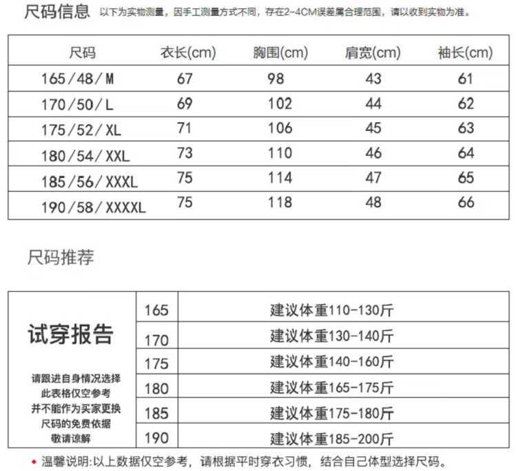 China (cm) 165 / 88-90 170 / 96-98 175 / 108-110 180 / 118-122 185 / 126-130