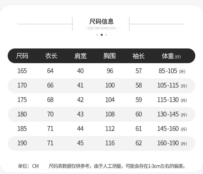 China (cm) 165 / 88-90 170 / 96-98 175 / 108-110 180 / 118-122 185 / 126-130