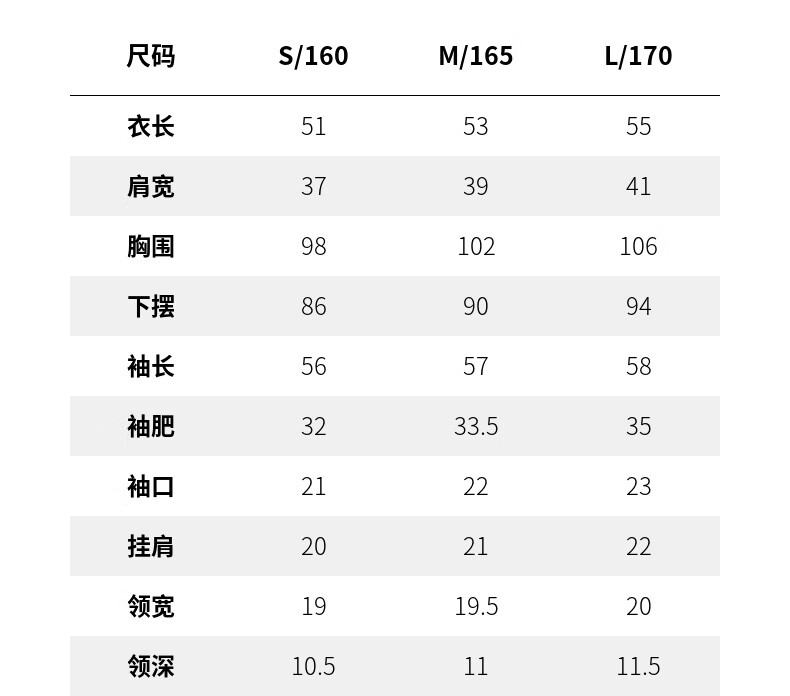 China (cm) 160-165/84-86 165-170 / 88-90 167-172 / 92-96 168-173 / 98-102 170-176 / 106-110