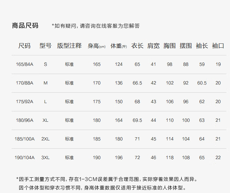 China (cm) 165 / 88-90 170 / 96-98 175 / 108-110 180 / 118-122 185 / 126-130