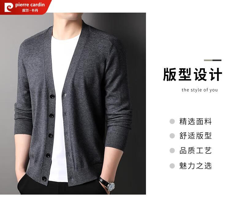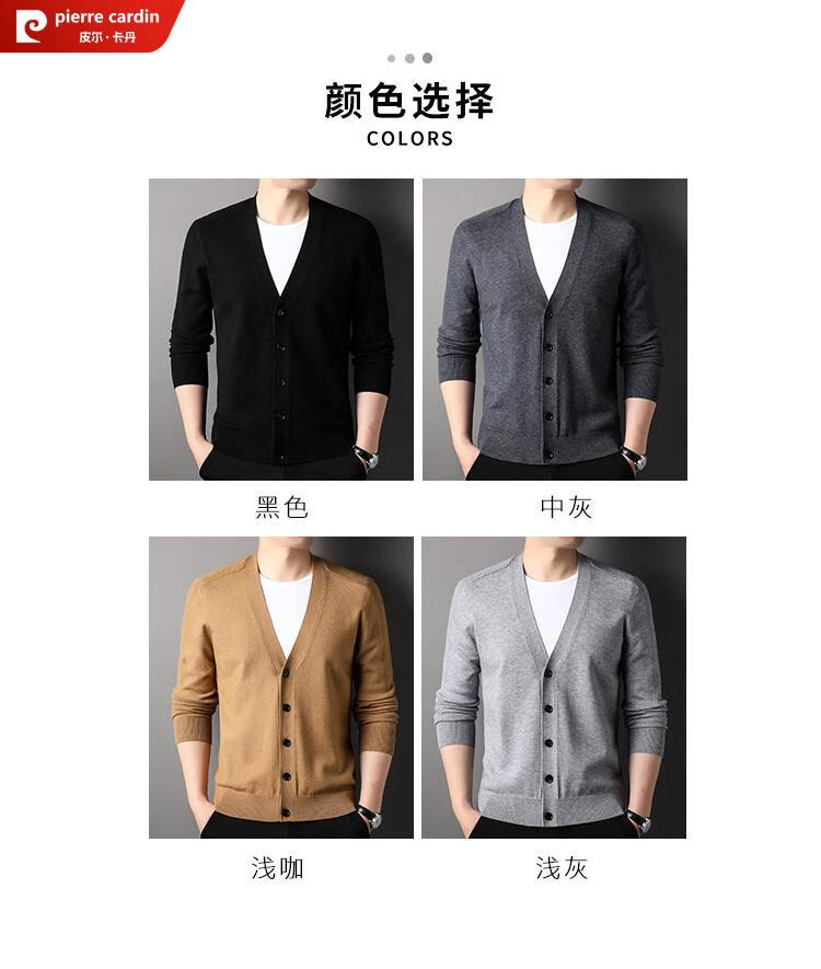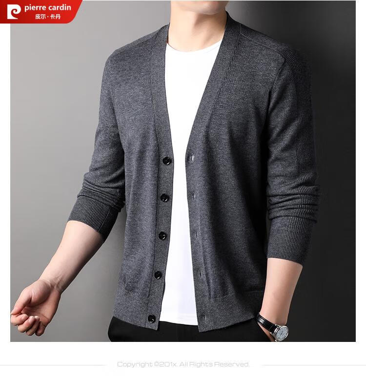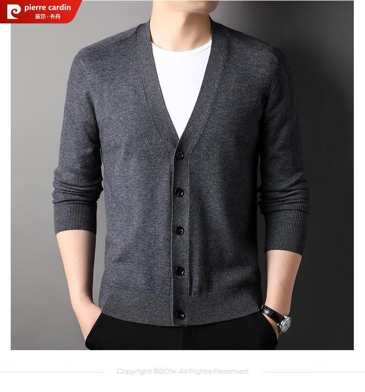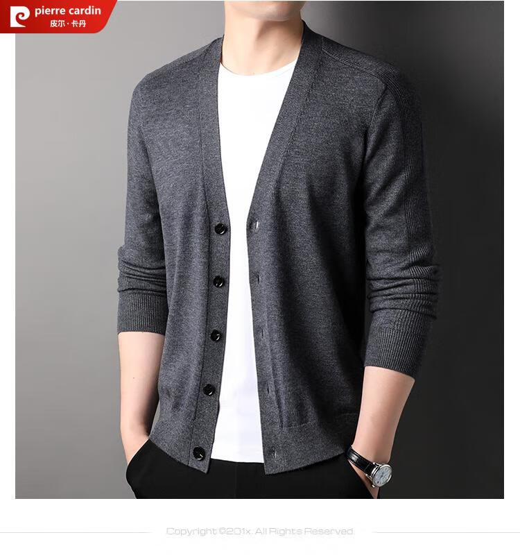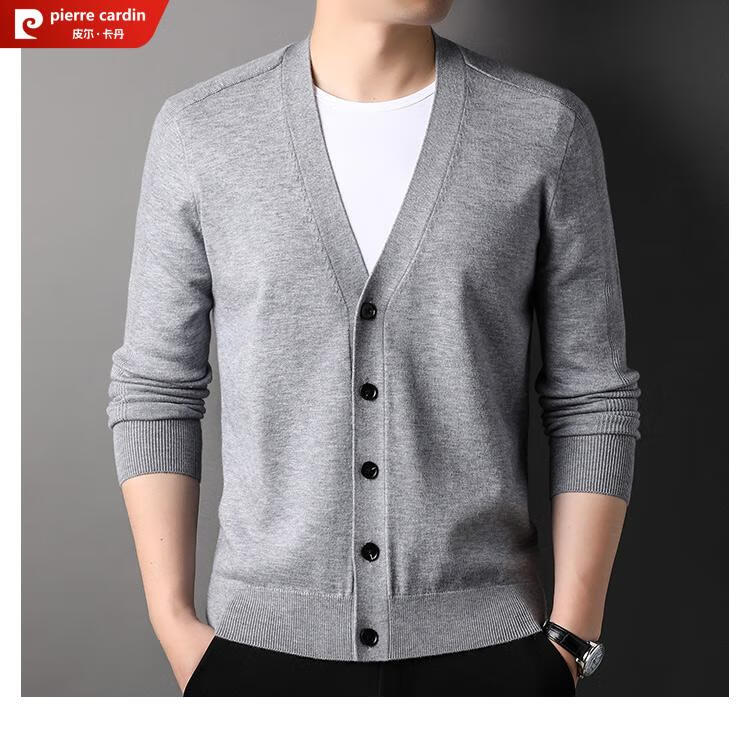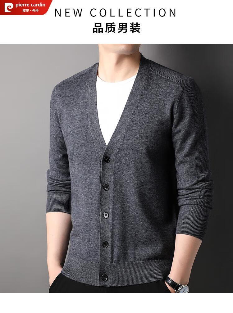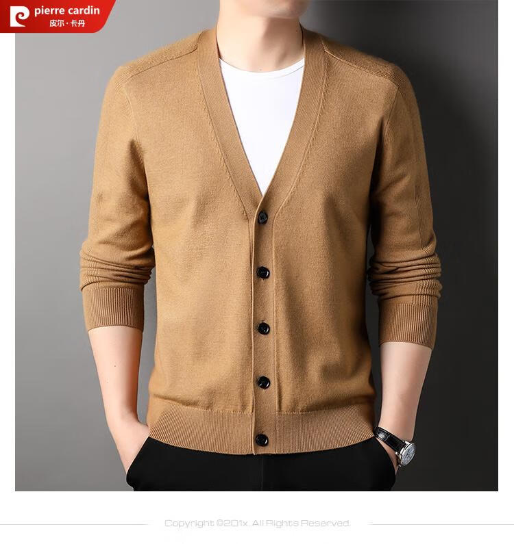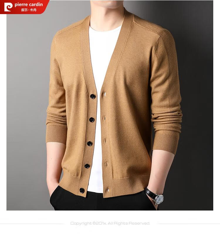 Pierre Cardin 100% pure wool knitted cardigan men's jacket spring and autumn V-neck high-end coat sweater new knitted men's clothing light coffee 2XL 180 recommended 145-160Jin Jin equals 0.5 kg