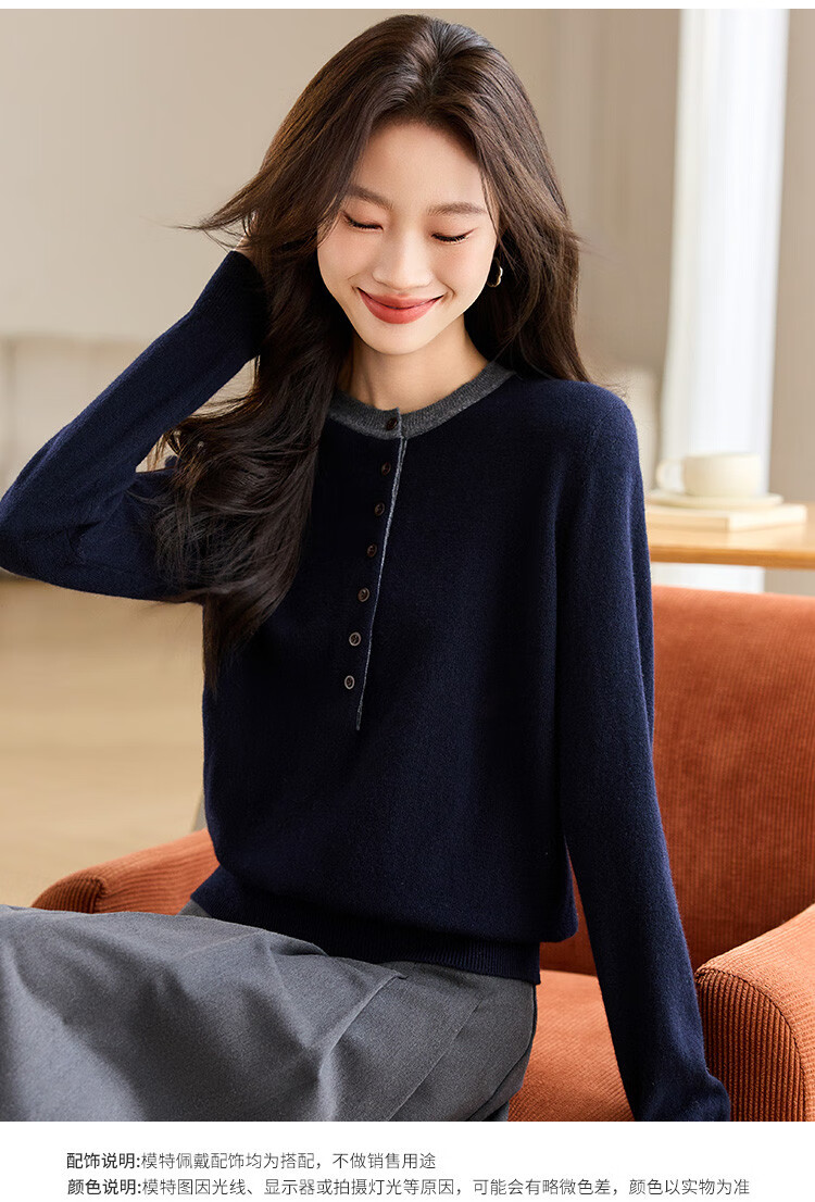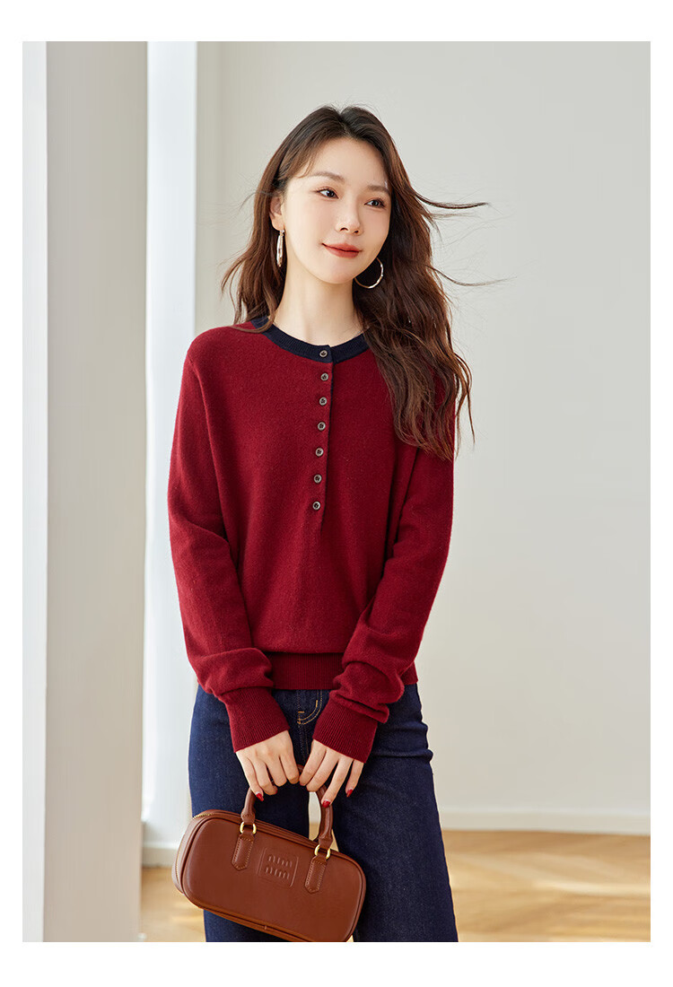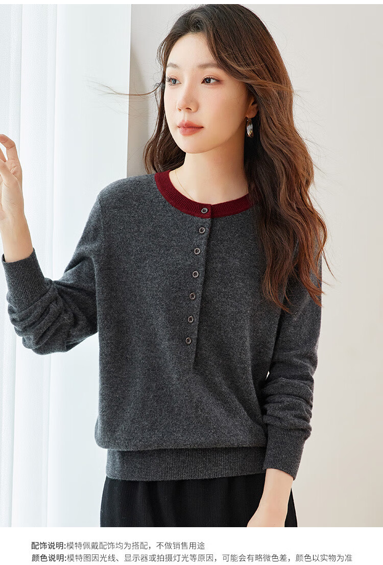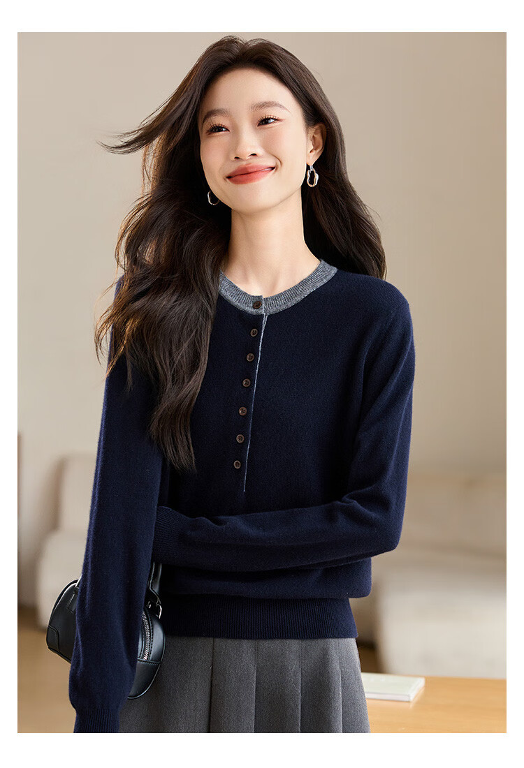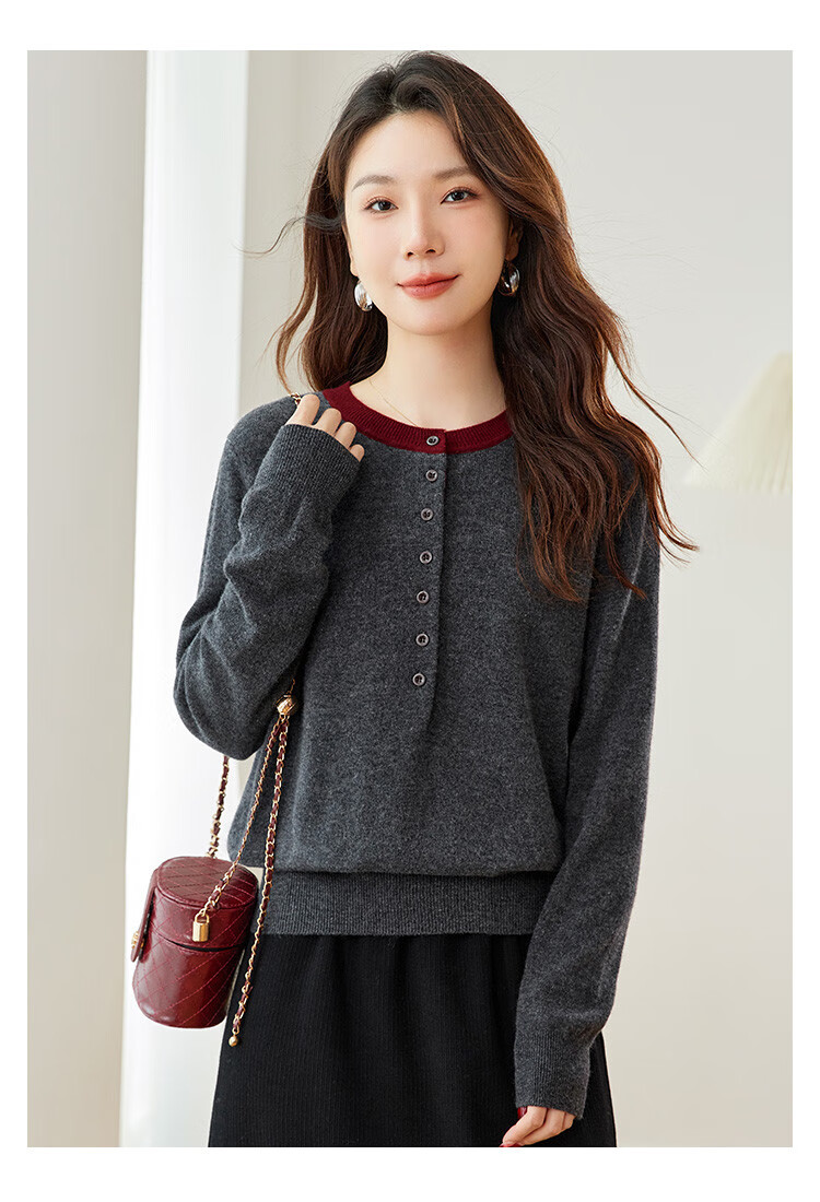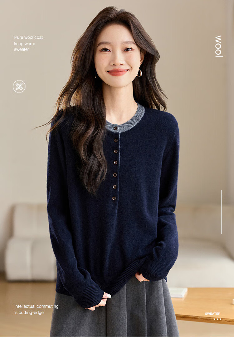 Shexi (Srcr) fake two-piece pure wool sweater for women, 100% wool inner layer, autumn and winter short loose contrasting color knitted sweater