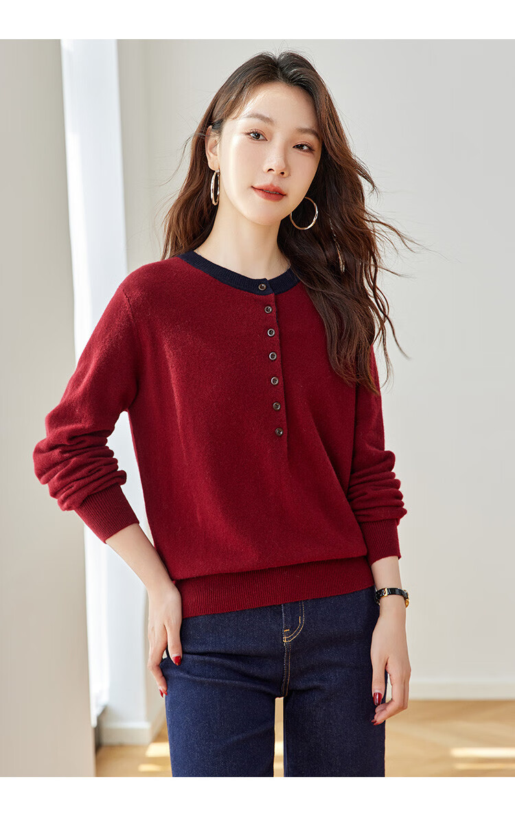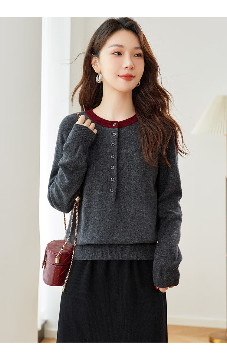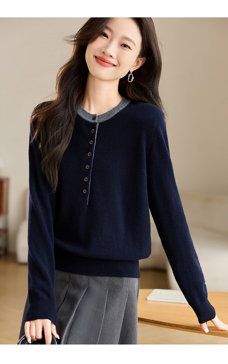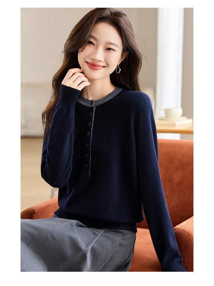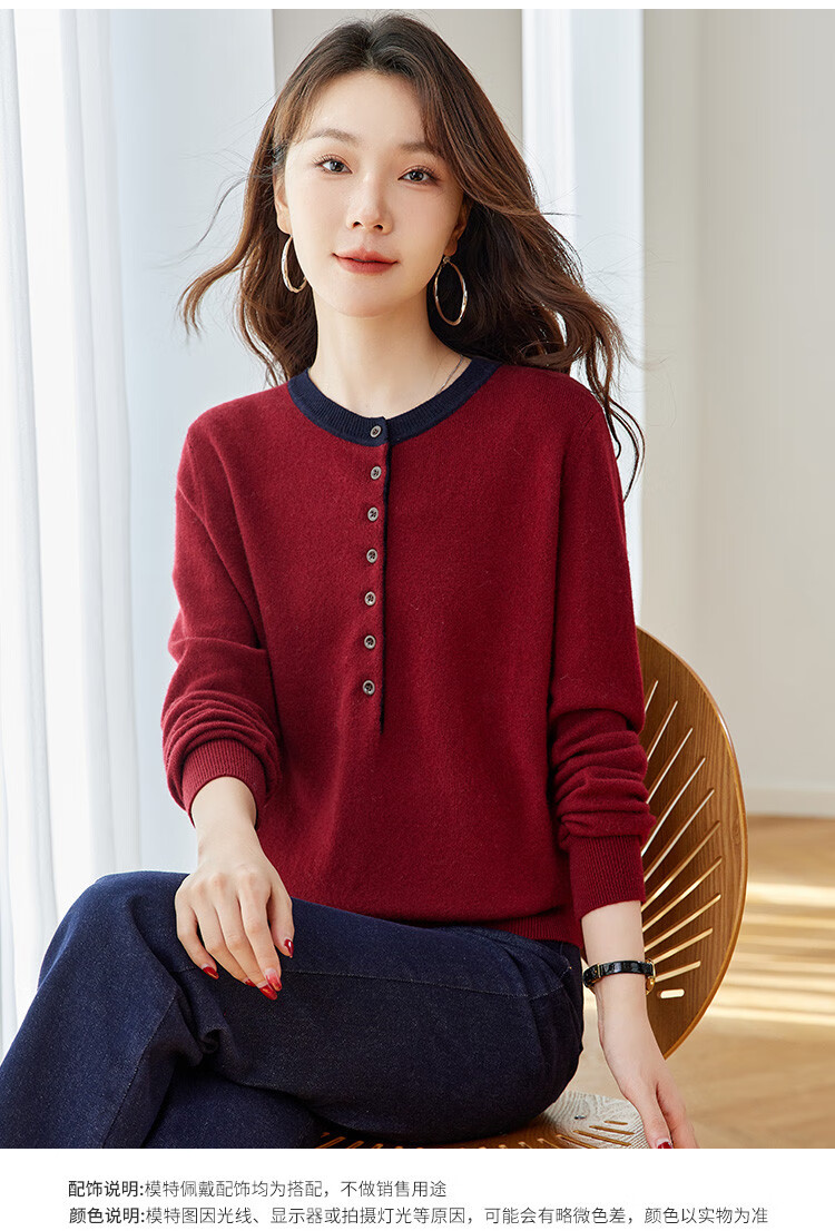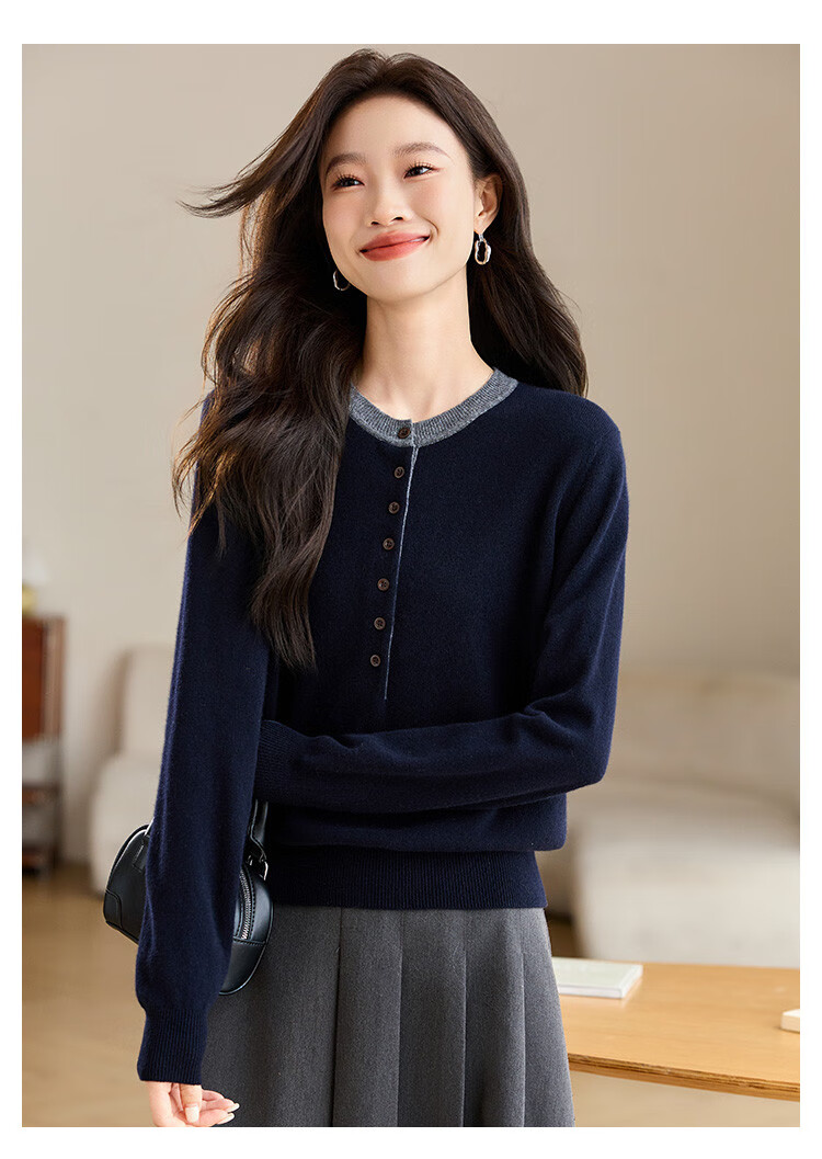 Shexi (Srcr) fake two-piece pure wool sweater for women, 100% wool inner layer, autumn and winter short loose contrasting color knitted sweater