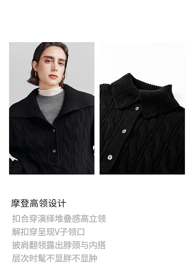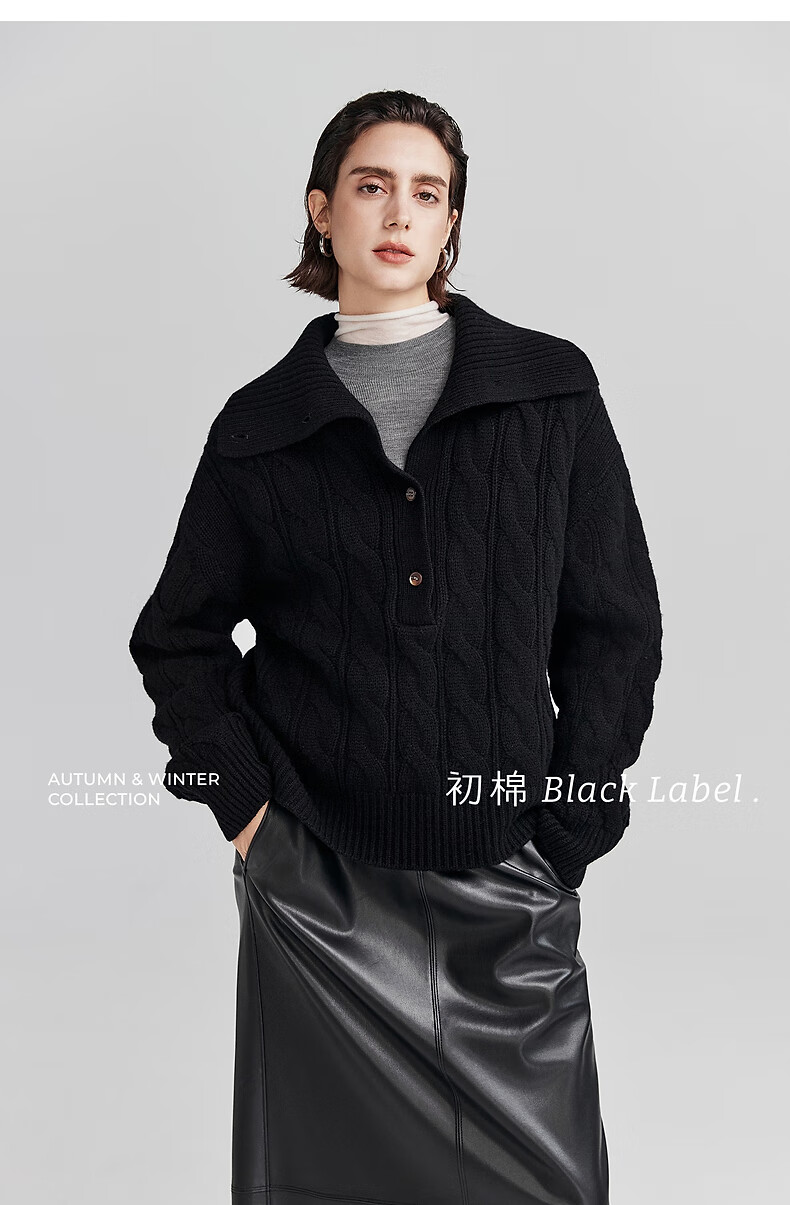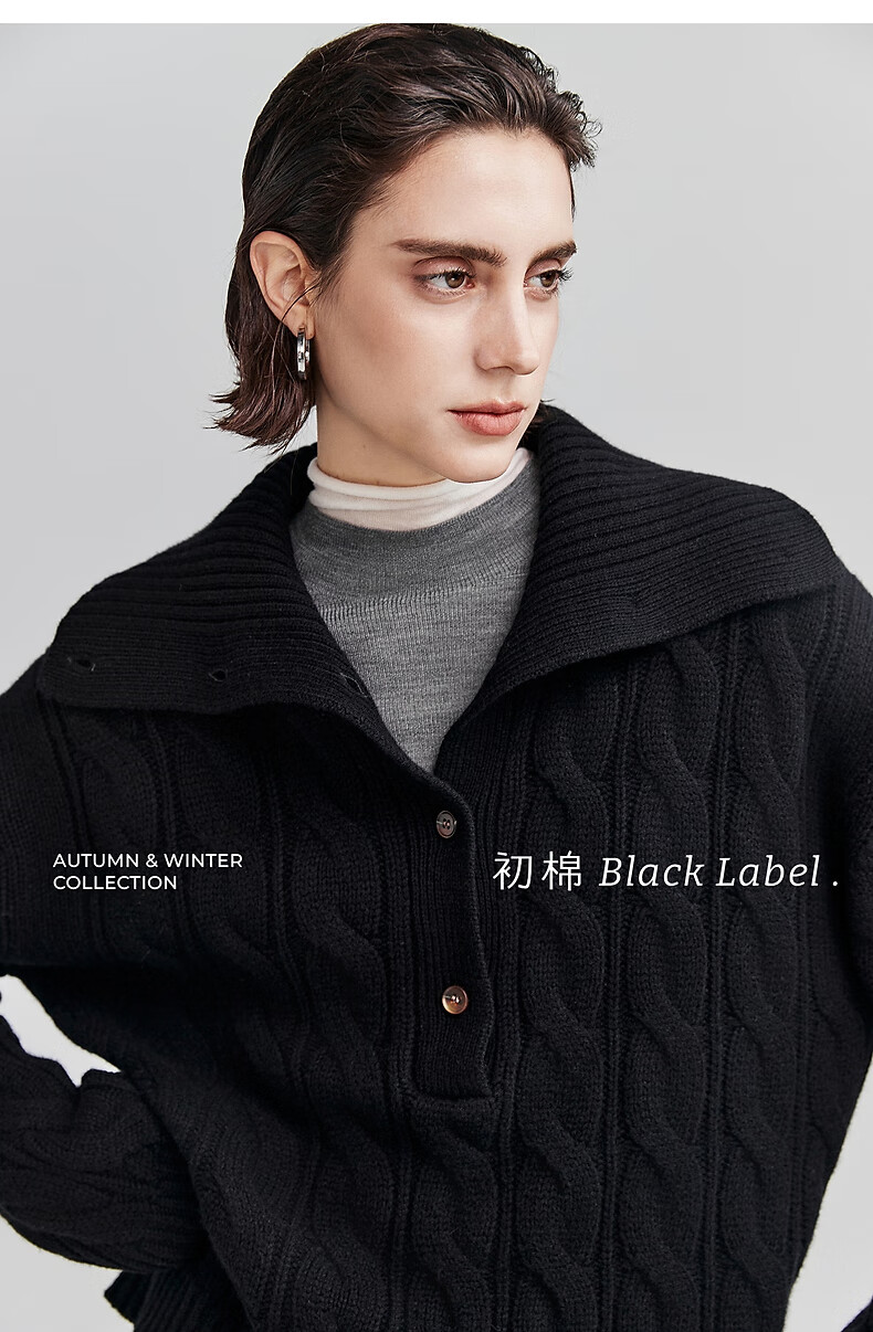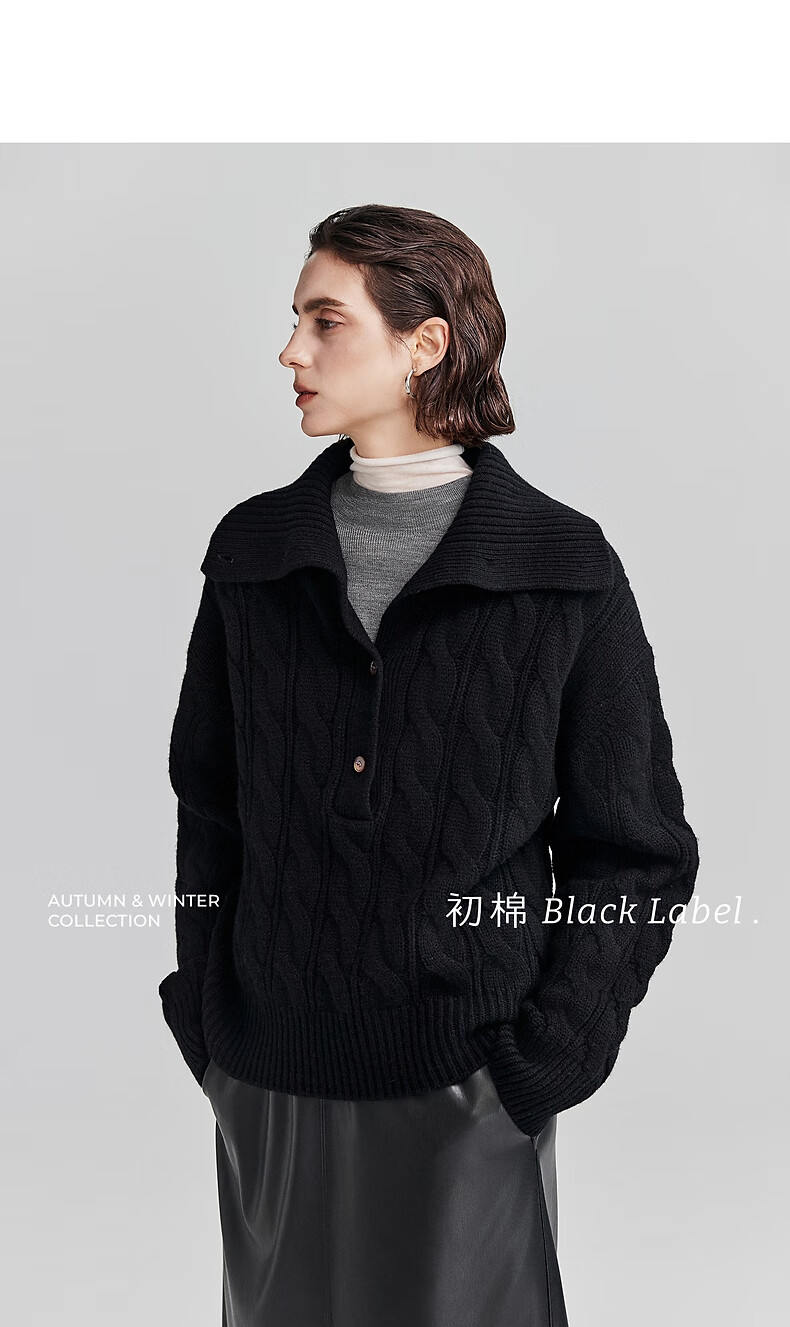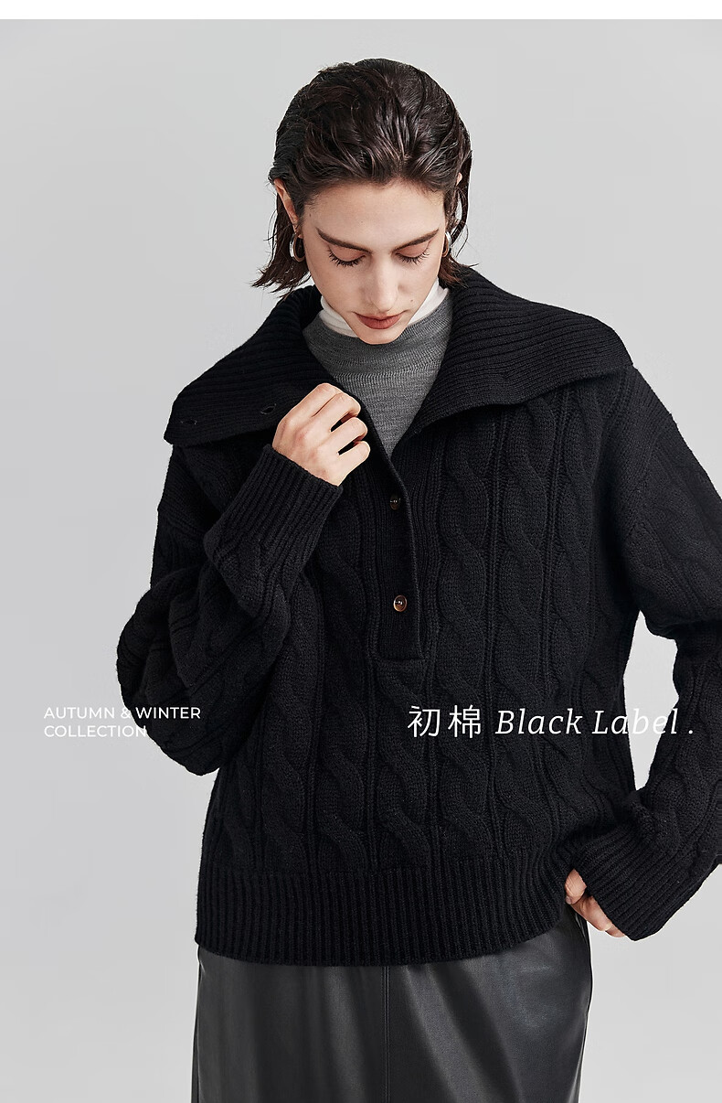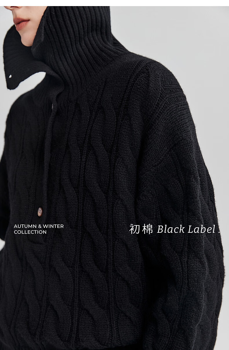 Chumian Black Label Hot Cocoa Chumian Large Lapel Cable Sweater for Women 25 Autumn and Winter Half Cardigan Knitted Sweater Retro Black S