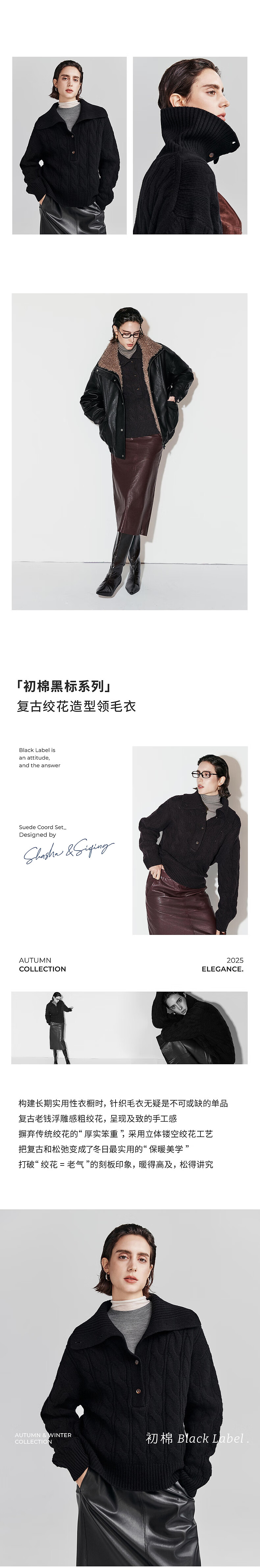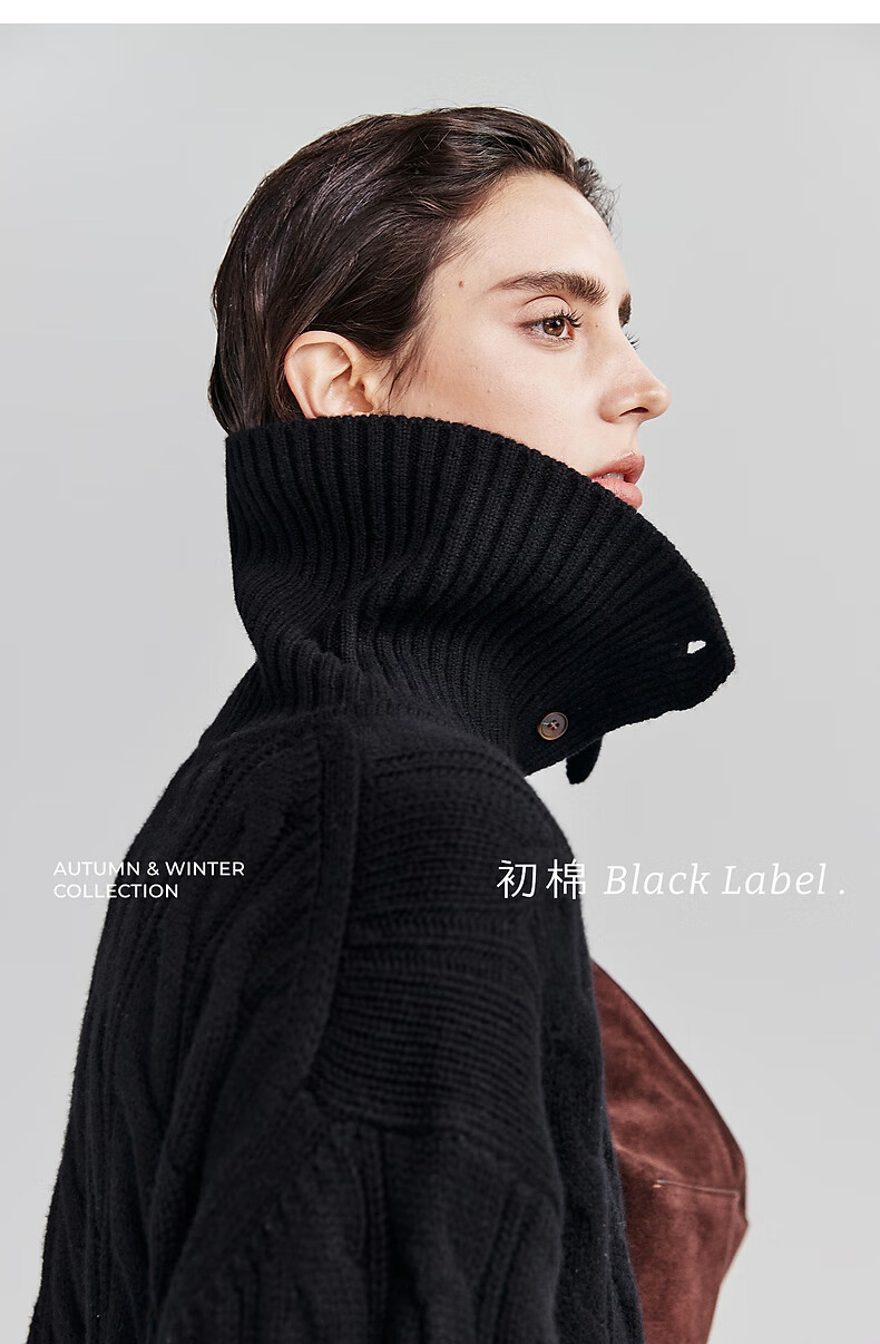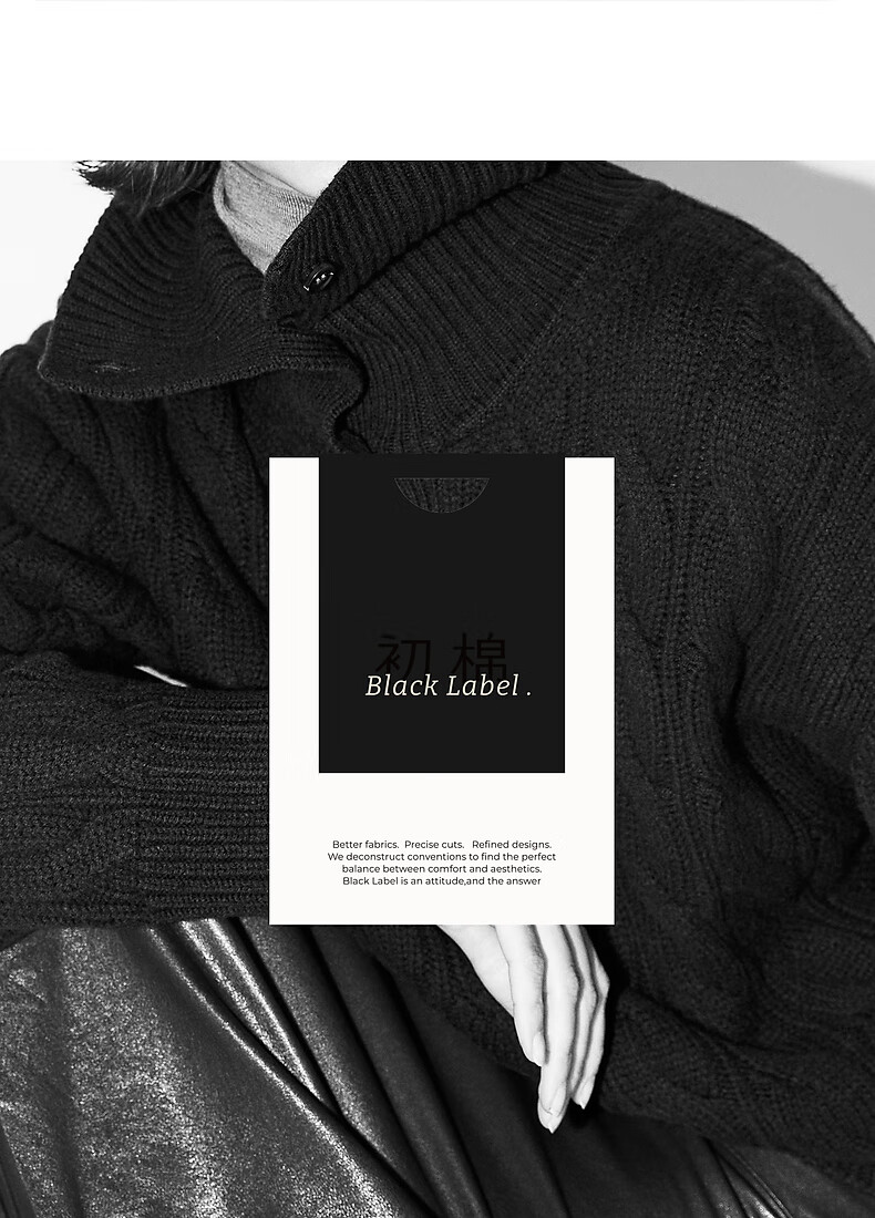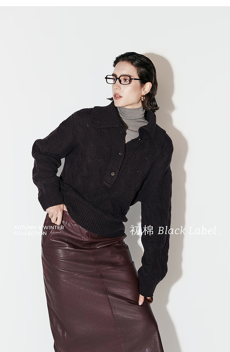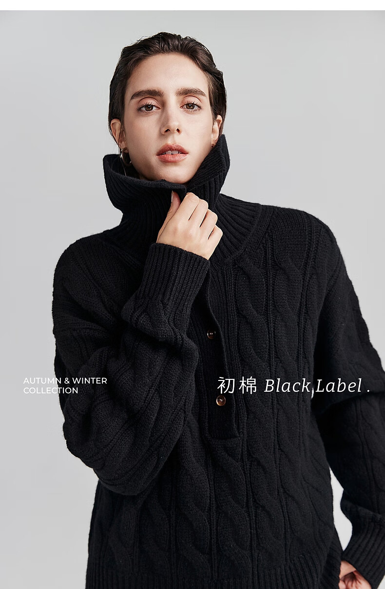 Chumian Black Label Hot Cocoa Chumian Large Lapel Cable Sweater for Women 25 Autumn and Winter Half Cardigan Knitted Sweater Retro Black S