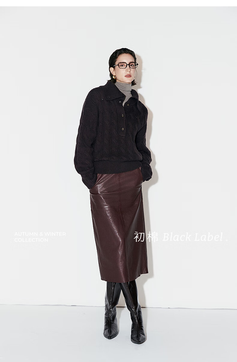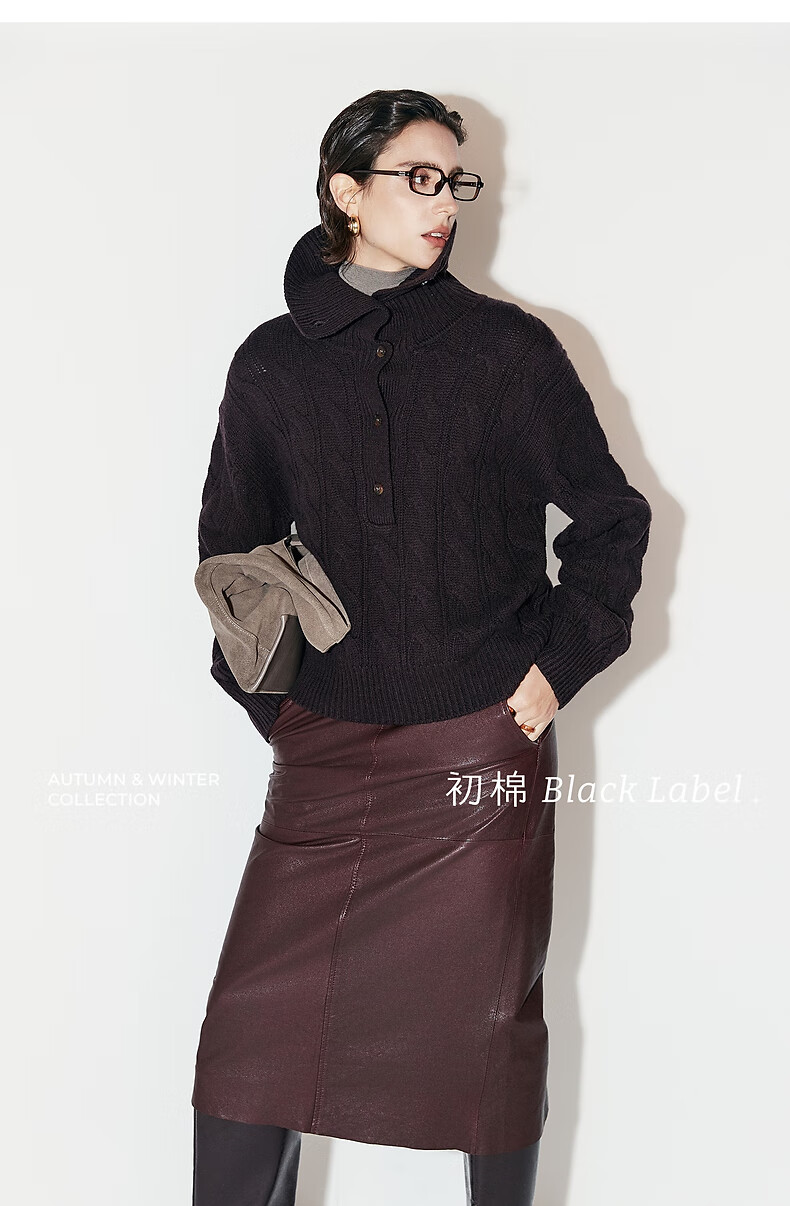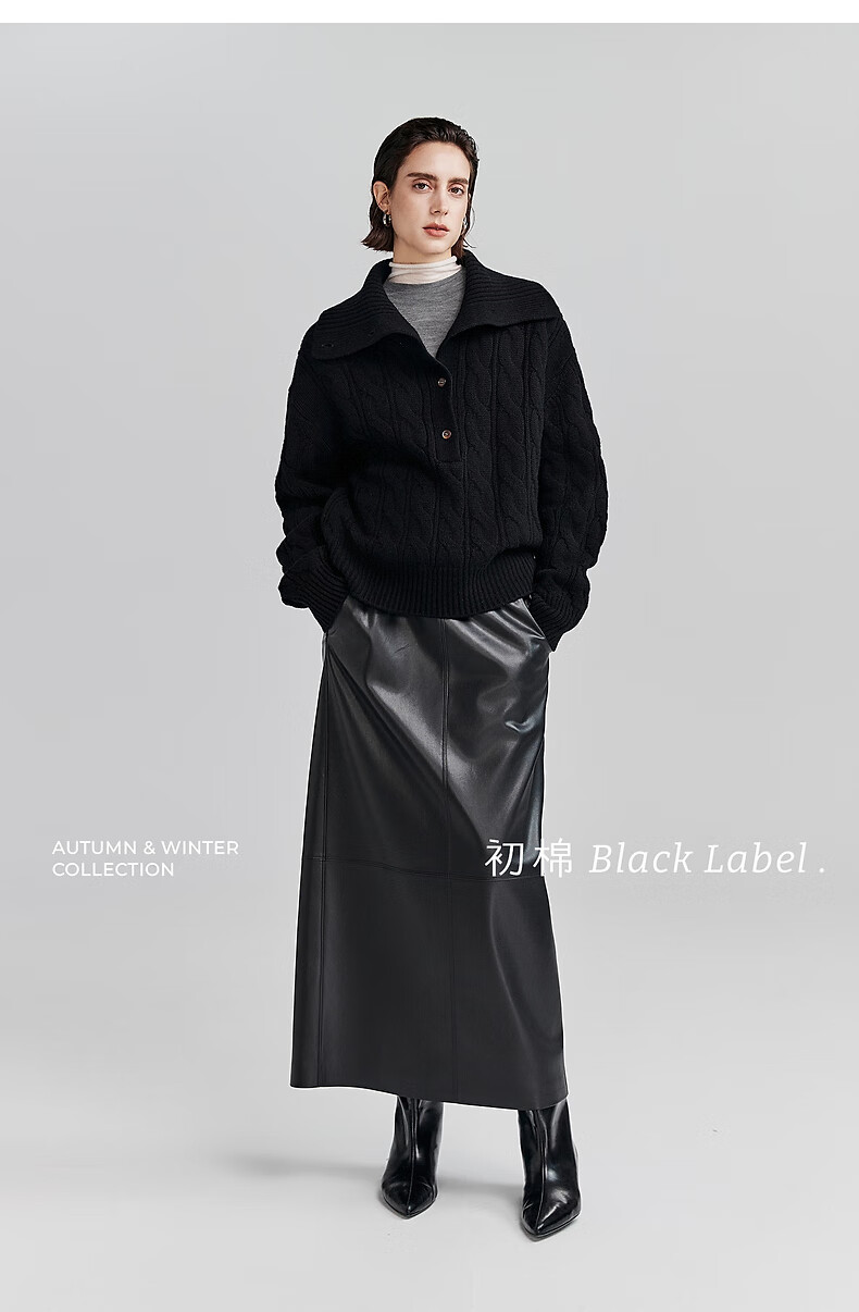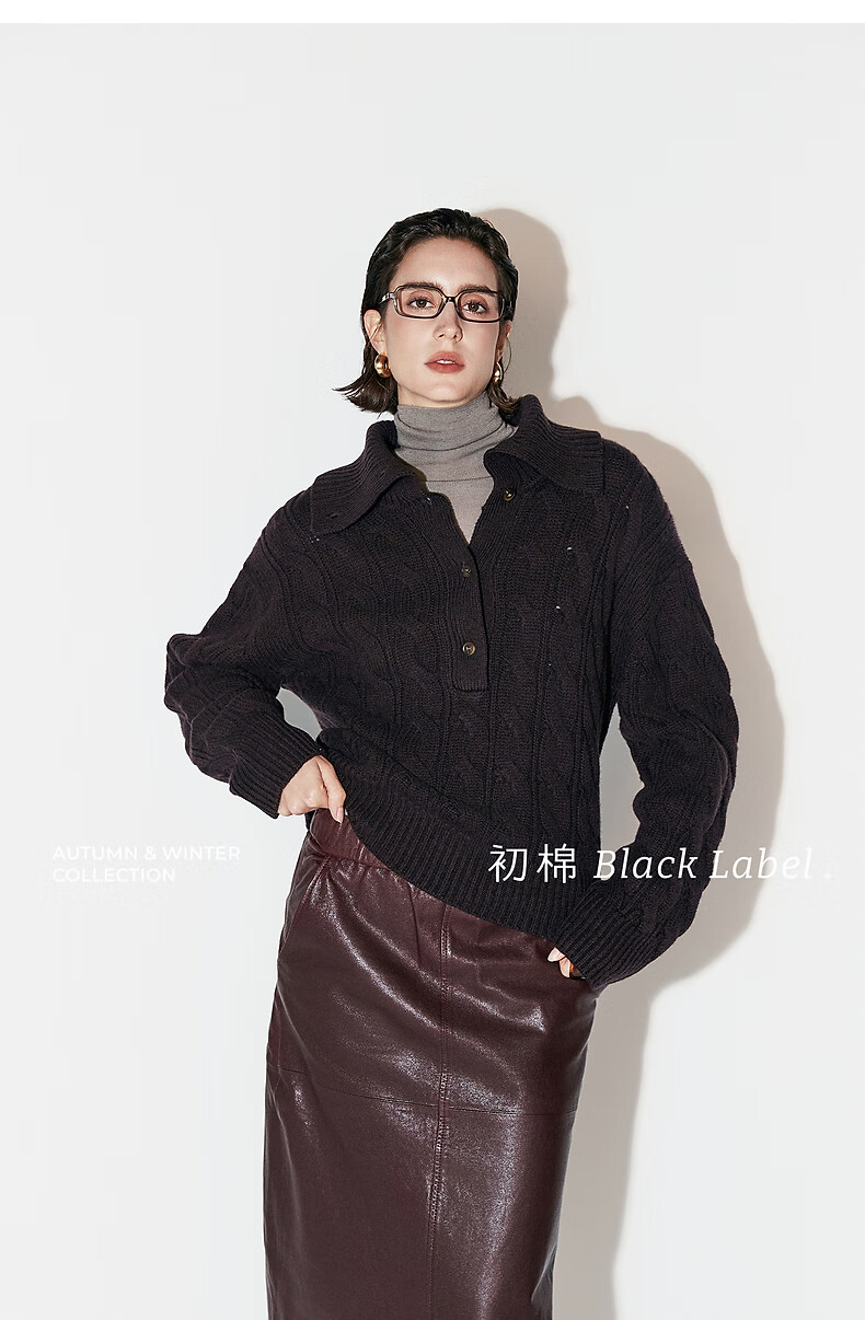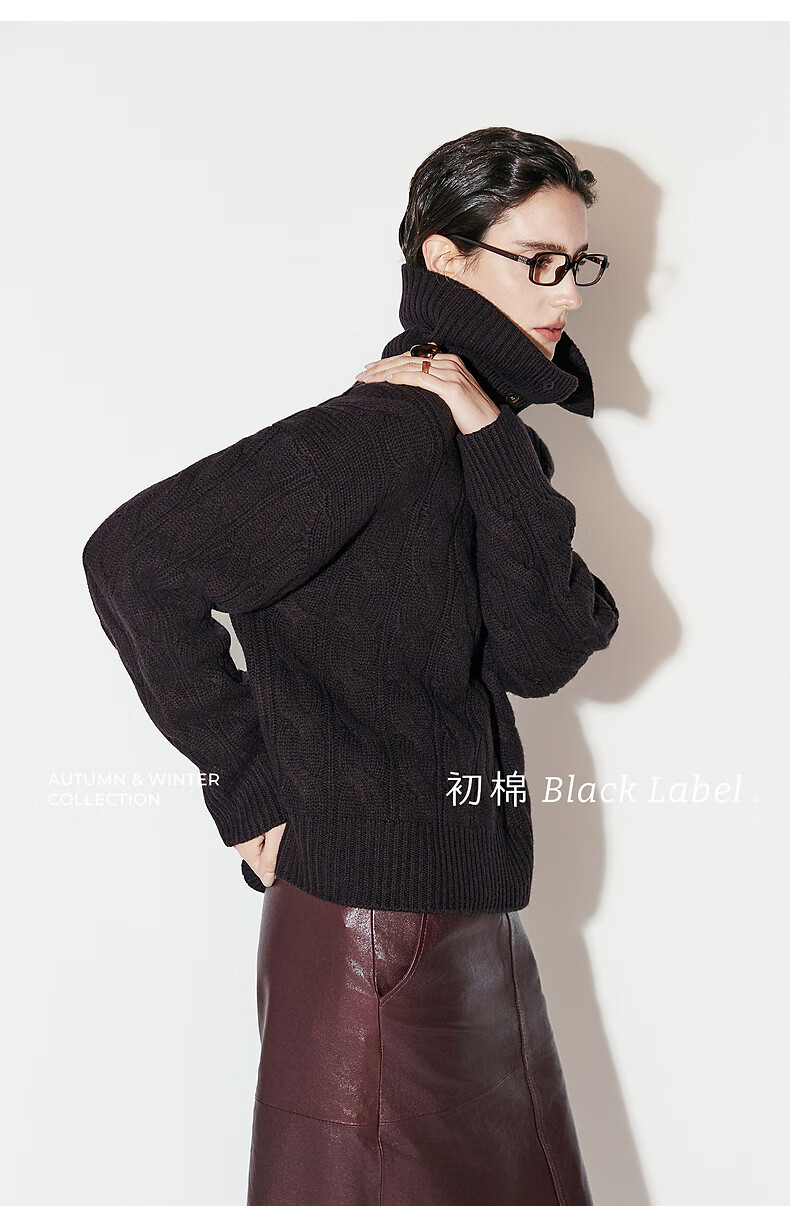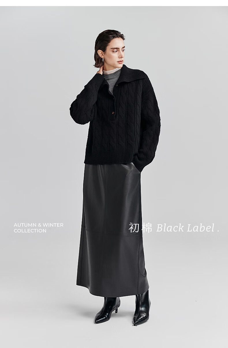 Chumian Black Label Hot Cocoa Chumian Large Lapel Cable Sweater for Women 25 Autumn and Winter Half Cardigan Knitted Sweater Retro Black S