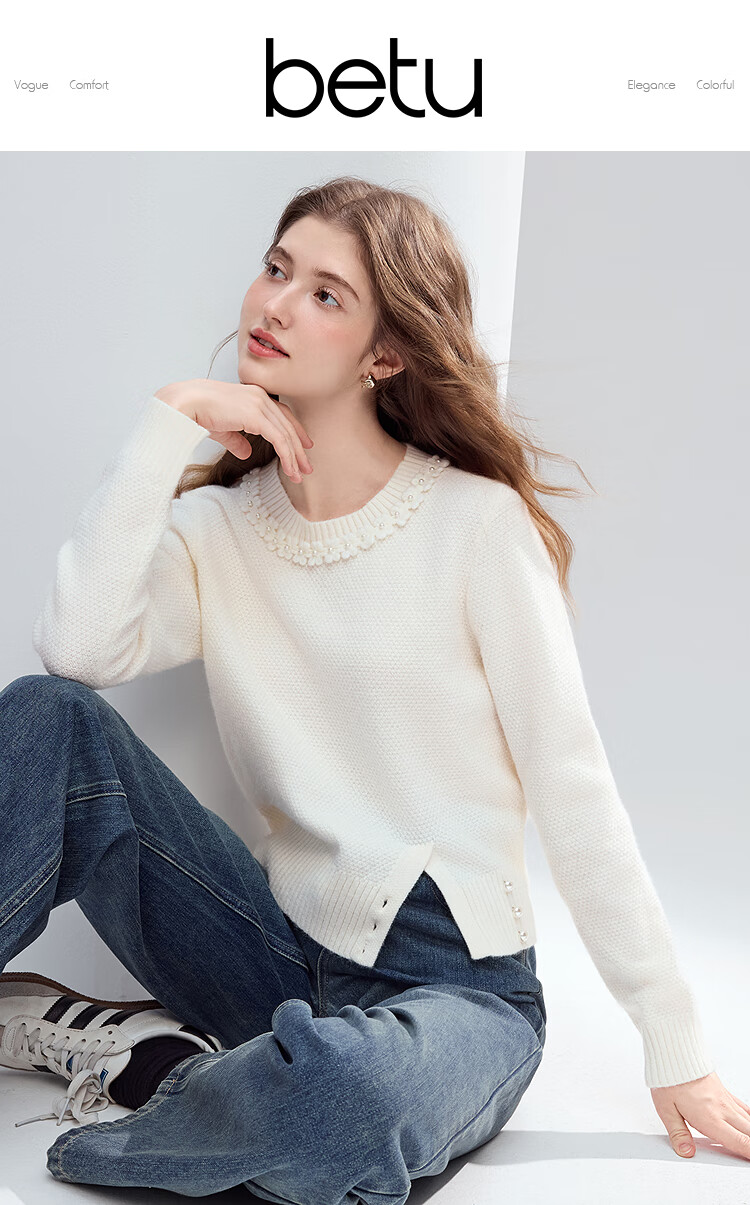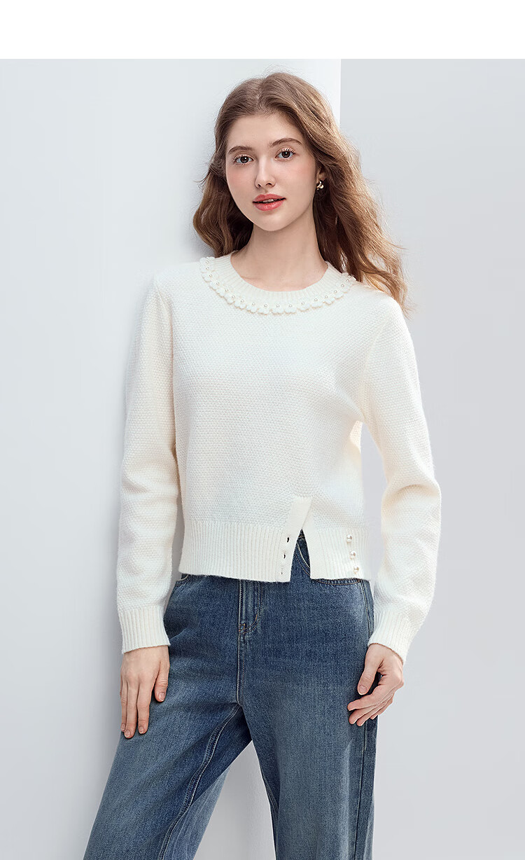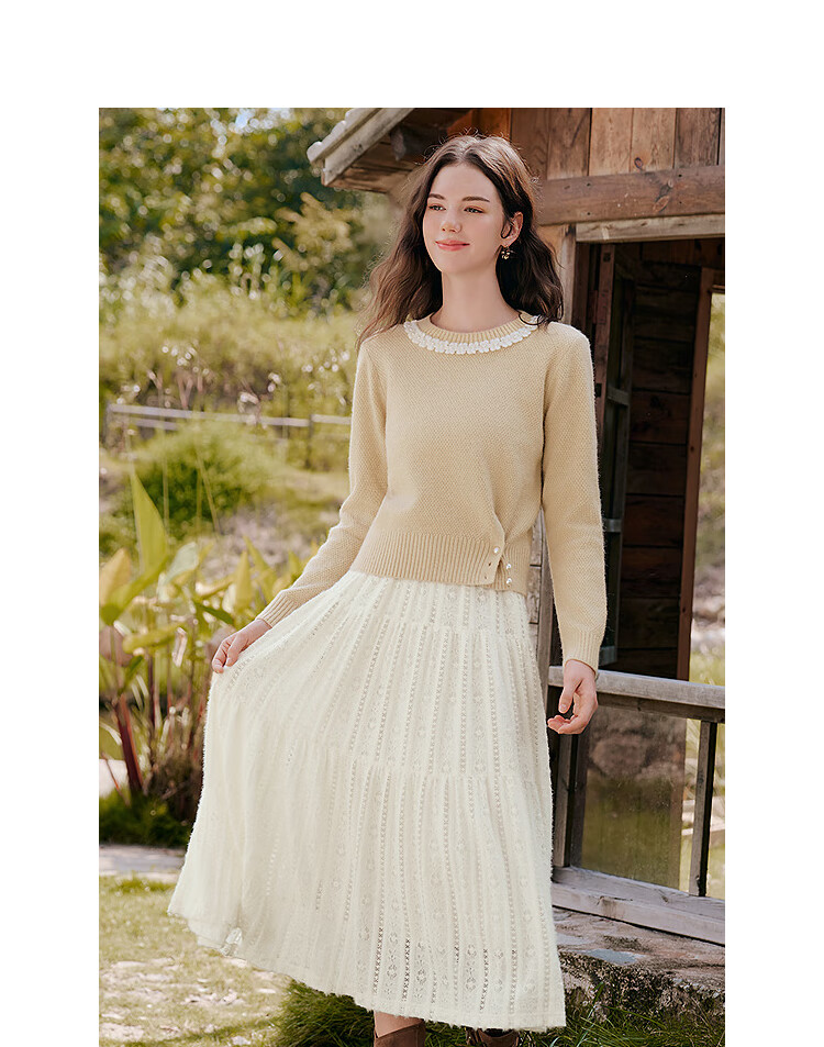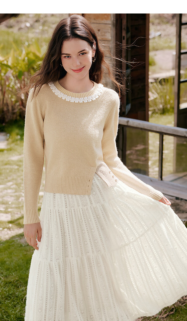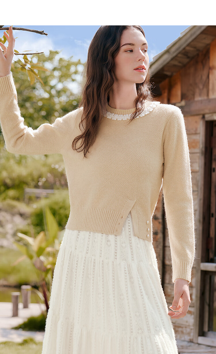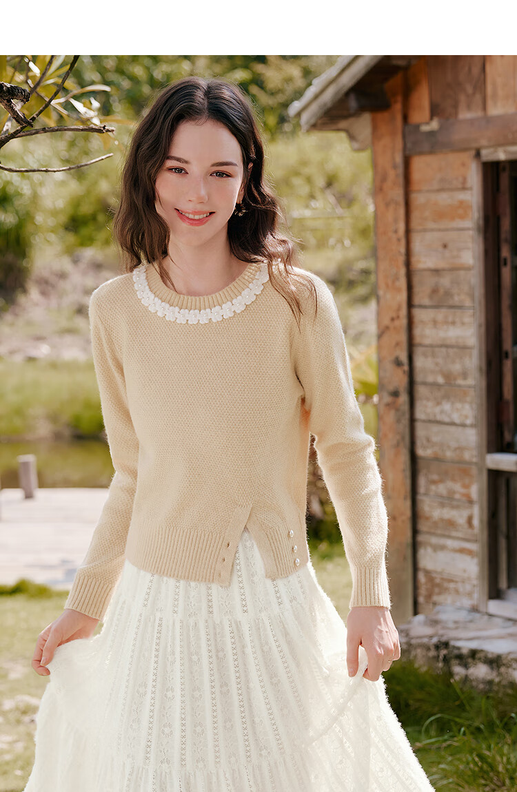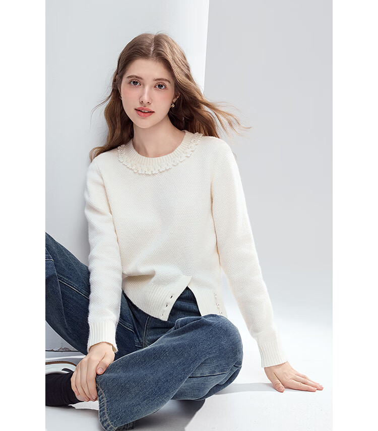Betu women's 2025 winter new sweater neckline lace slit design gentle simple top women 2510T36 off-white L