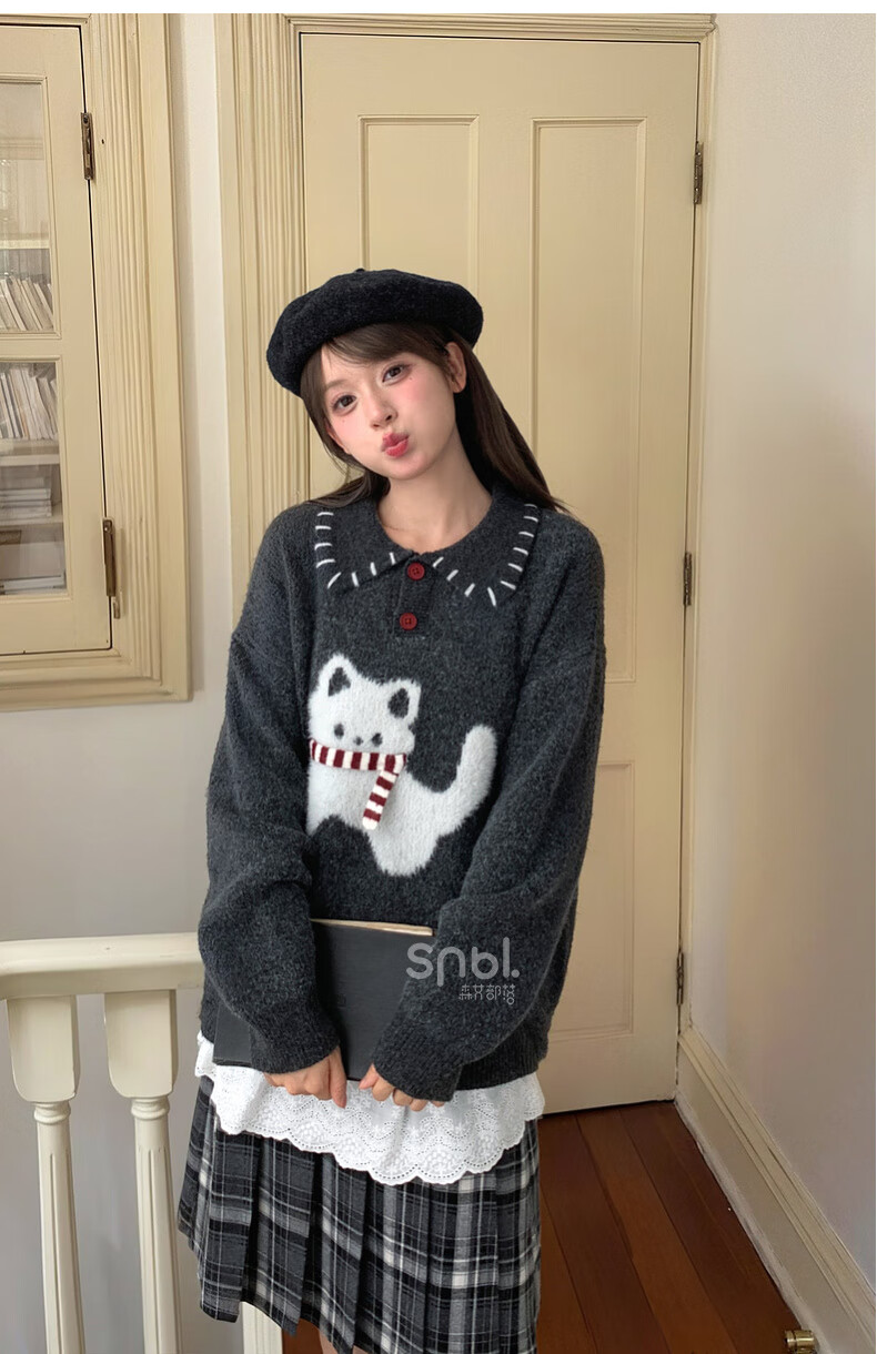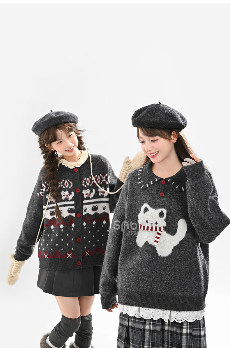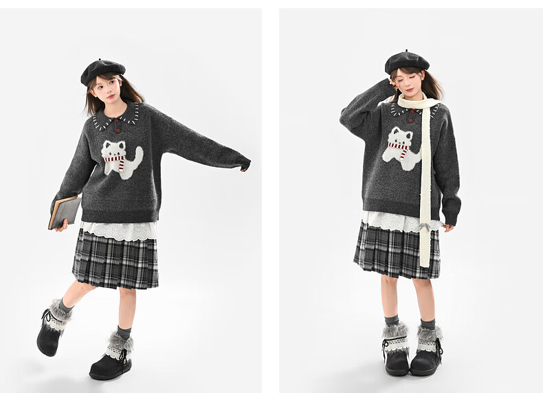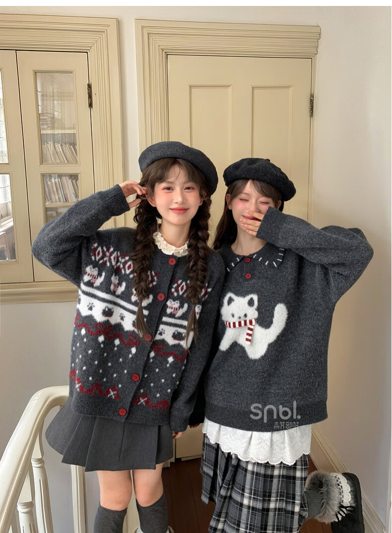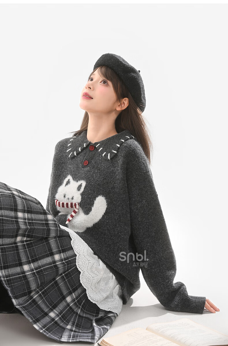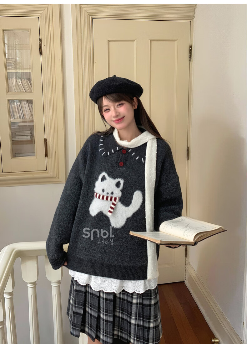 Mori tribe autumn and winter gray sweater for women 2025 new sweet style cat design versatile loose sweater dark gray pullover S model size