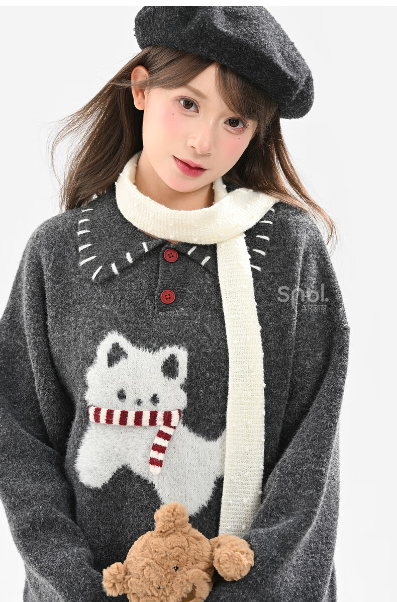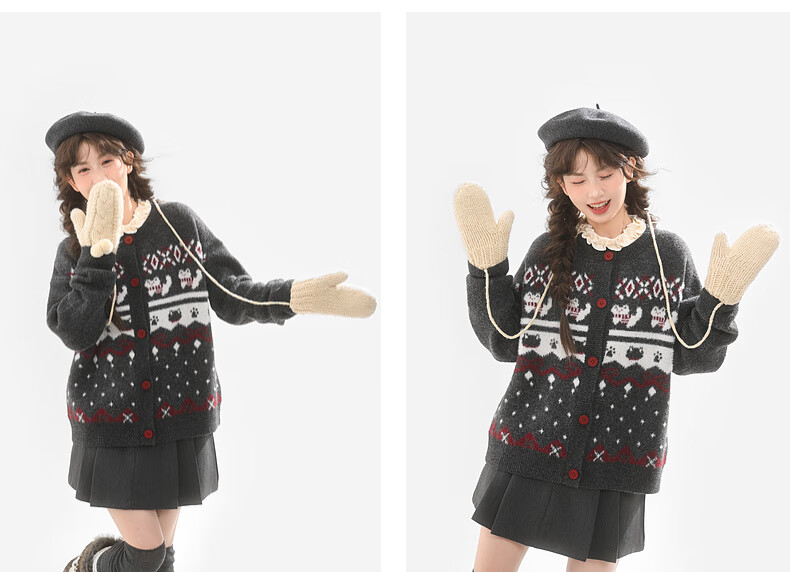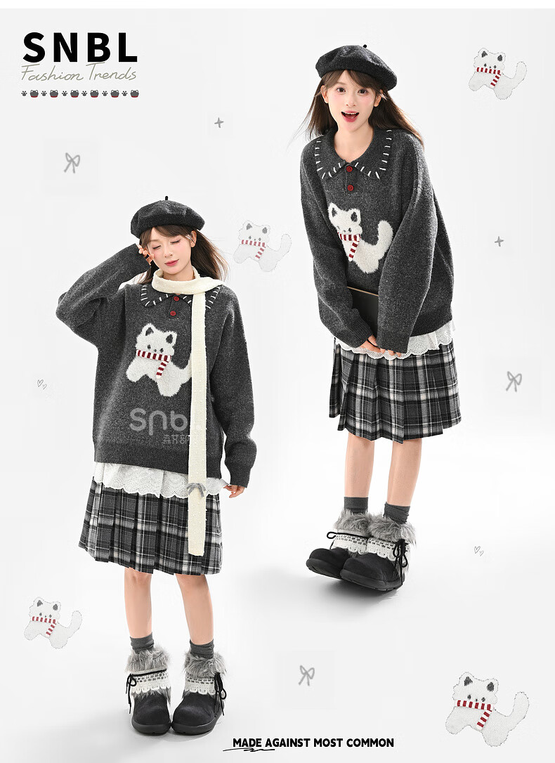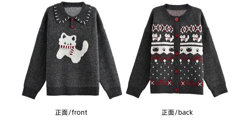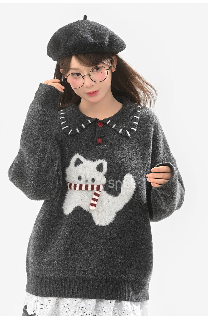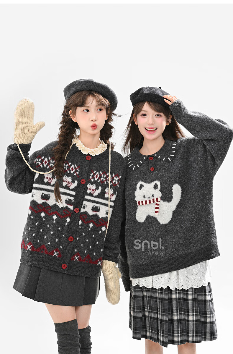 Mori tribe autumn and winter gray sweater for women 2025 new sweet style cat design versatile loose sweater dark gray pullover S model size