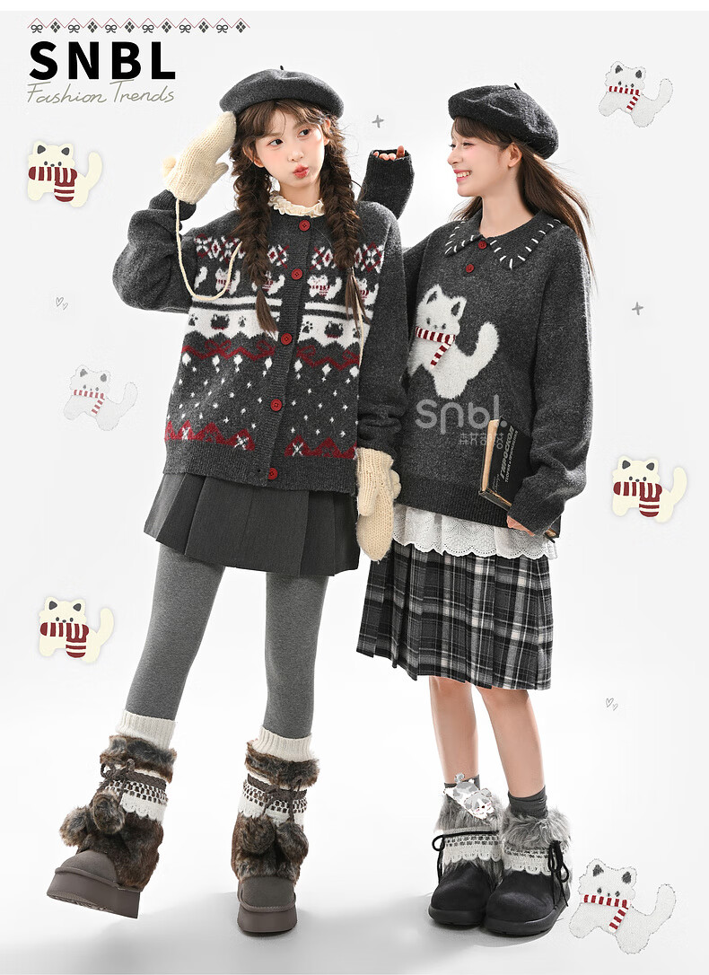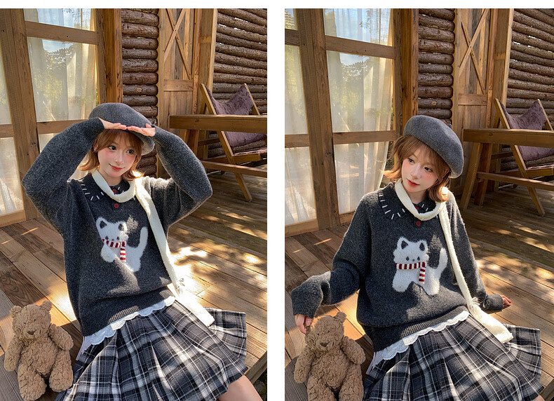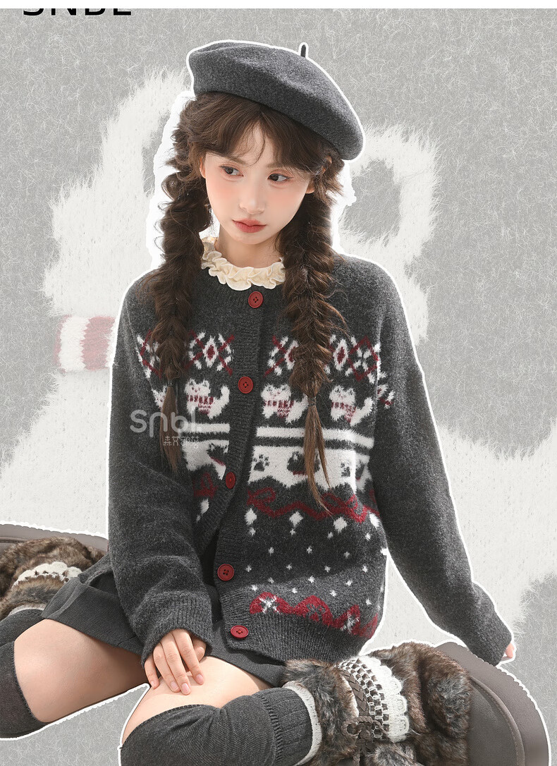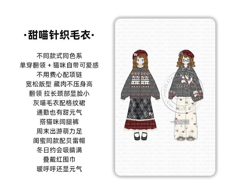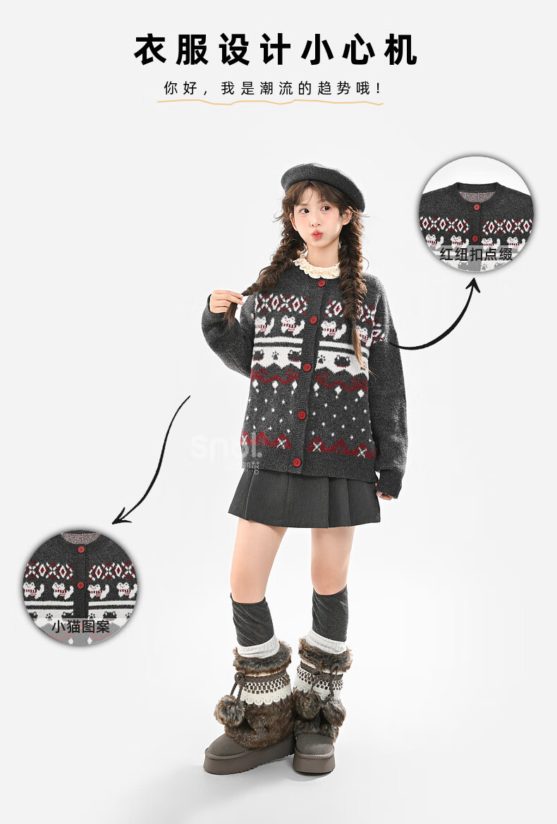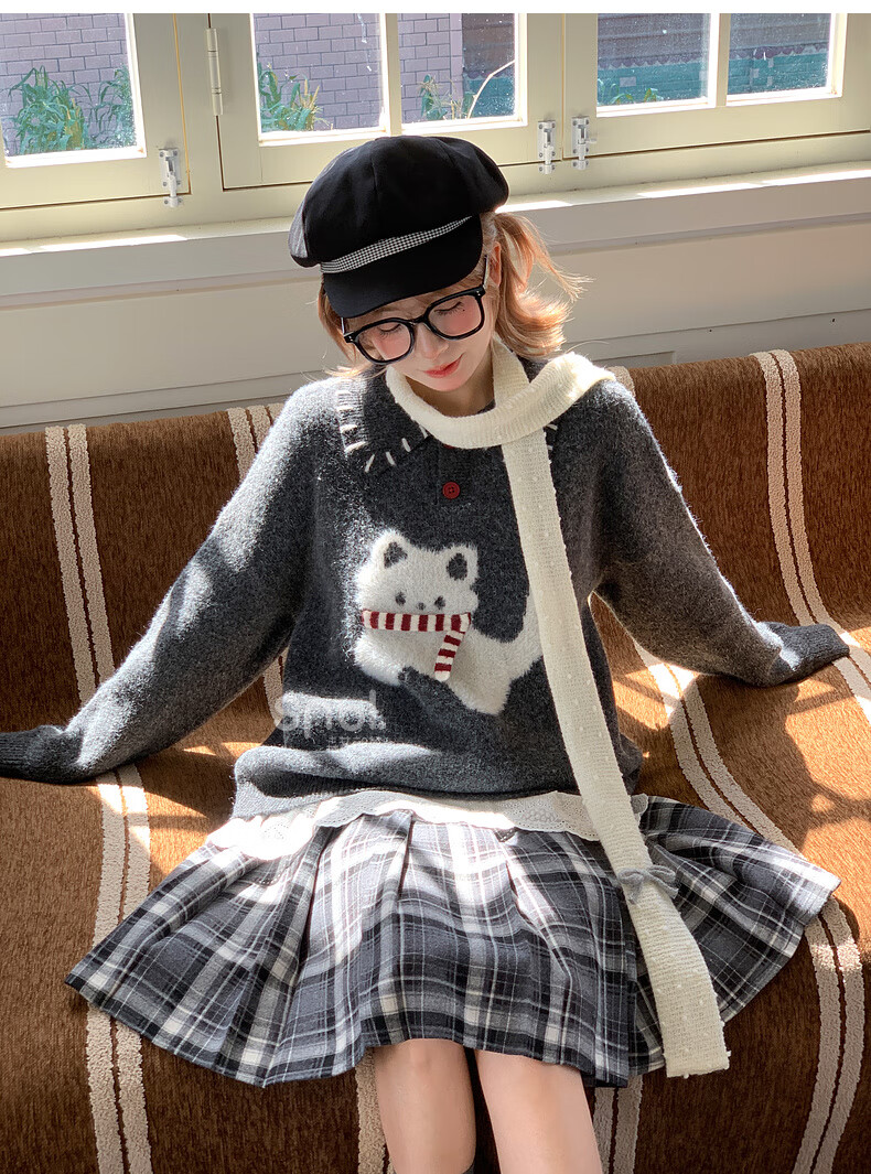 Mori tribe autumn and winter gray sweater for women 2025 new sweet style cat design versatile loose sweater dark gray pullover S model size