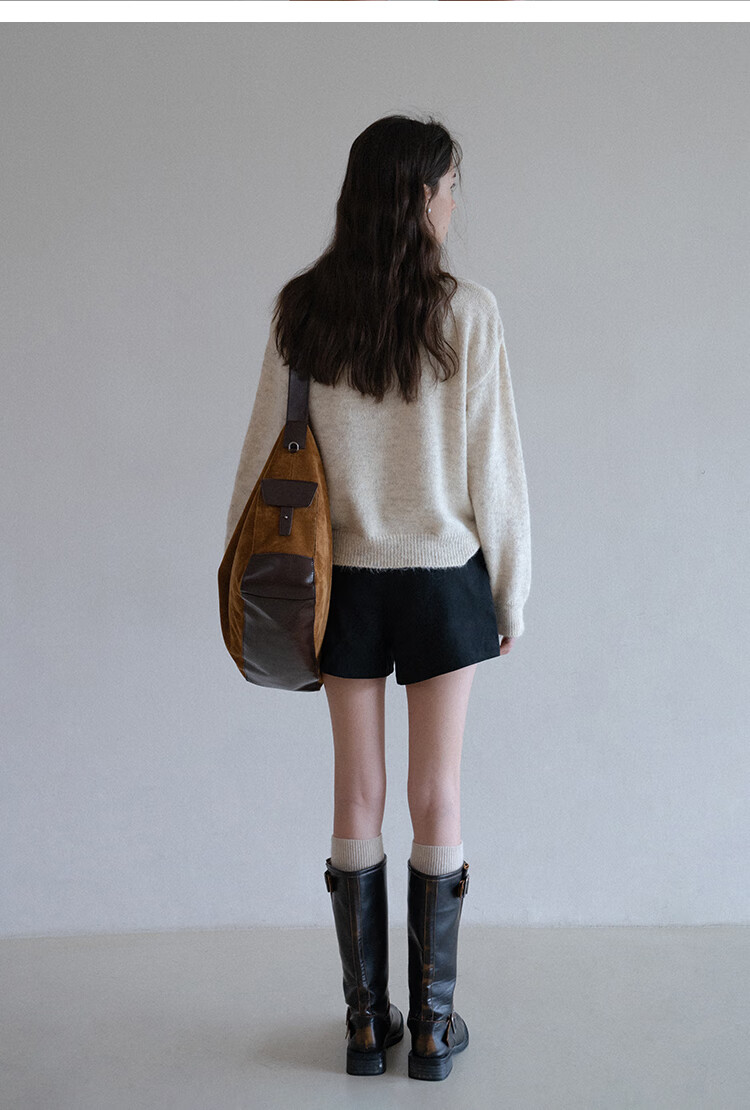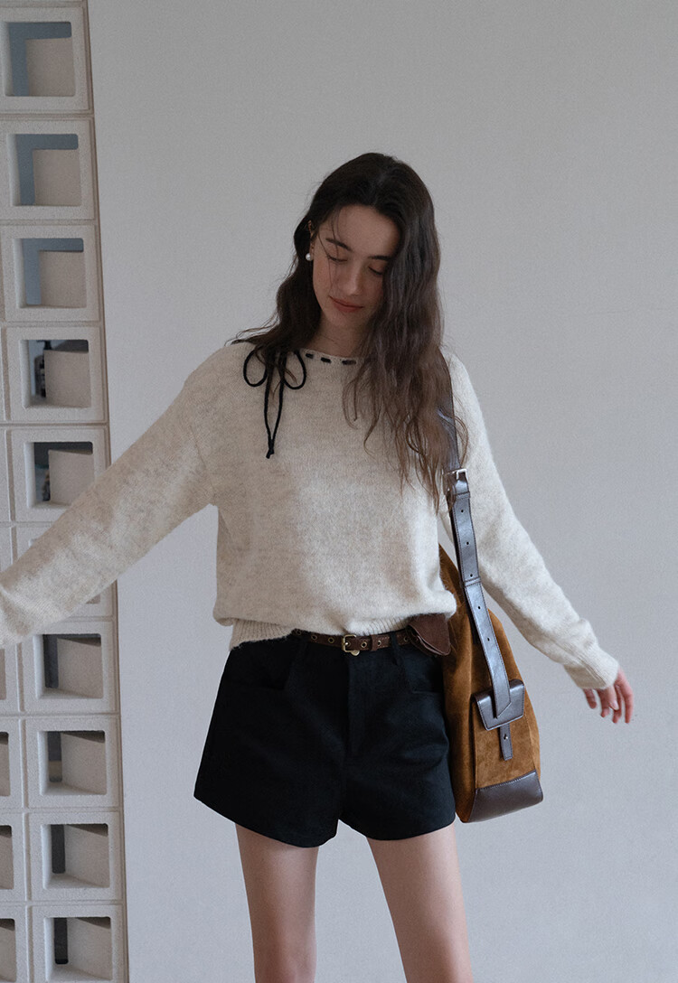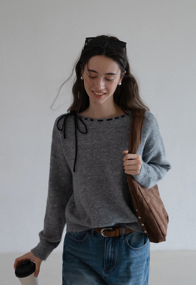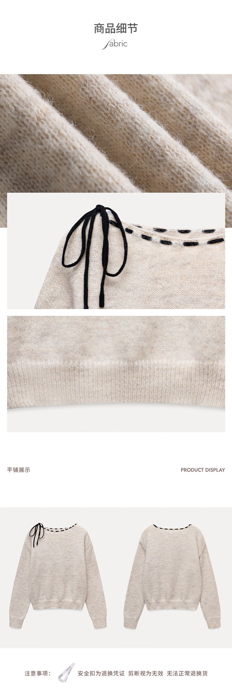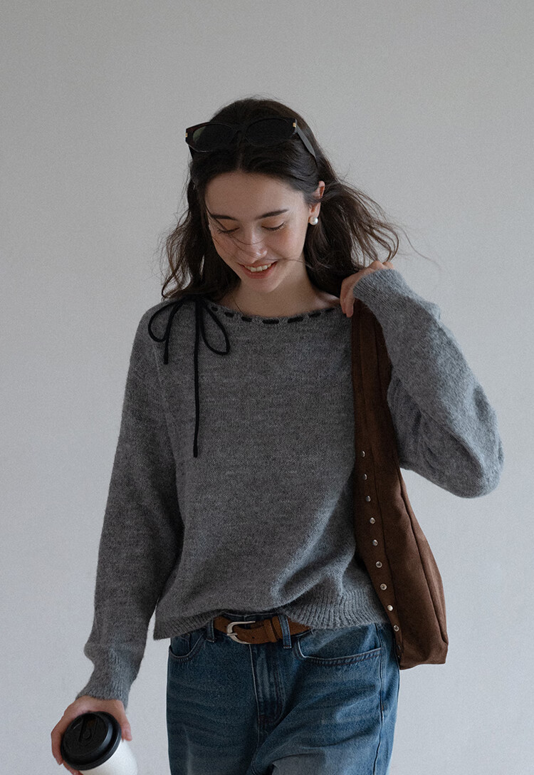 EGGKA Round Neck Rope Lace Furry Variegated Short Sweater Lazy Long Sleeve Top E25A40128AF Dark Gray One Size