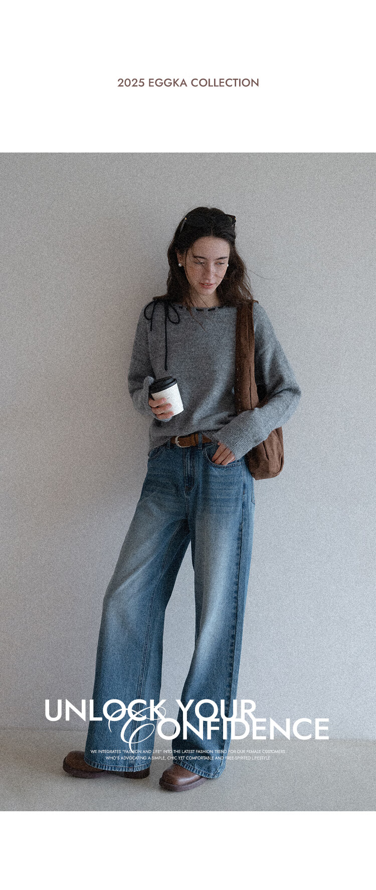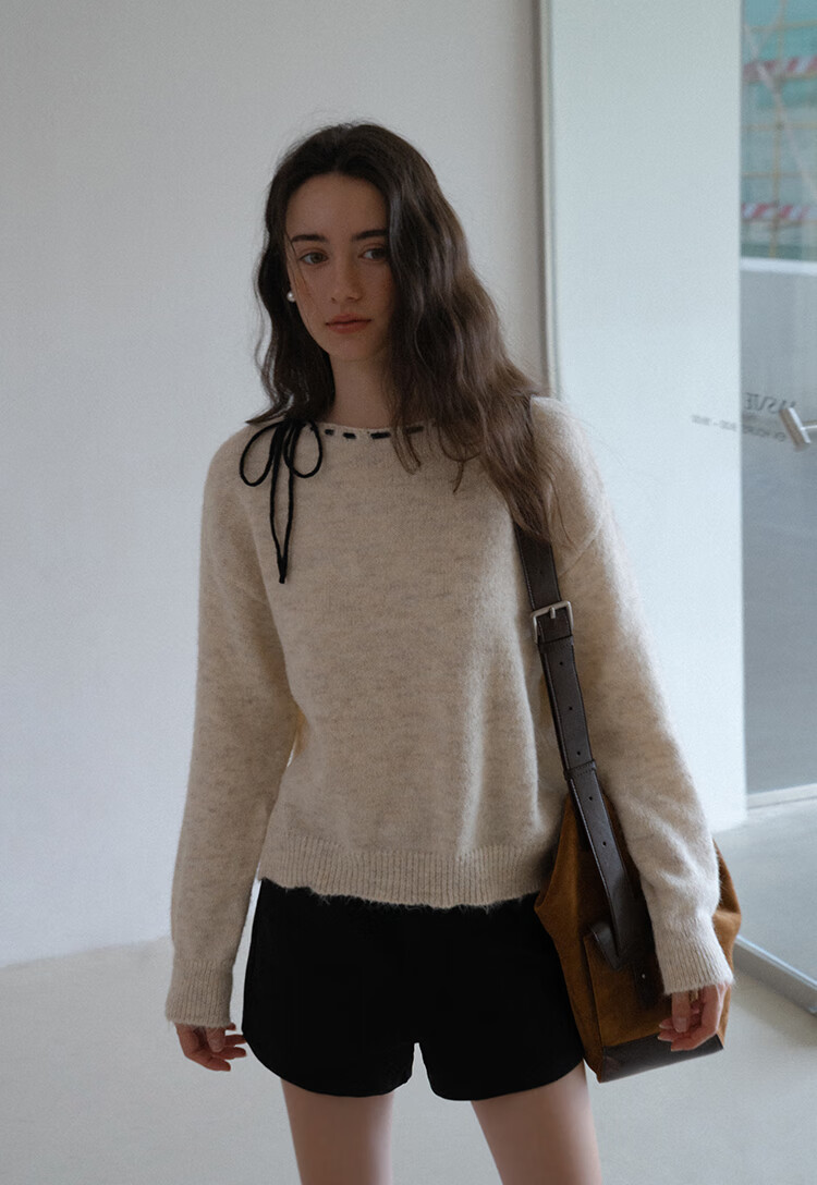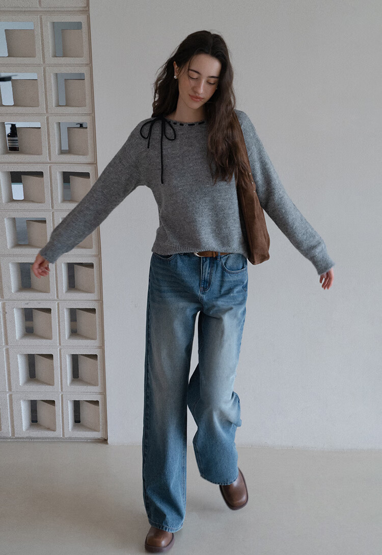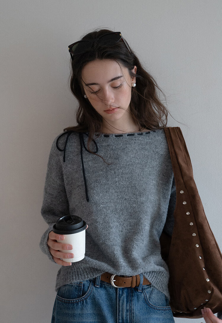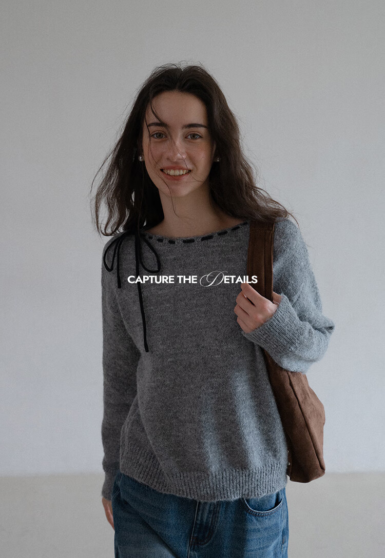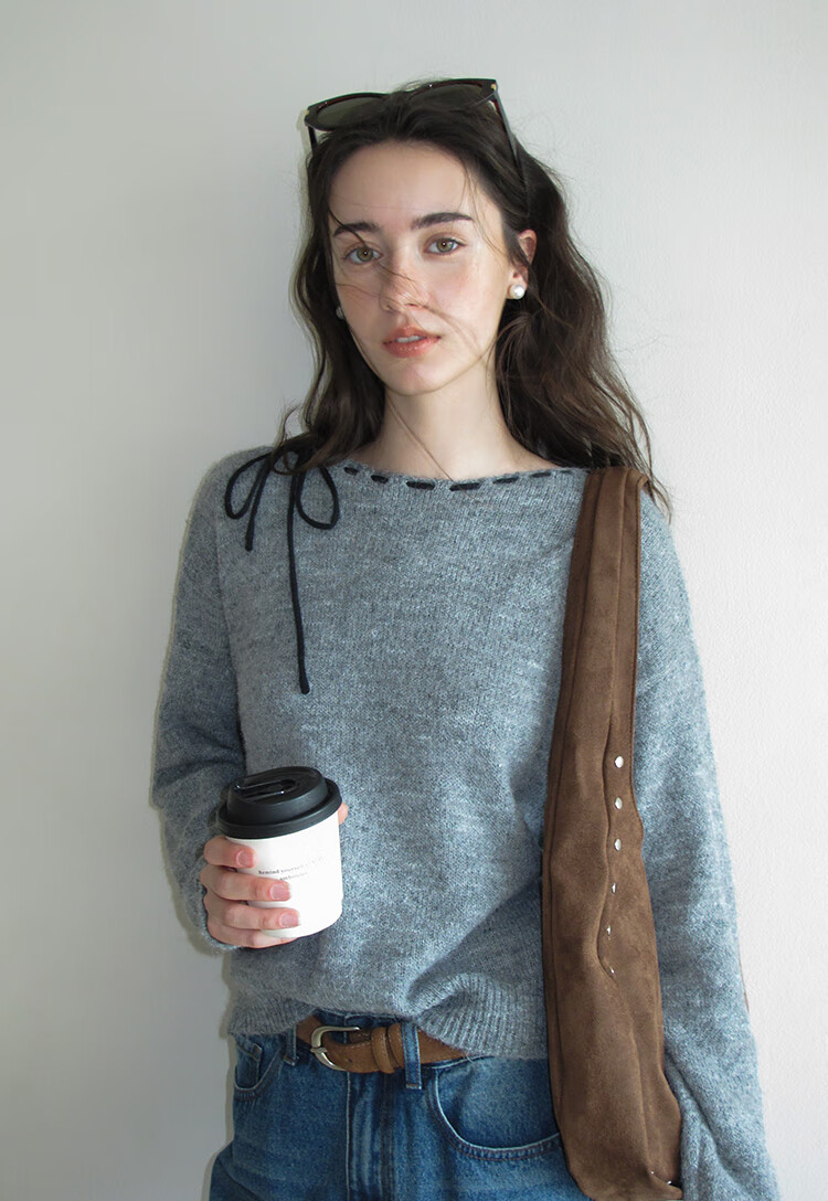 EGGKA Round Neck Rope Lace Furry Variegated Short Sweater Lazy Long Sleeve Top E25A40128AF Dark Gray One Size