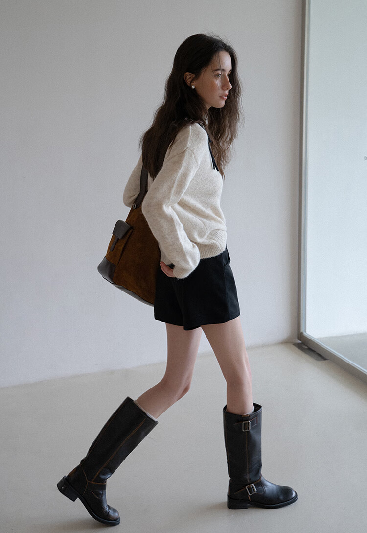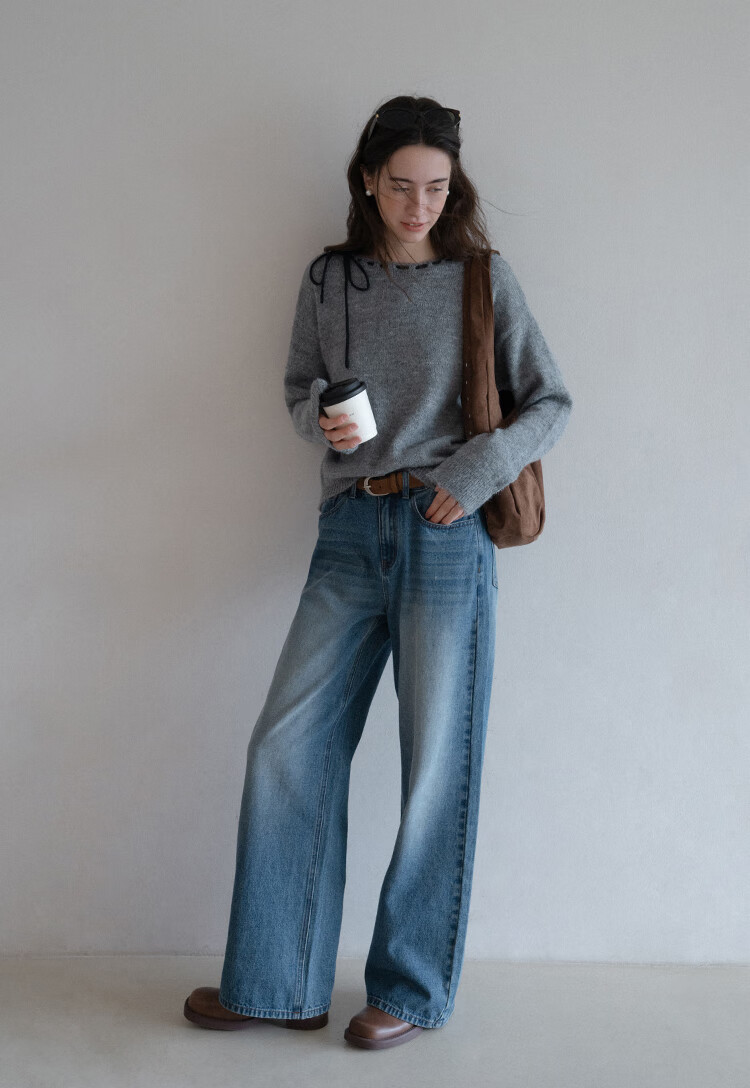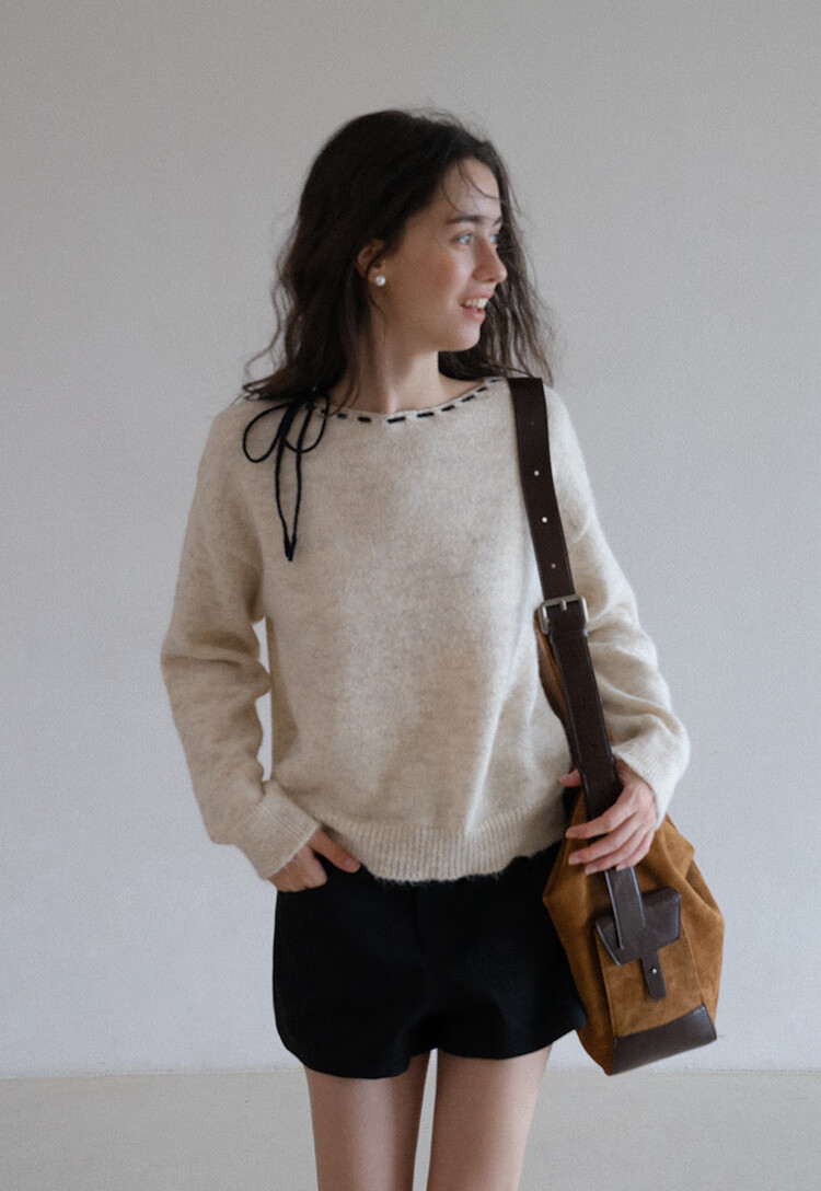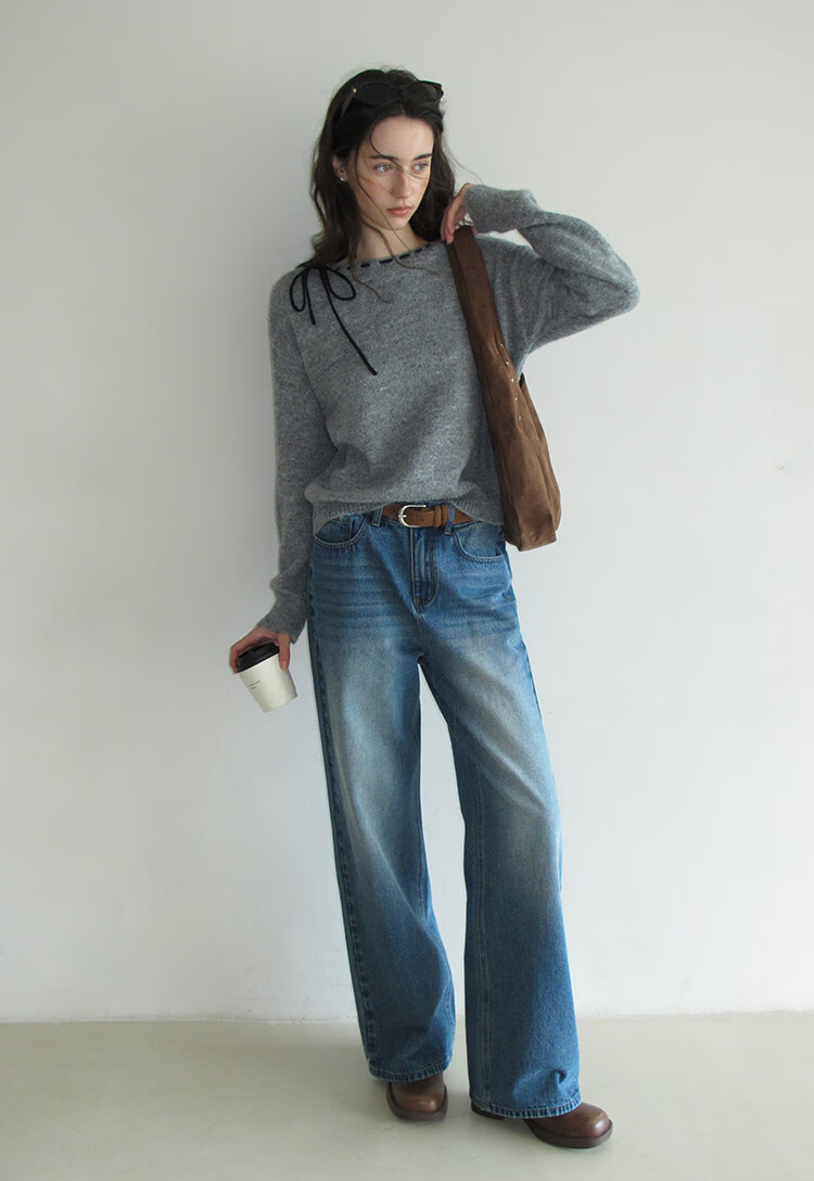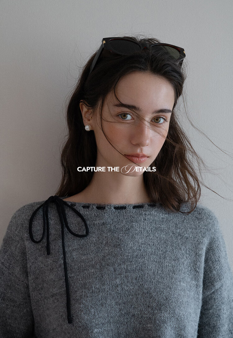 EGGKA Round Neck Rope Lace Furry Variegated Short Sweater Lazy Long Sleeve Top E25A40128AF Dark Gray One Size