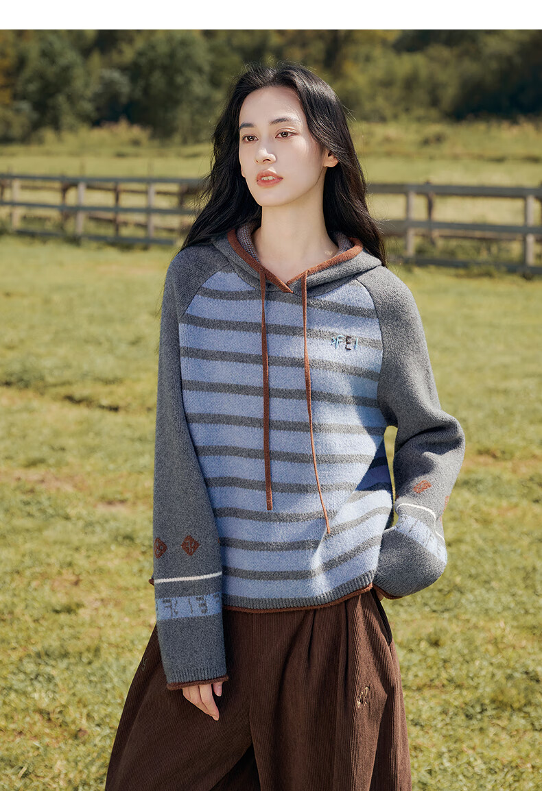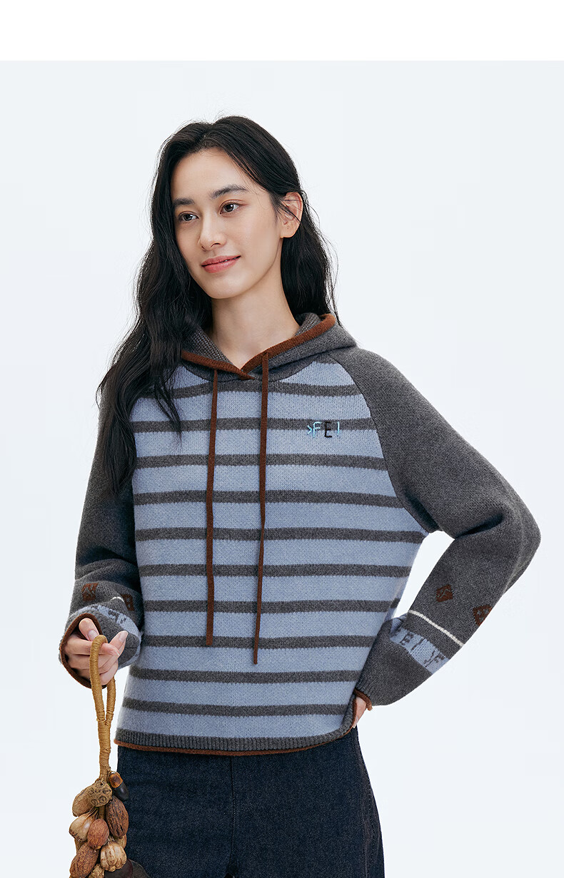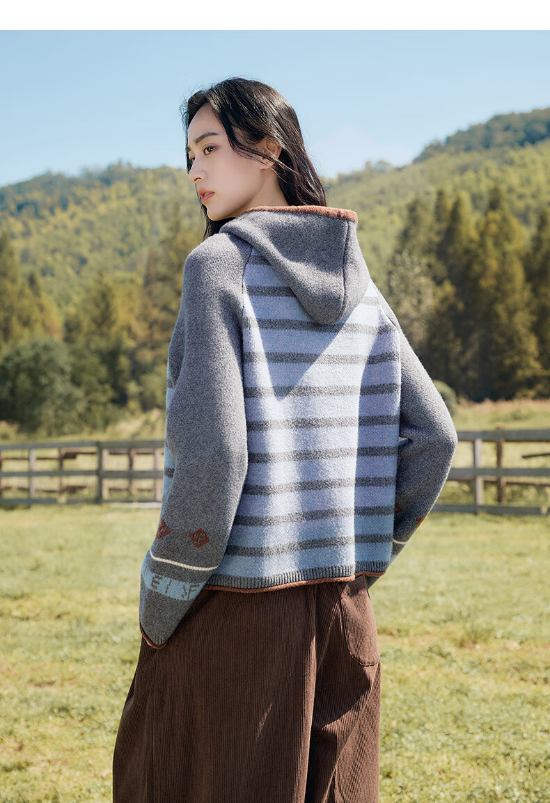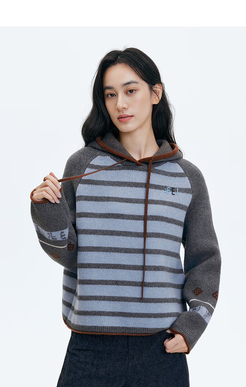 Birds and New Wine Spliced ​​Striped Colorful Gray Sweater Women's 2025 Winter New Slim Sweater Hoodie Striped Ash HNC02 Pre-sale November 28 S