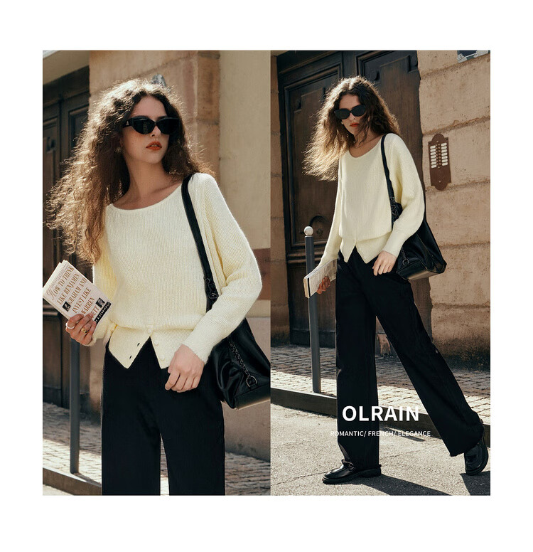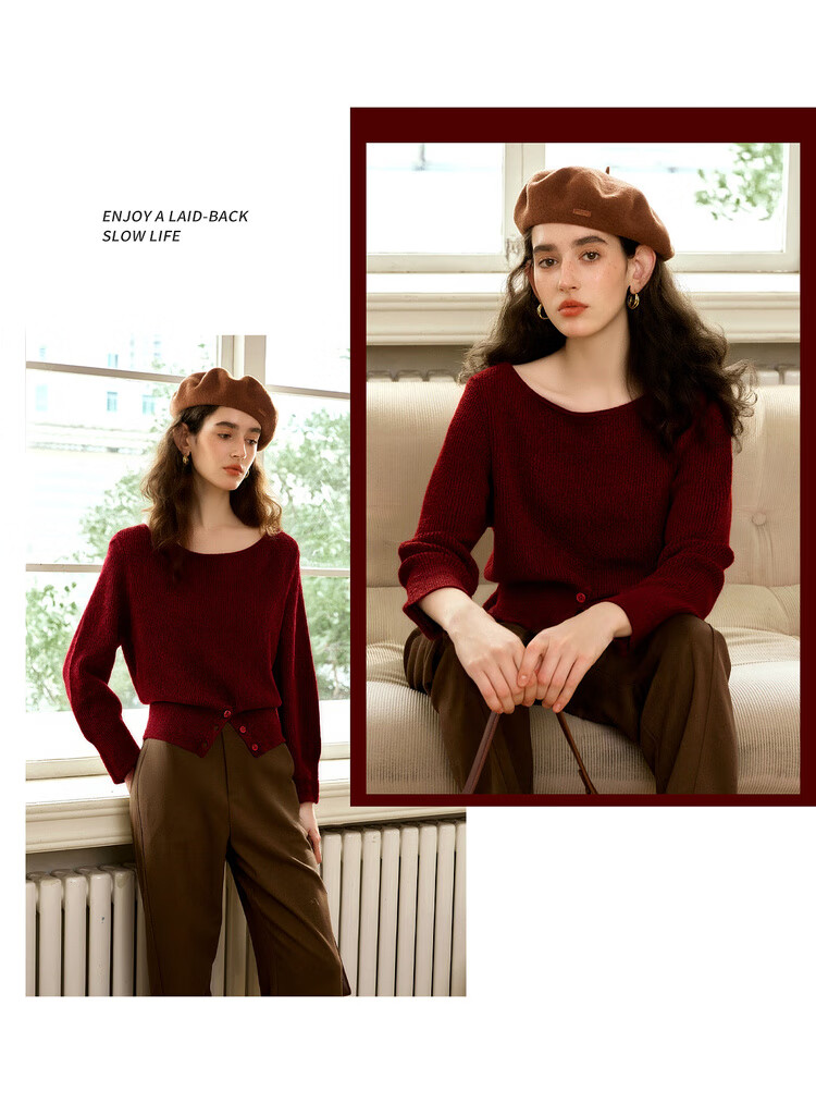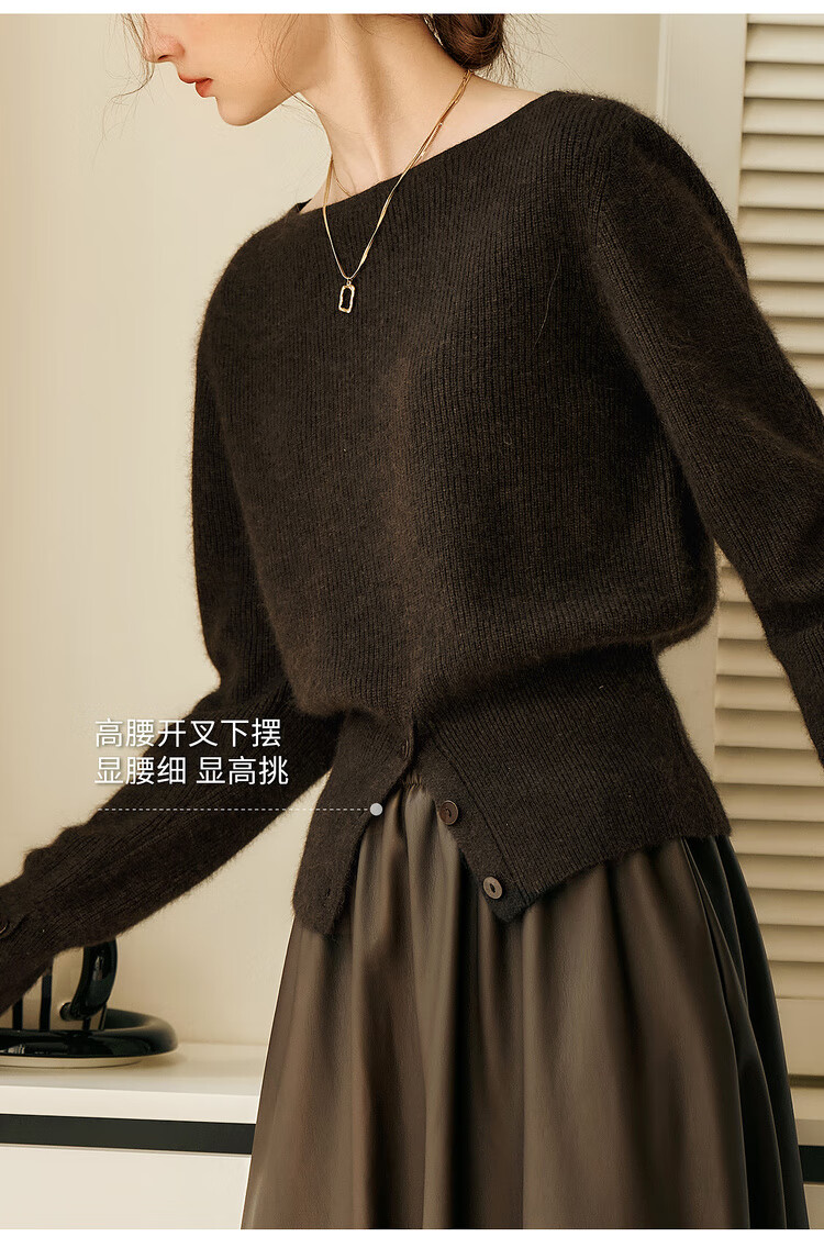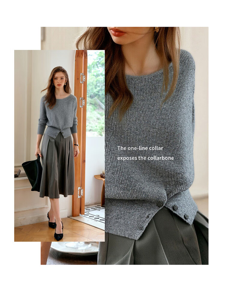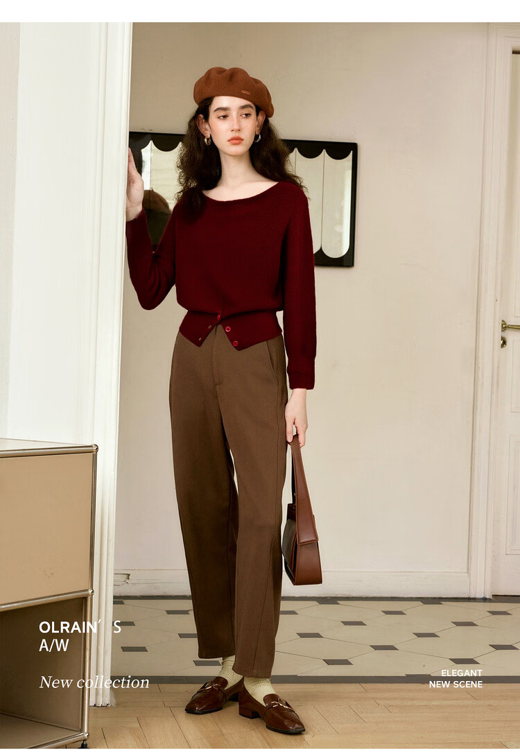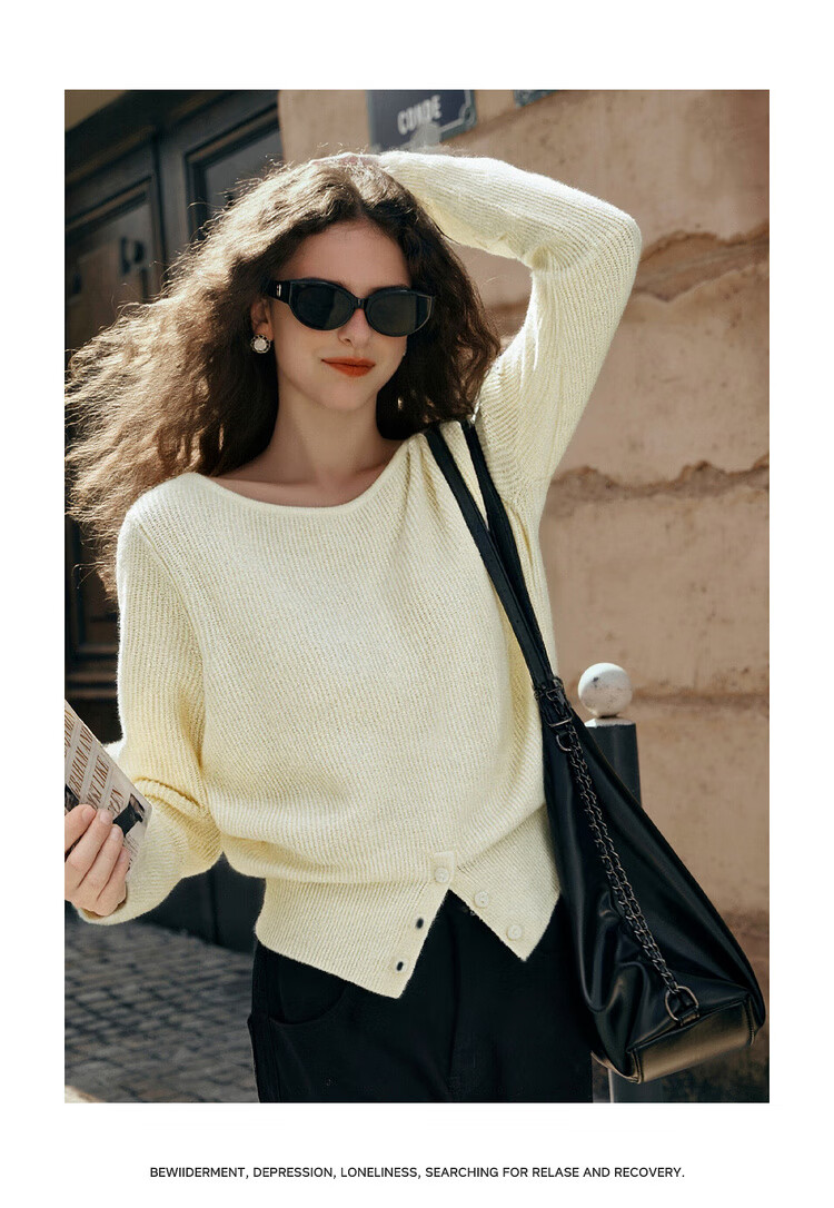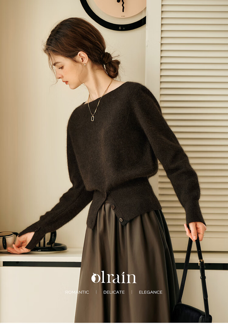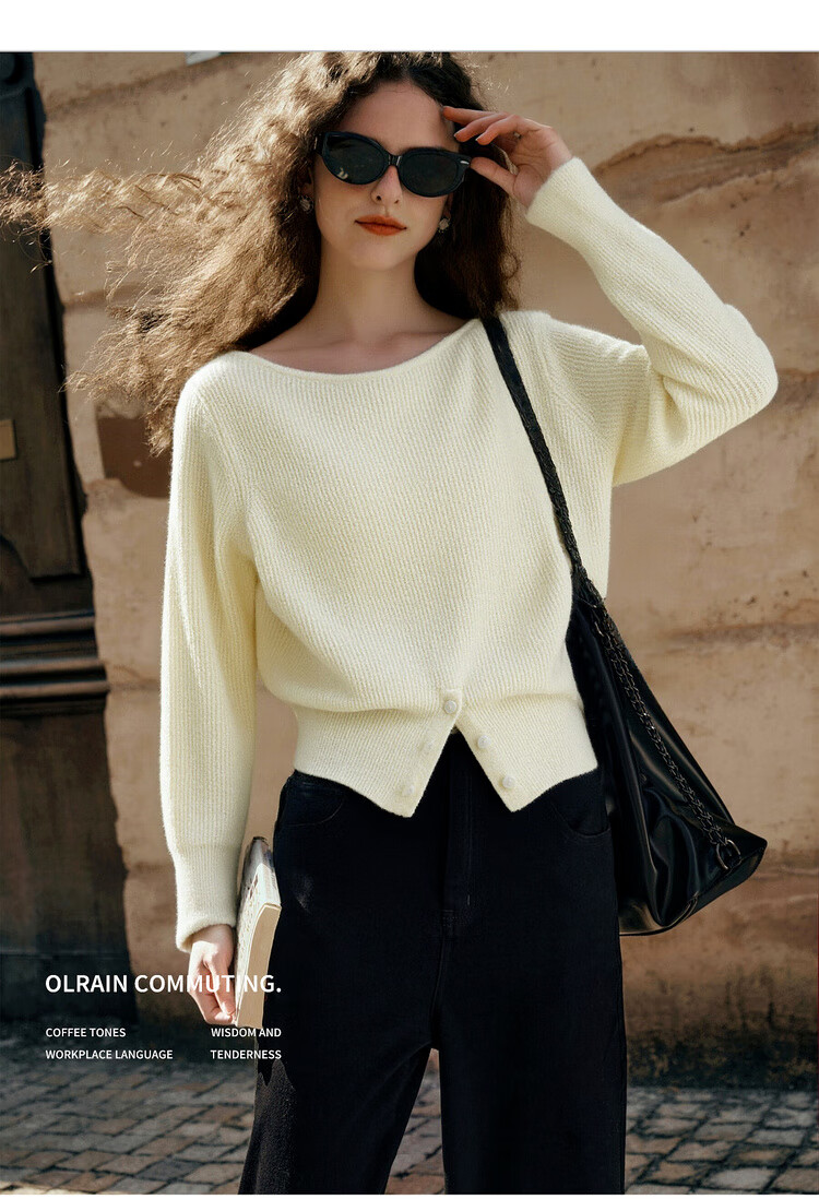 Olrain French one-neck sweater women's winter new slit hem waist pullover apricot S
