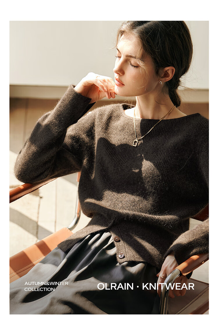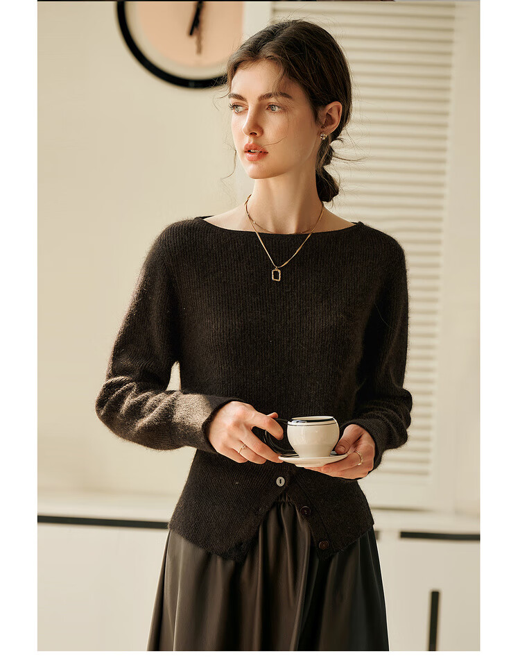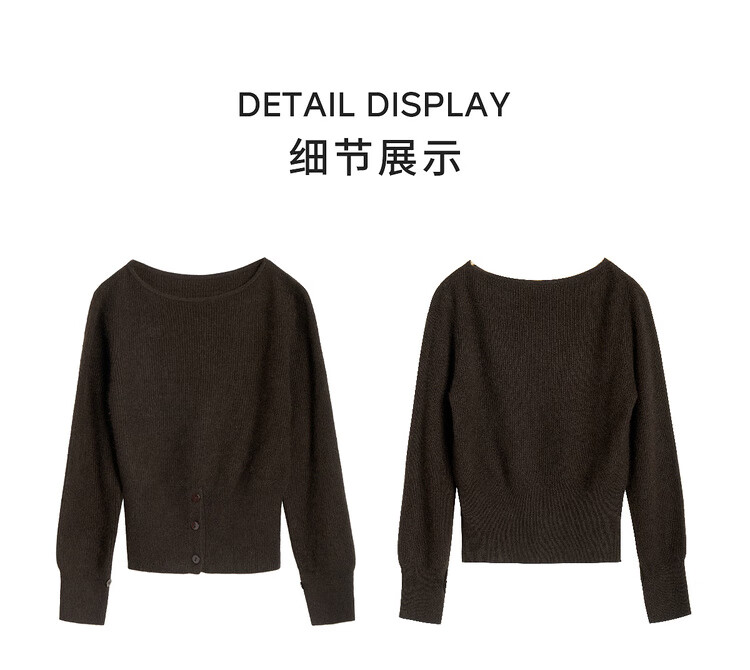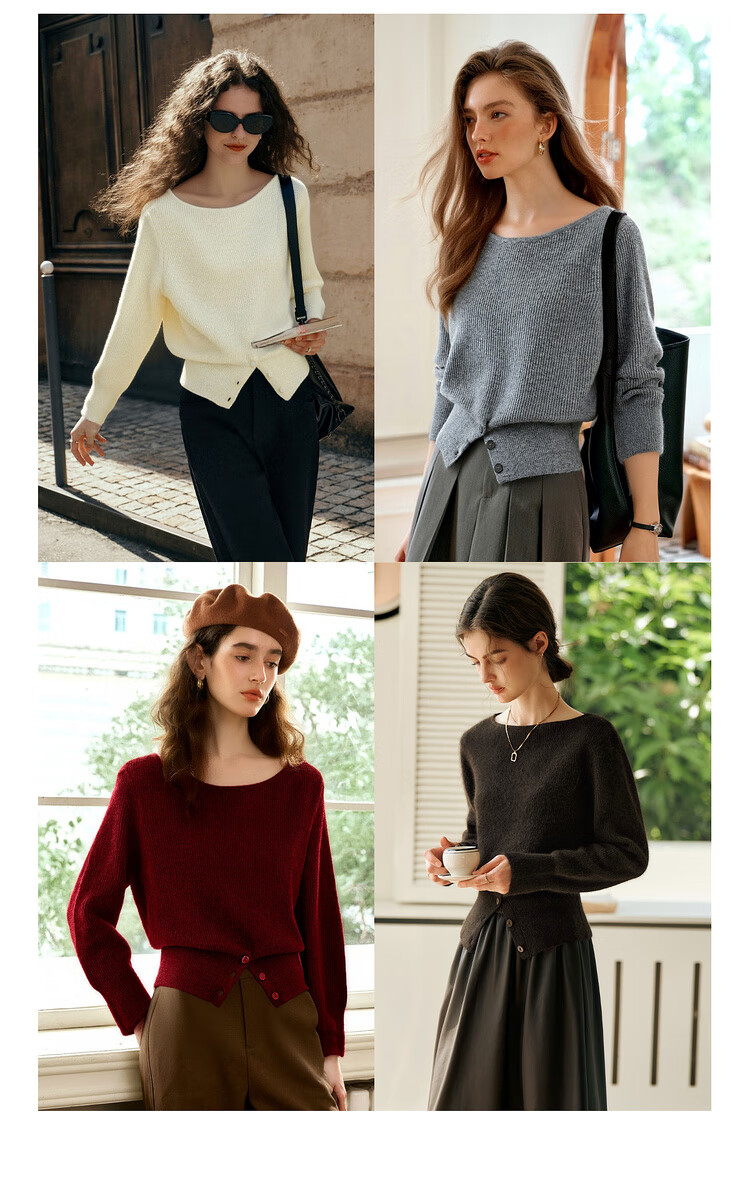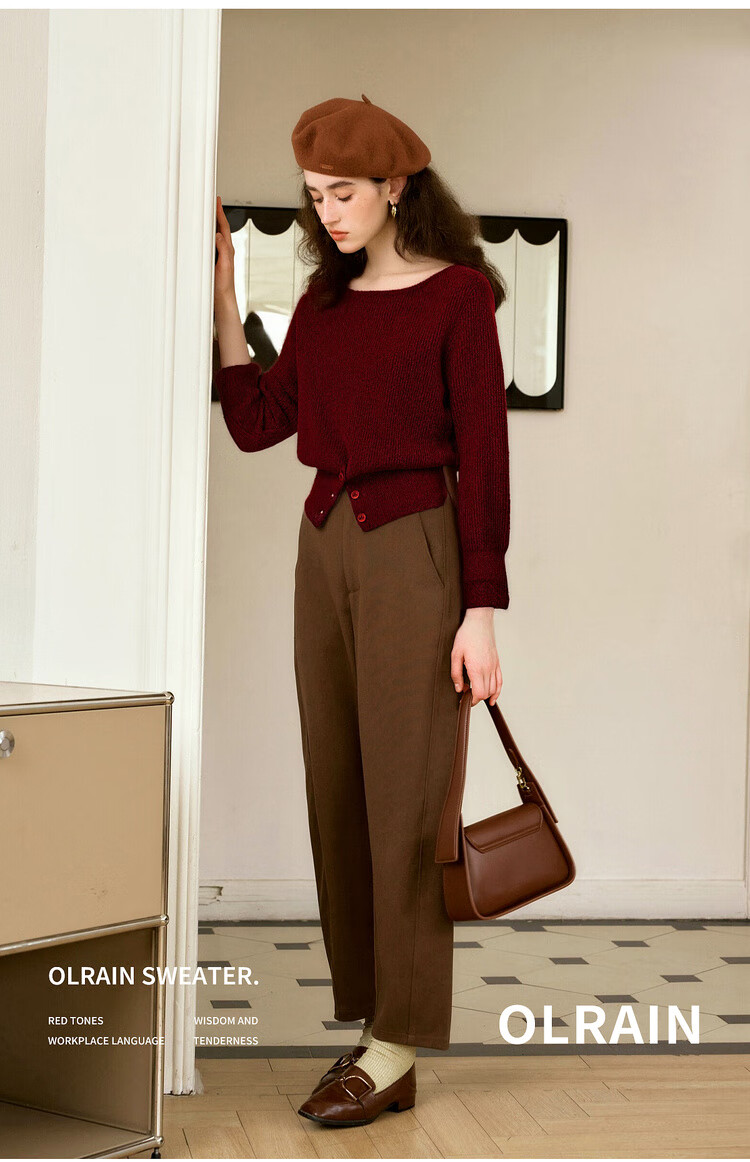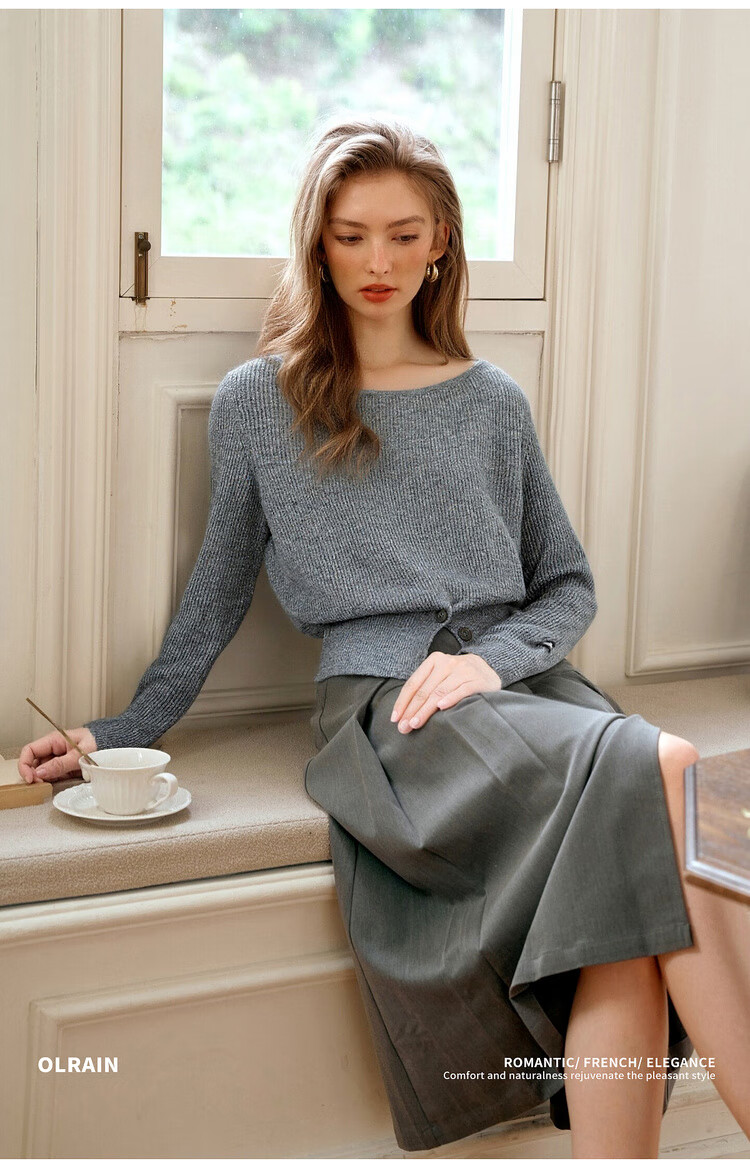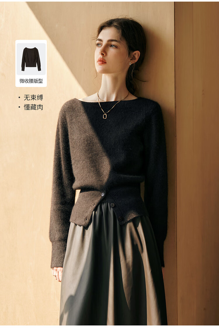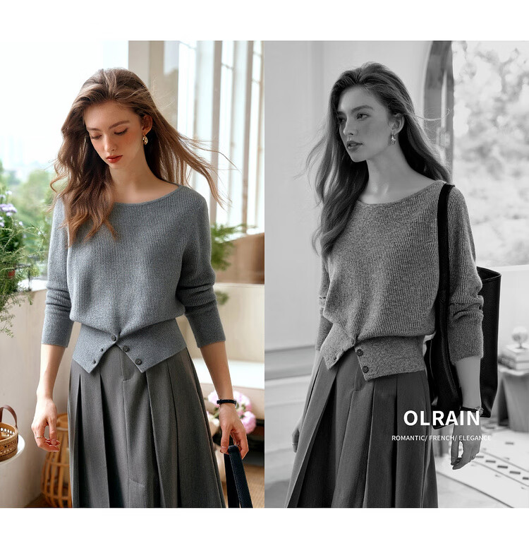 Olrain French one-neck sweater women's winter new slit hem waist pullover apricot S