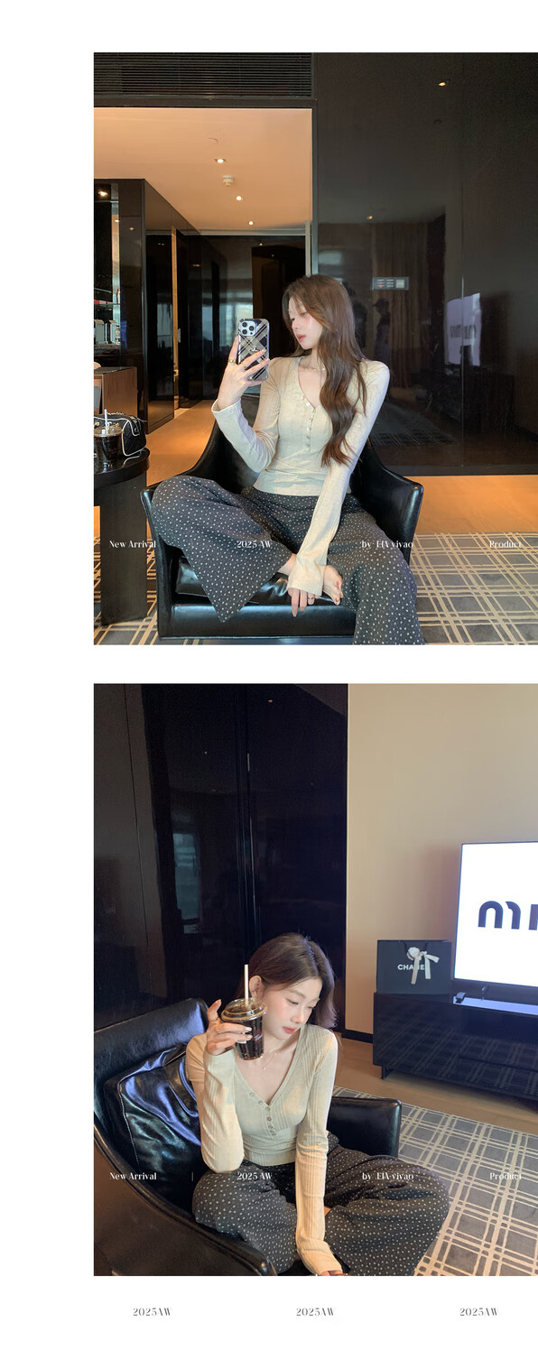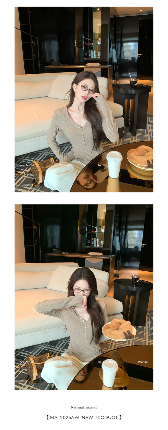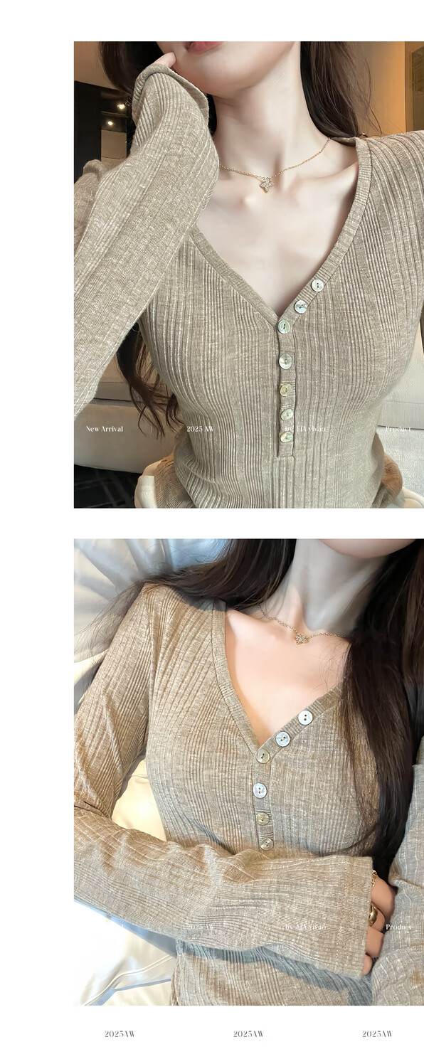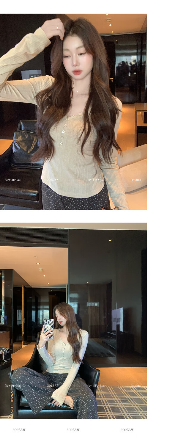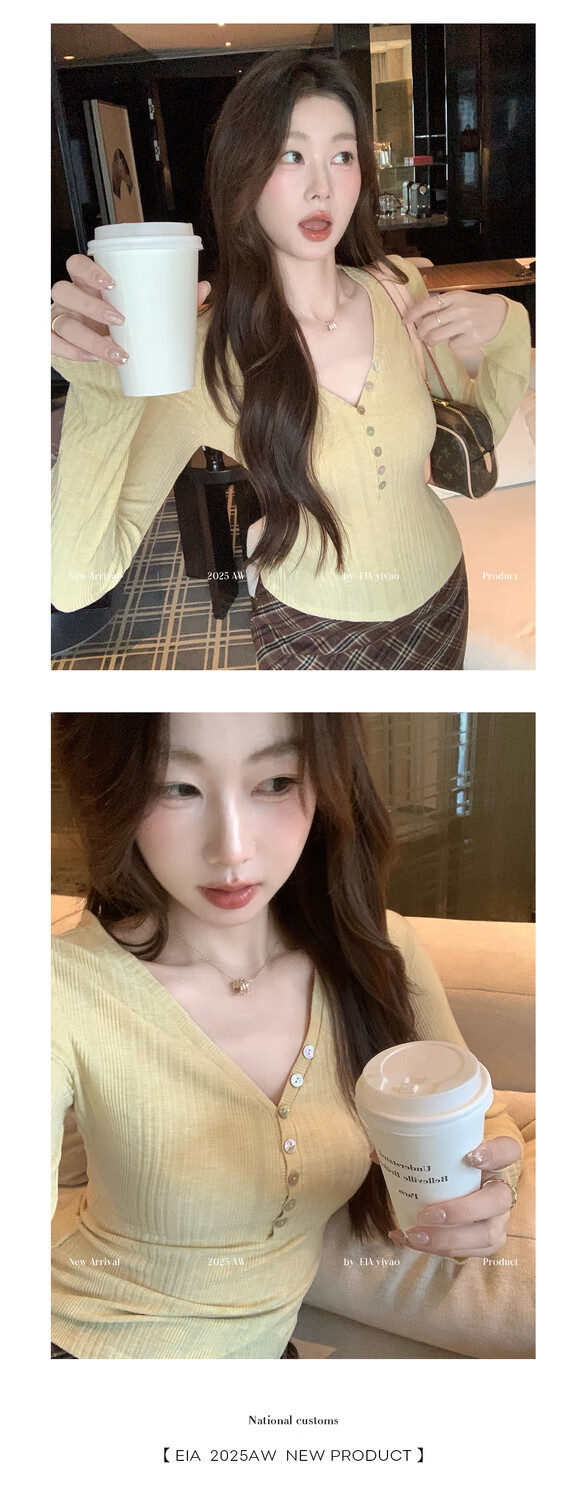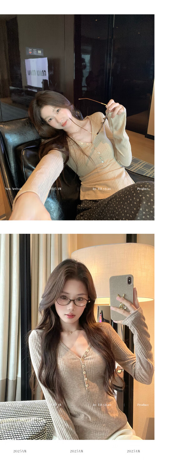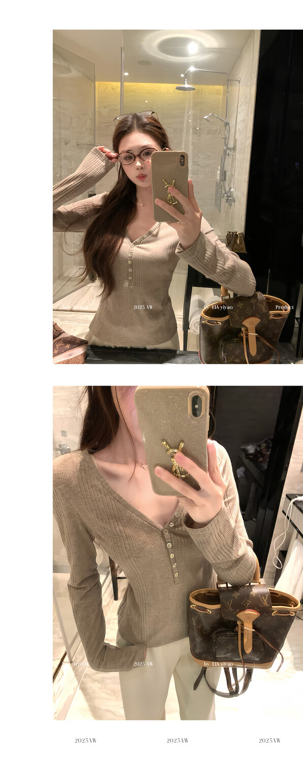 EIA Yiyao has a good figure both inside and outside. V-neck sweater for women in autumn and winter. Korean style slim long-sleeved top. Oatmeal color top. Medium and high elasticity. S. 85Jin Jin is equal to 0.5kg. 100Jin Jin is equal to 0.5kg. Yiyao wears size S.