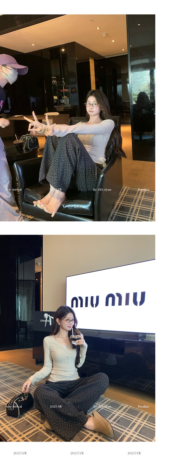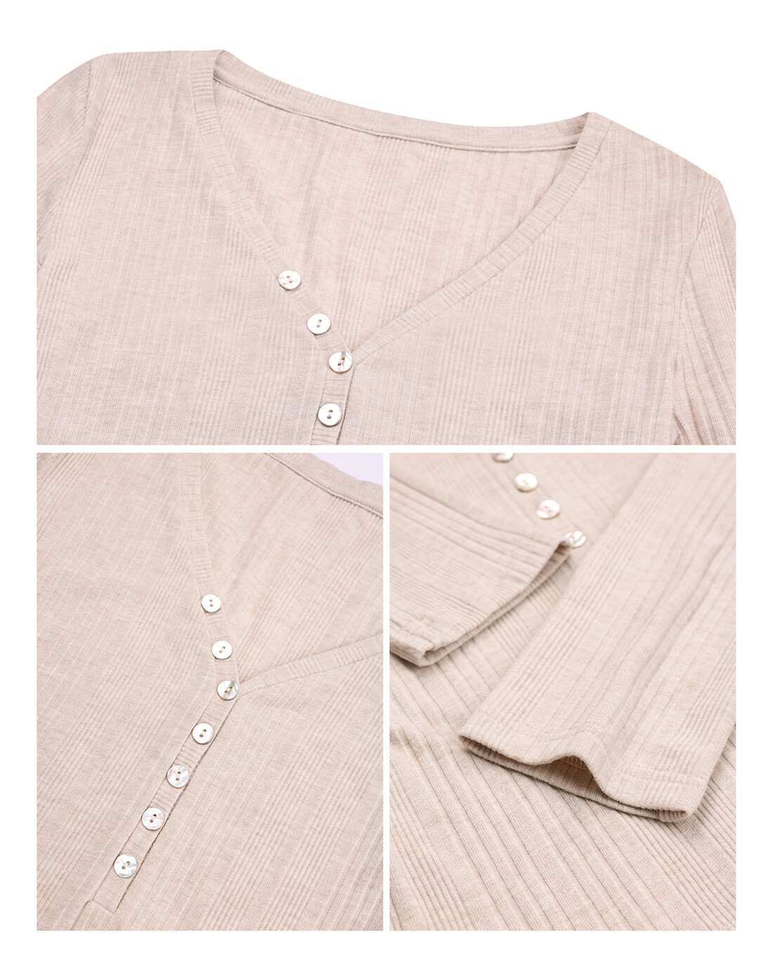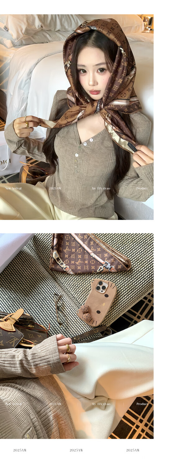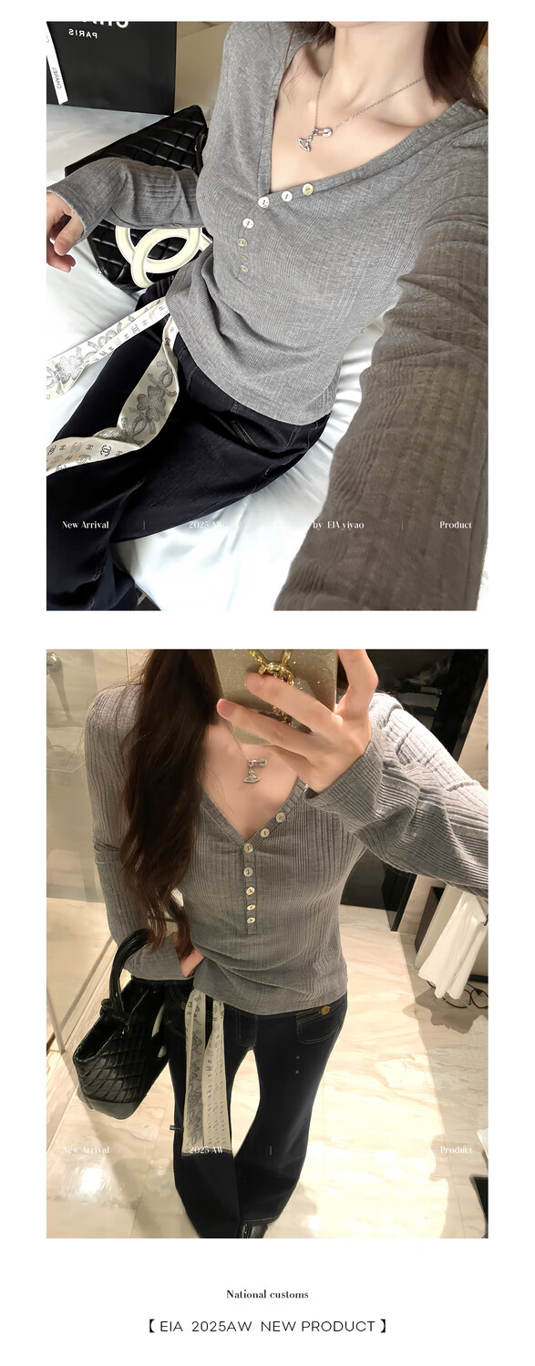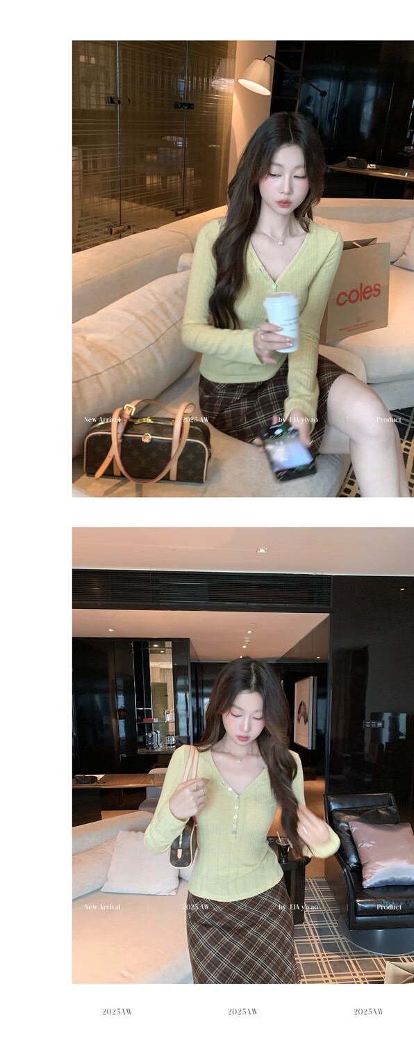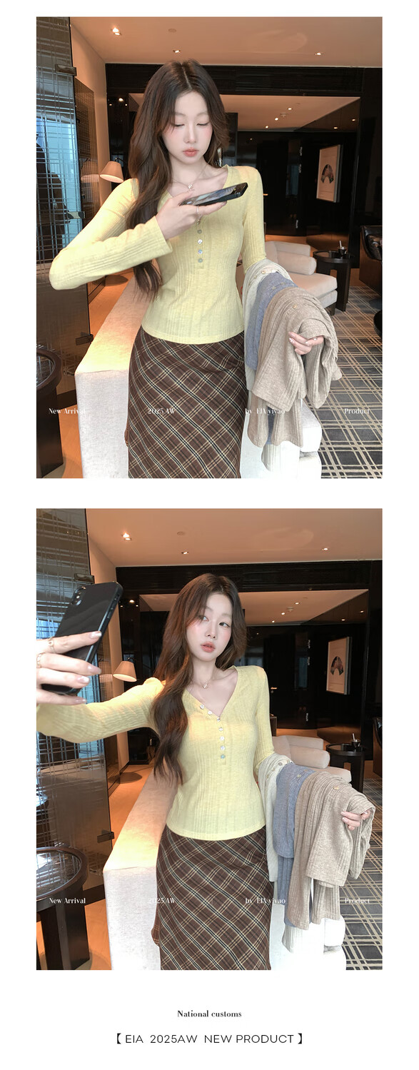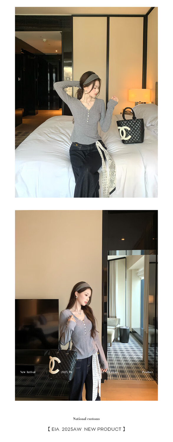 EIA Yiyao has a good figure both inside and outside. V-neck sweater for women in autumn and winter. Korean style slim long-sleeved top. Oatmeal color top. Medium and high elasticity. S. 85Jin Jin is equal to 0.5kg. 100Jin Jin is equal to 0.5kg. Yiyao wears size S.