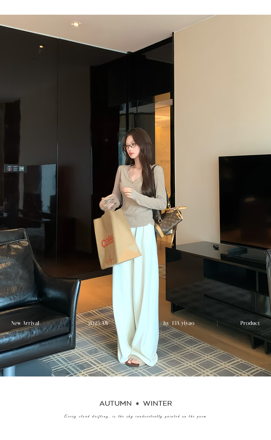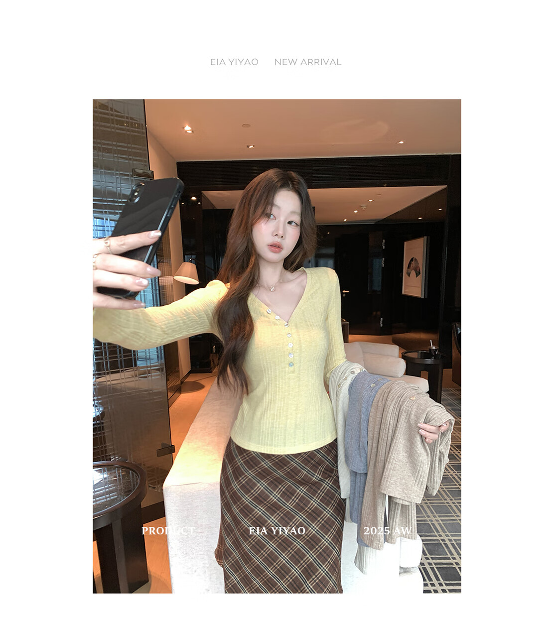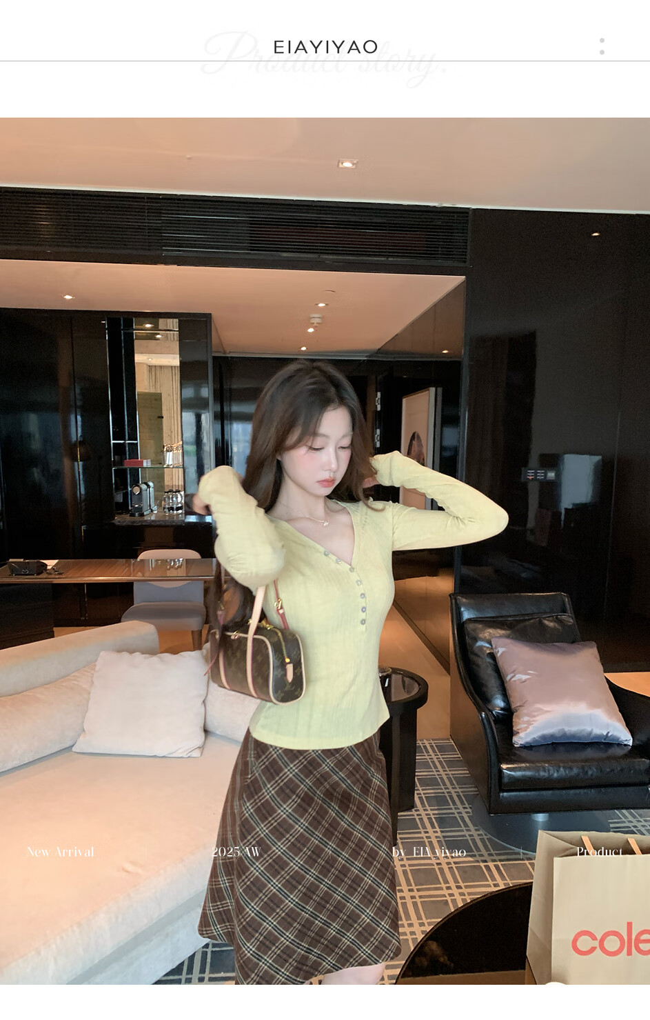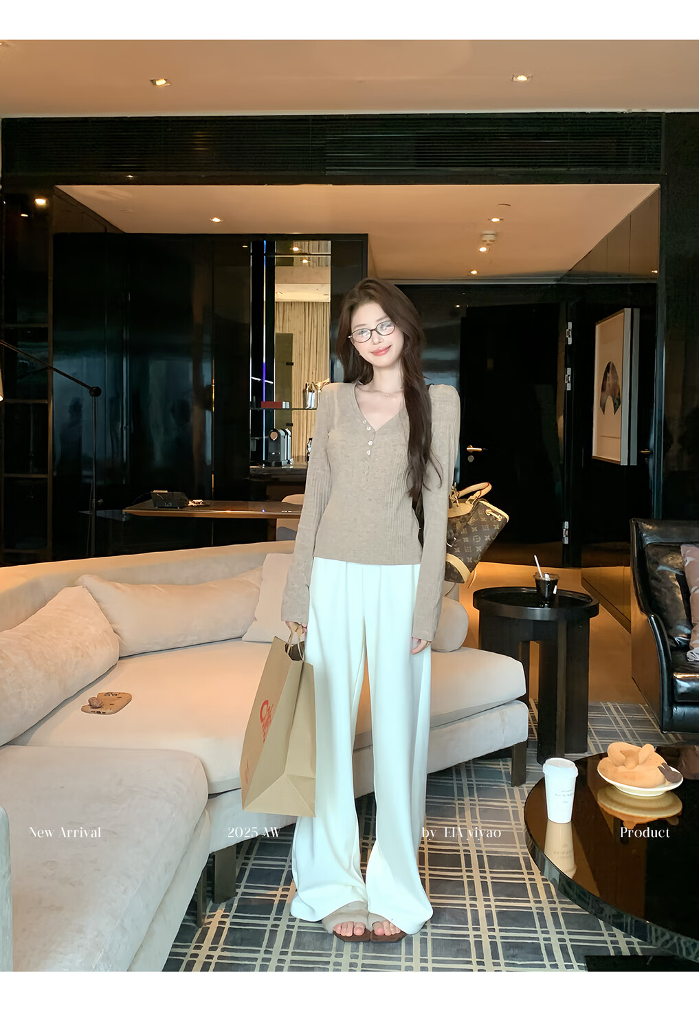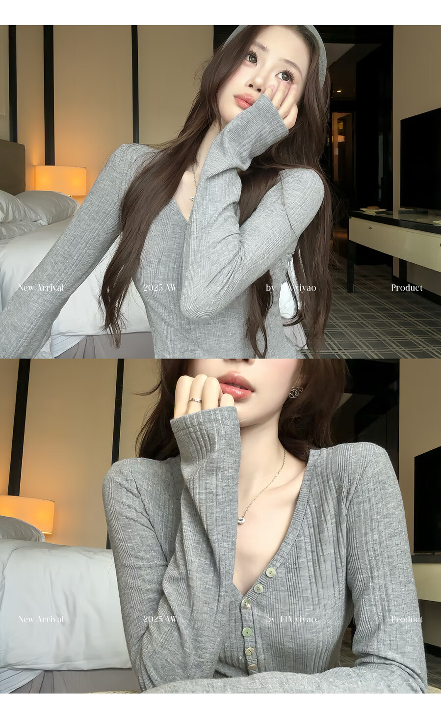 EIA Yiyao has a good figure both inside and outside. V-neck sweater for women in autumn and winter. Korean style slim long-sleeved top. Oatmeal color top. Medium and high elasticity. S. 85Jin Jin is equal to 0.5kg. 100Jin Jin is equal to 0.5kg. Yiyao wears size S.