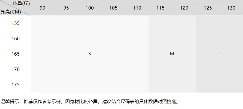 China (cm) 160-165/84-86 165-170 / 88-90 167-172 / 92-96 168-173 / 98-102 170-176 / 106-110