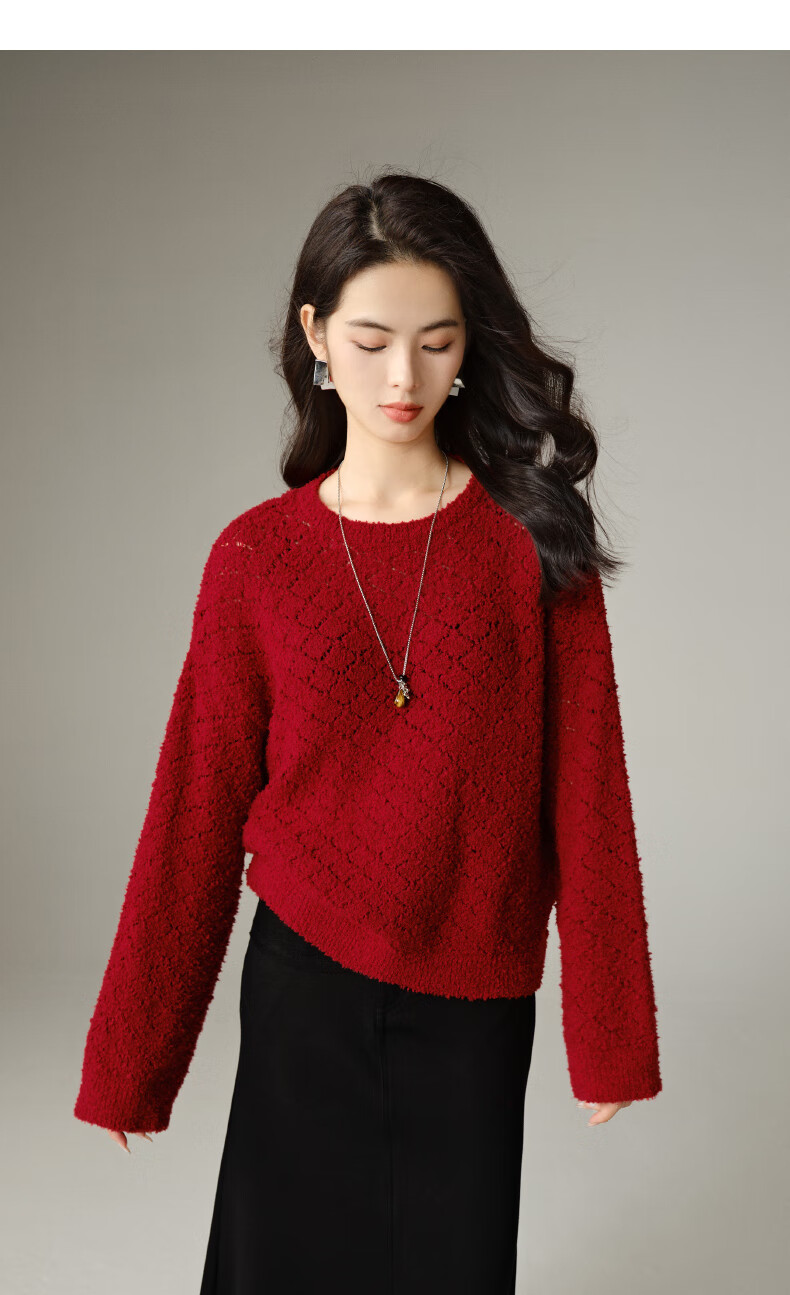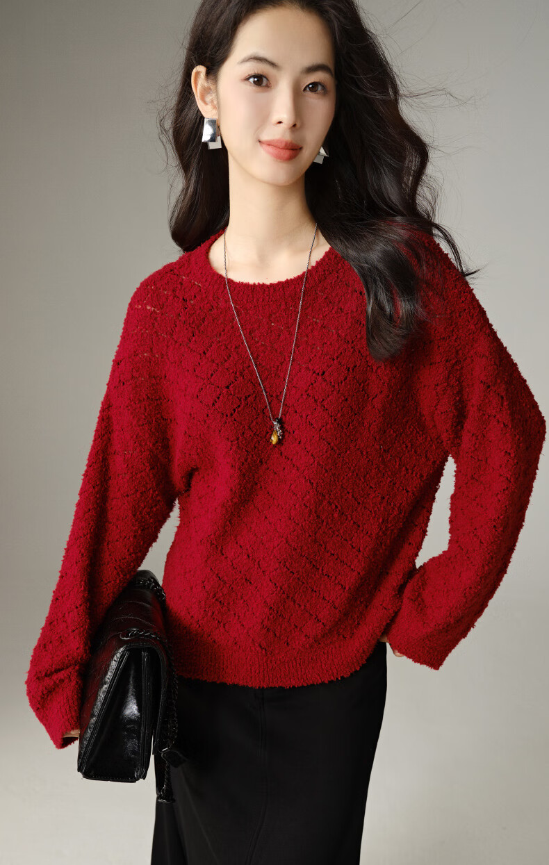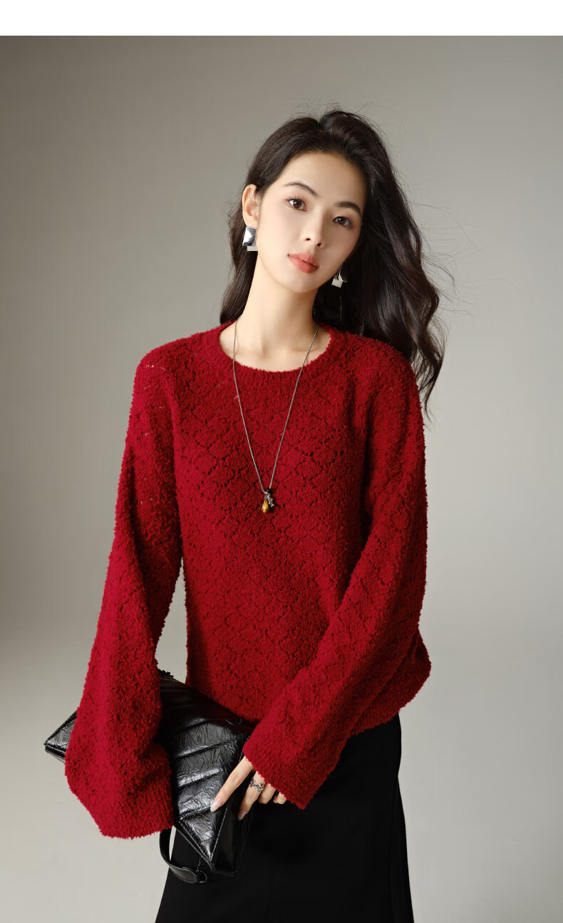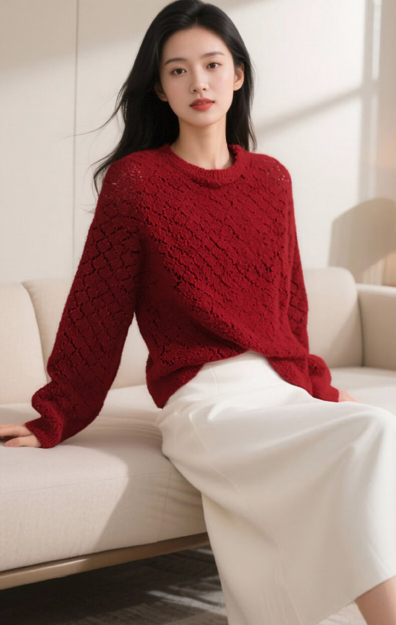 Late White New Product 2025 Autumn Fashionable and Versatile Chinese Red Sweater Solid Color Pullover Sweater Women Red S